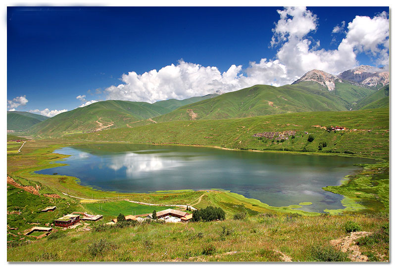 从甘孜县出发抵新路海。湖的西南是雀儿山,山口处会见到一块“川藏第一高,川藏第一险”的标志牌,这是危险路段,开车需小心。