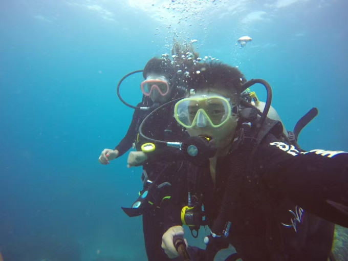 ”从那之后每次入水耳压平衡都做的很顺利,在水下也很放松,但就是自己的心理压力总是会担心太多,比如呛水怎么办.调节器坏掉怎么办...这些没必要的担心导致我没有心情去看那些美丽的鱼和珊瑚,只是紧跟着教练看着教练脚蹼,有时游着游着还会超过教练,我永远不会忘记有次我游得太快超过了教练,何教练一转头吓了他一跳的那个惊讶的表情哈哈哈