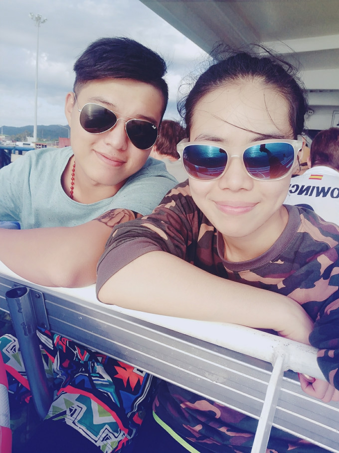在船上,男票为了缓解我的紧张和我搞笑自拍
