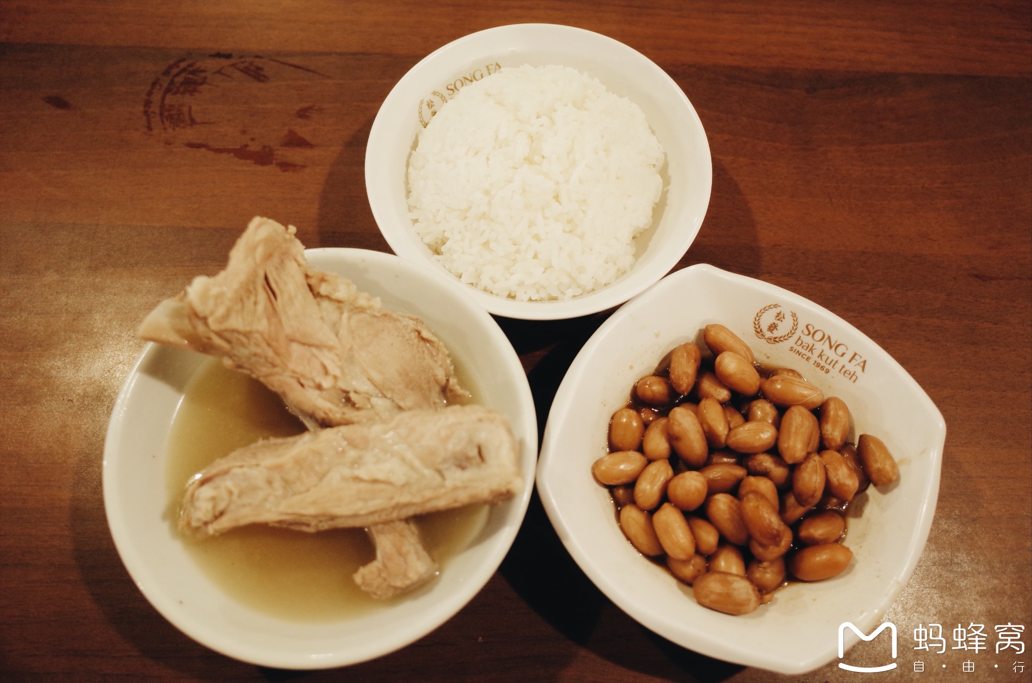肉骨茶是用猪骨和一些常用的中药,配以家传香料偏方,如丁香、肉桂、八角、茴香以及芫荽等一起熬制而成的汤,选用上等的包着厚厚瘦肉的新鲜猪排骨,将其煮熟煮烂。因为有一些胡椒的成分所以很下饭,配一份花生也别有一番味道!松发的花生不是那种脆脆的,也是煮烂的口感,所以吃起来和一般的不太一样!