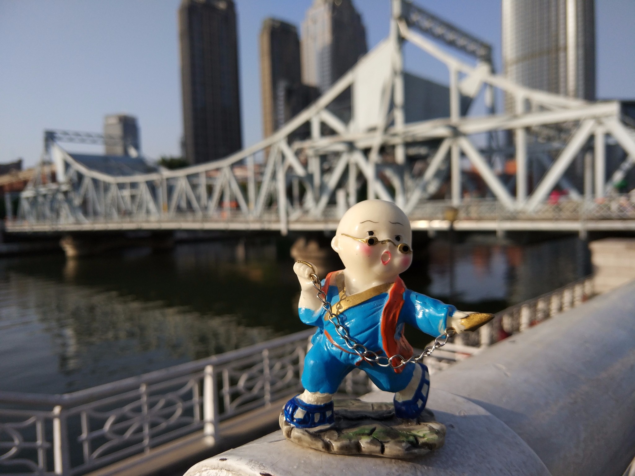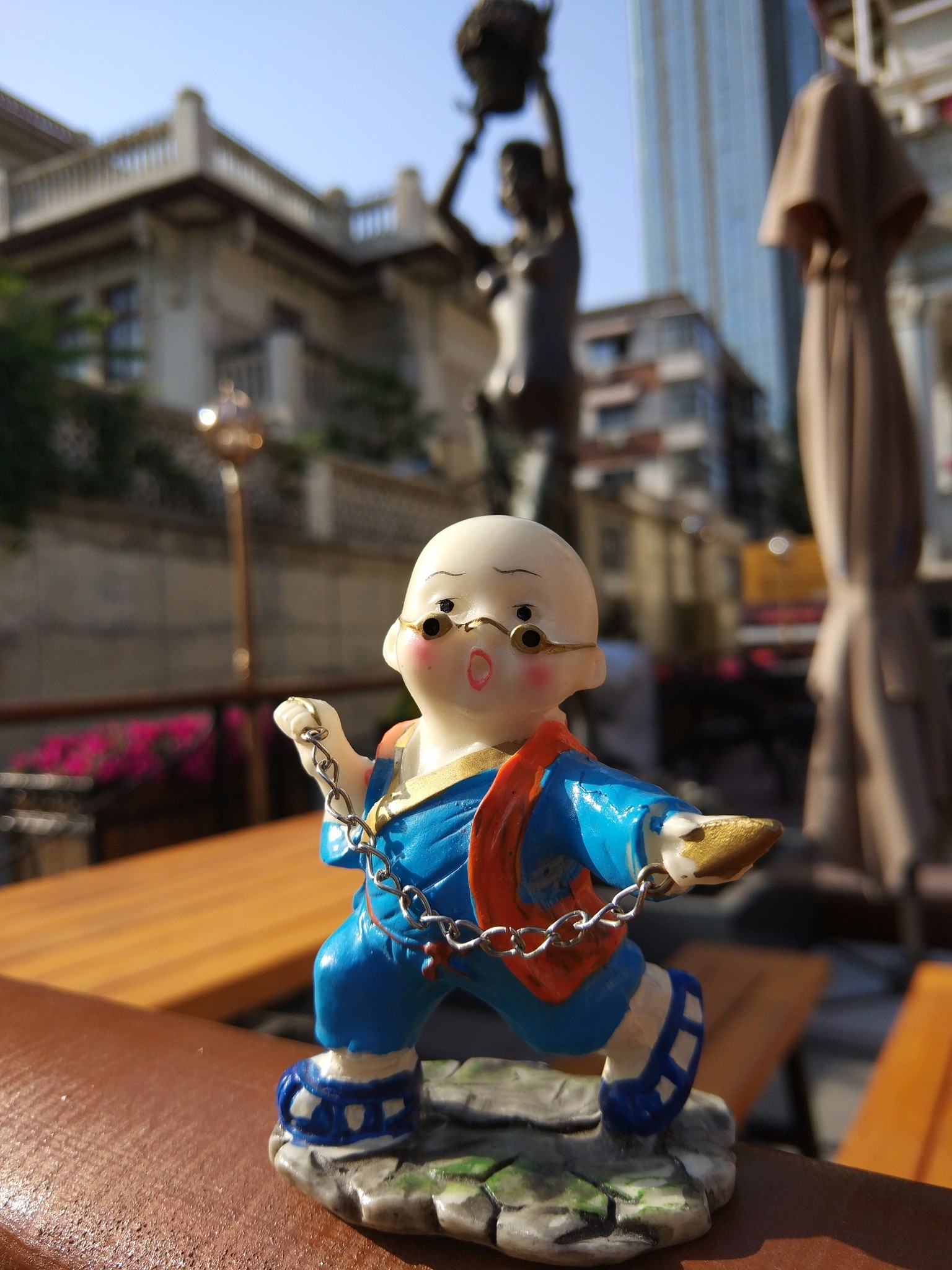 这是朋友送给我的,只带着去了一趟天津。在9月份去北京的时候被游人碰到地上,小和尚的胳膊摔断了,由于当时人太多,没有找到残肢,现在已经不完整了。不过我还是很喜欢,现在它安静的待在家里了。