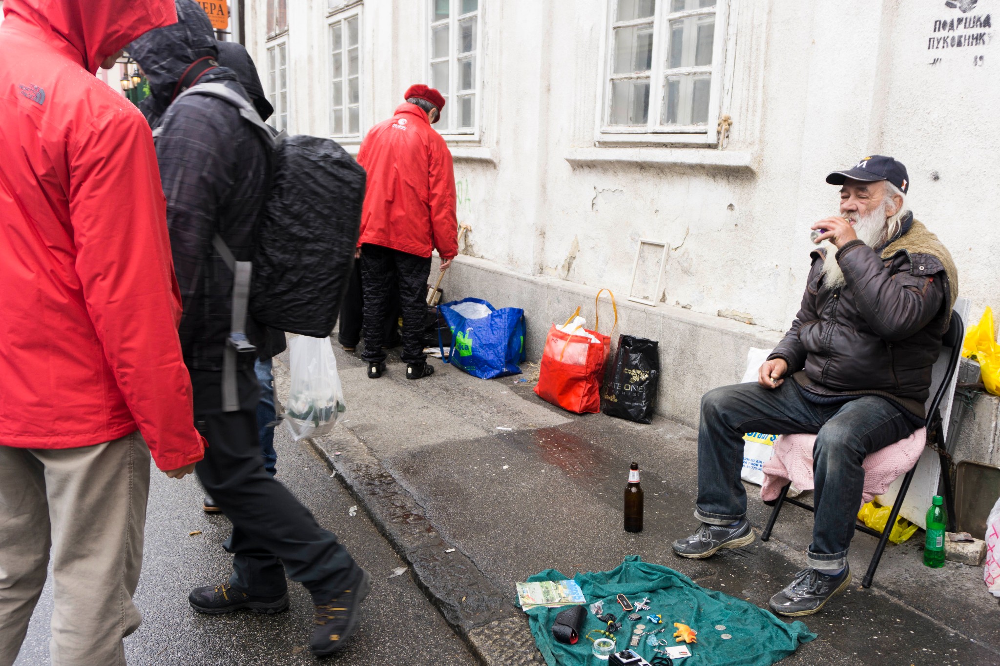 花园旁是热闹的跳蚤集市,各类奇奇怪怪的二手货被摆放在垫子上,酷酷的爷爷边喝着老酒,边守着自己的小摊。