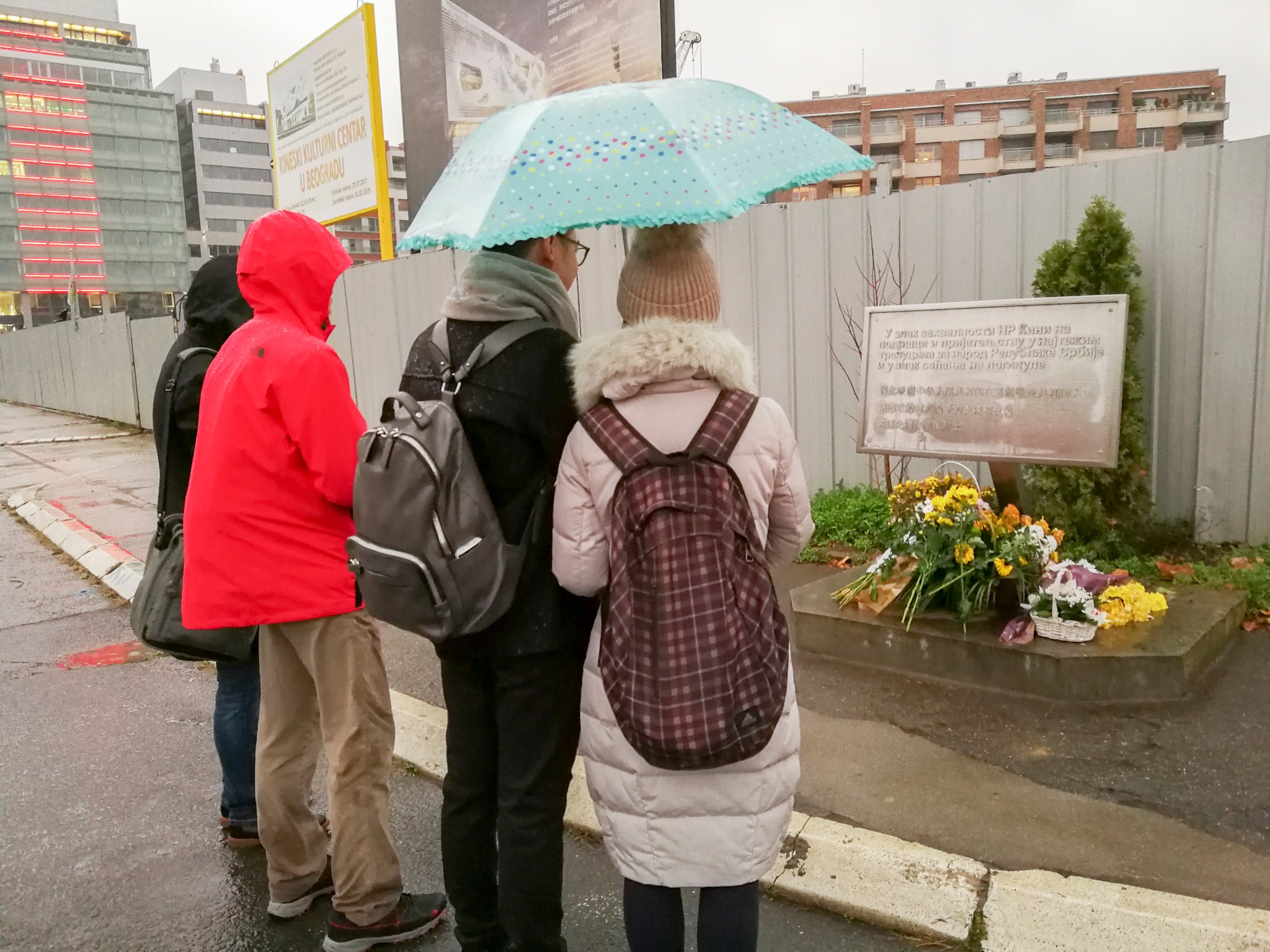 那天陪着金荣去找北约轰炸的中国大使馆遗址,距离泽蒙不远,但寻找的路程很艰辛,雨越下越大,地面泥泞,鞋子都进了水。幸好找到了,没有浪费金荣特意买的花篮。跟着杉喊的节奏,大家面向纪念碑一起鞠了三躬,金荣又流下了泪水,这是他当天第二次流泪了,人太感性到底是好还是不好呢。
