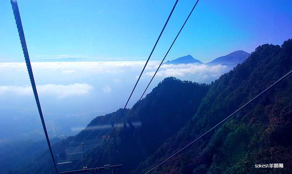 我们顺利的上了缆车, 我才松下一口气。坐索道时云雾缭绕,到山上时豁然开朗,蓝天白云,巍峨壮观。