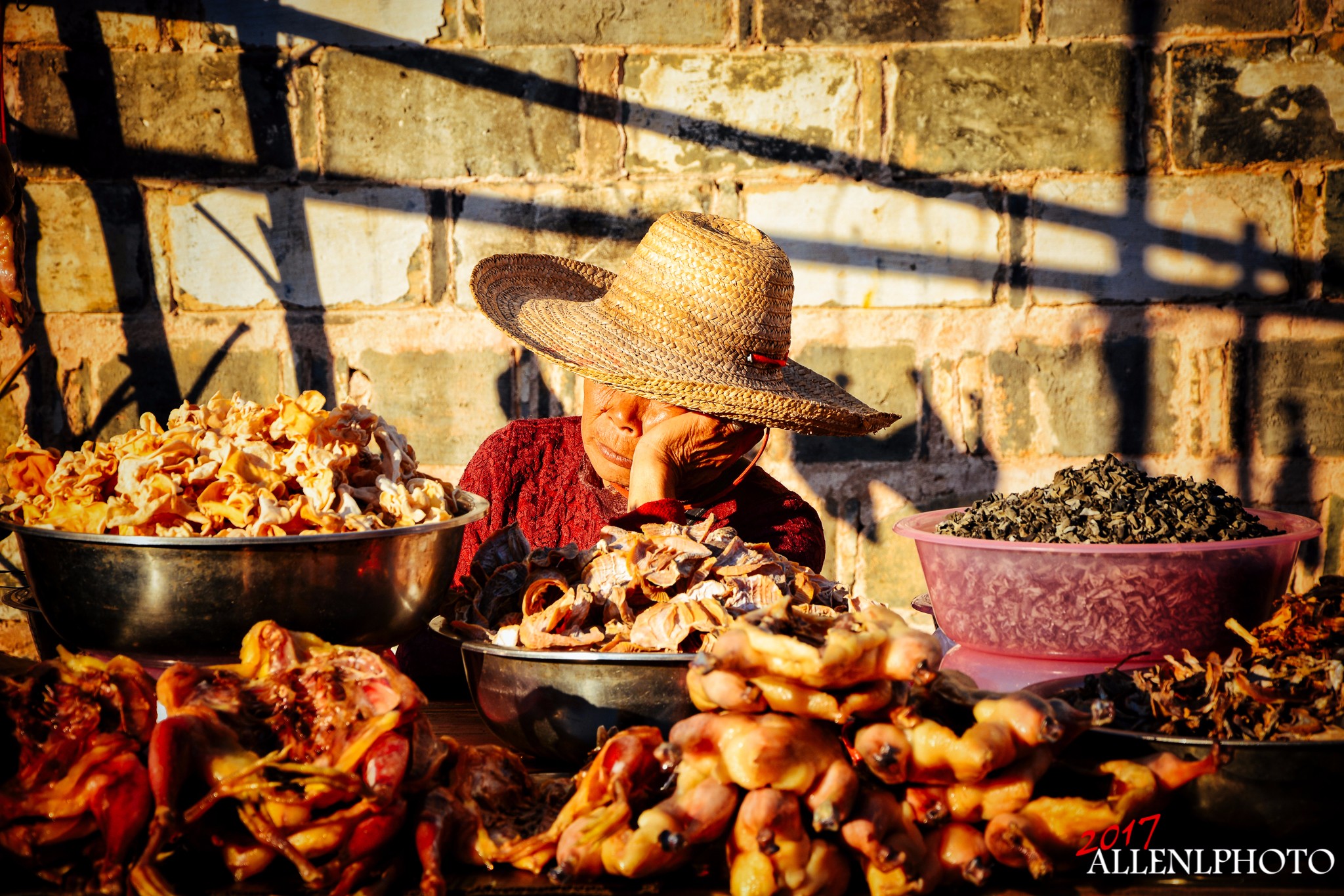 宏村月沼湖旁的小摊贩,趁着微微斜下的阳光,小憩一阵。