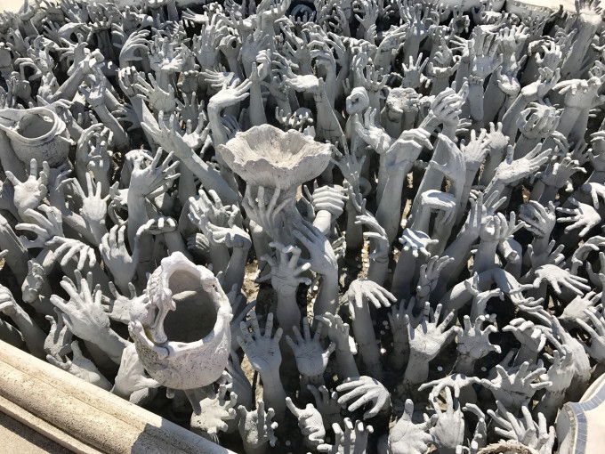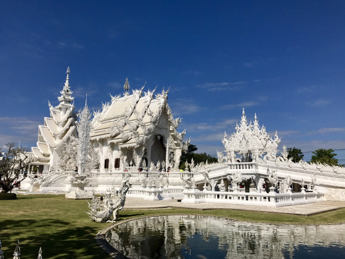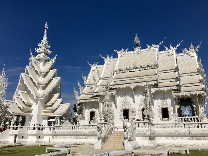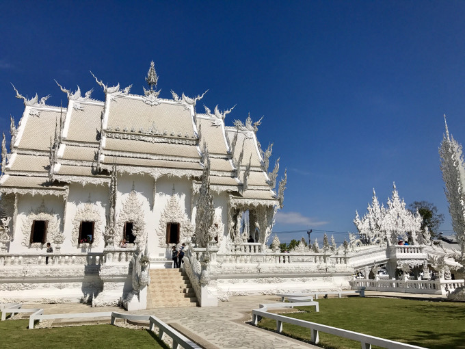 休整完上车,从清迈到清莱,大巴行驶两个小时左右。大巴停在了白庙附近的停车场,还没下车,就被白庙的景致震住了。