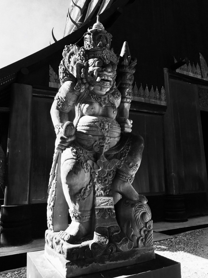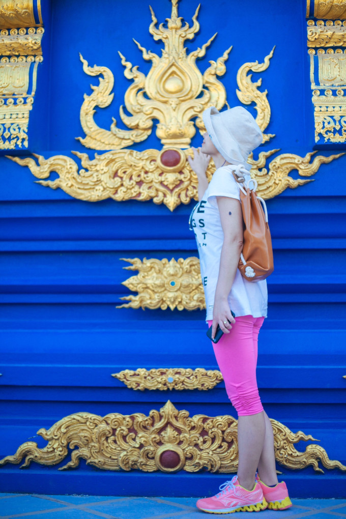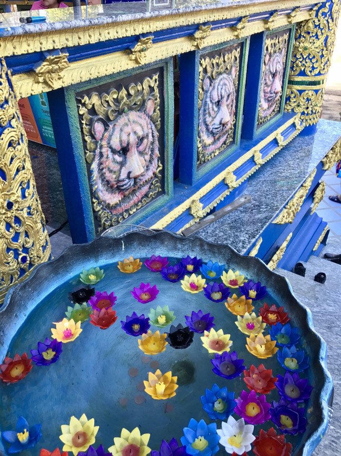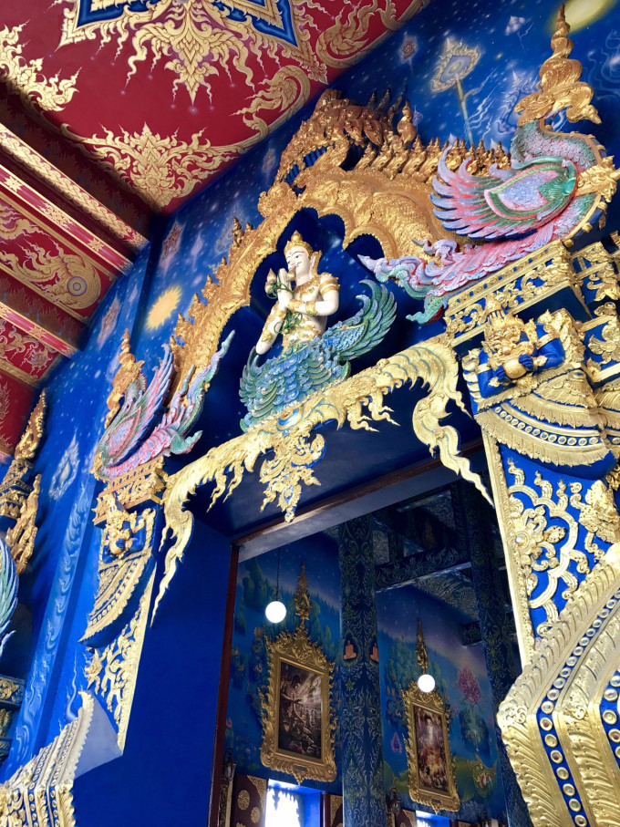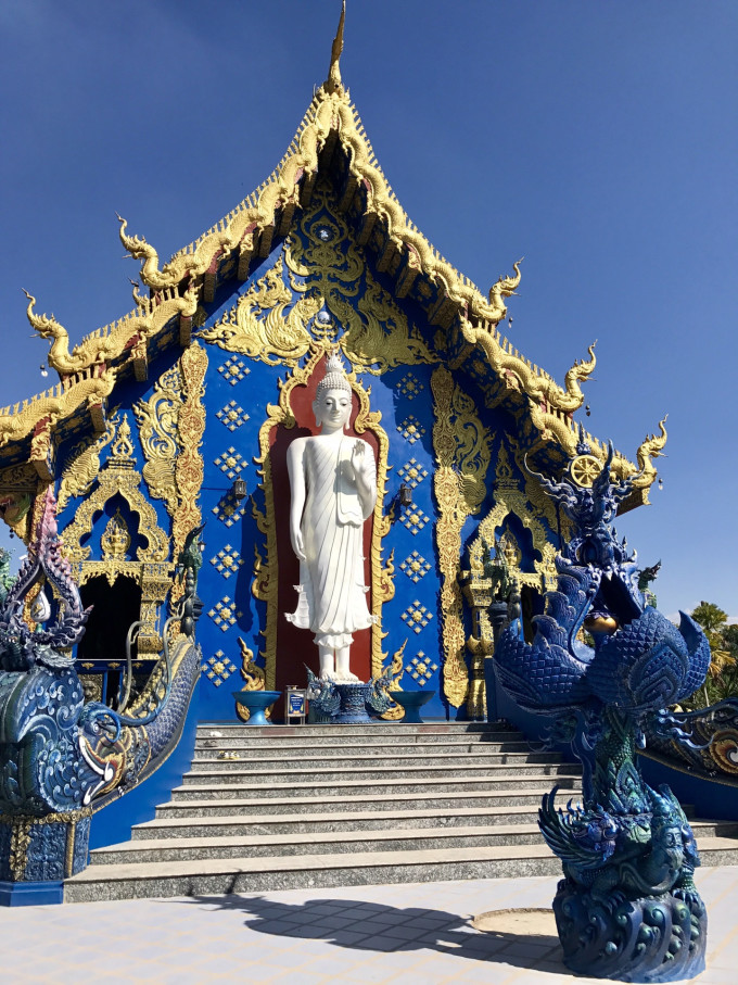 午餐后,大巴很快就到了蓝庙。听段PP介绍,蓝庙的设计建造者是建造白庙那位艺术家的助手。这些清莱的寺庙,大体是当代艺术家的潜心之作,更象一件艺术作品,没有繁冗的历史,也不需要导游做太多介绍,以轻松的心情观赏就行了。