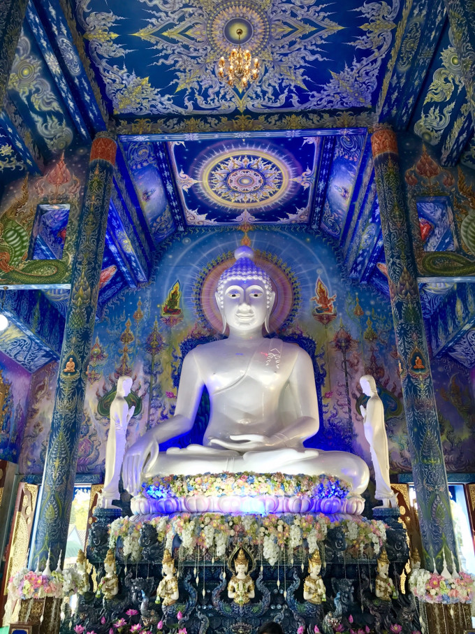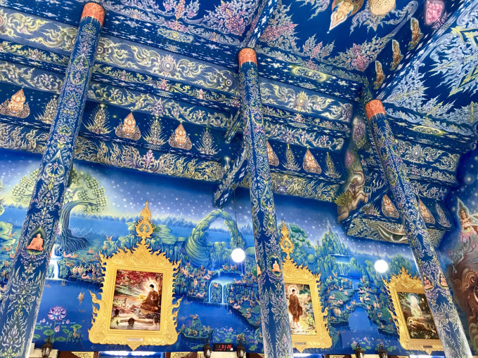 以蓝色为主搭配各色缤纷,艳丽而不艳俗,反而更能衬托出主殿白色大佛的温润如玉。