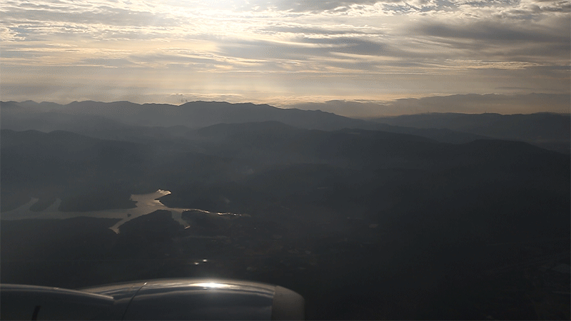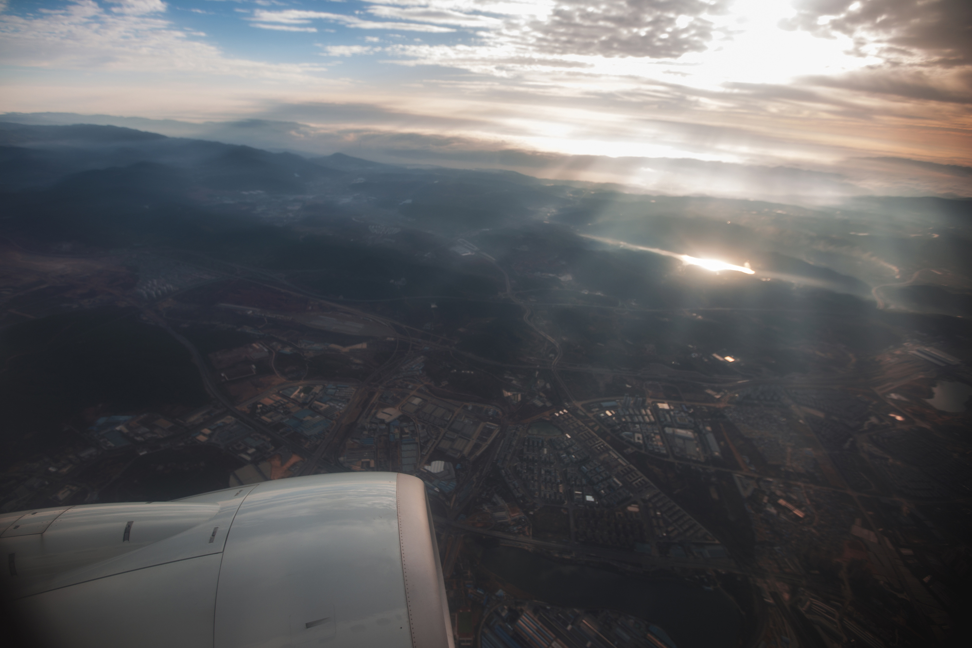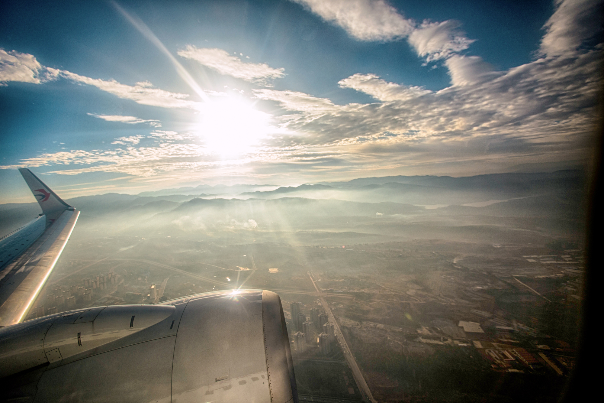 飞机还在上升阶段,阳光穿透云层,美得不要不要的。