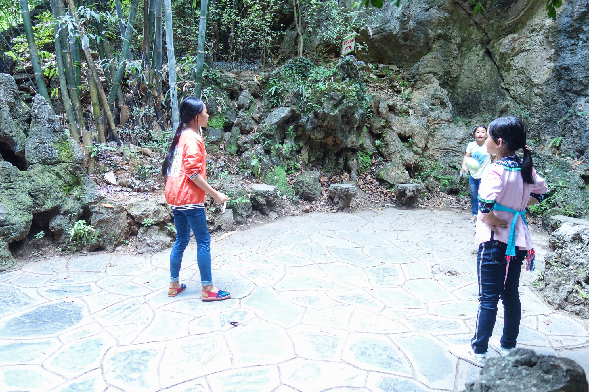 刚进天星桥景区,就看到一小片空地上几个小姑娘在玩丢沙包游戏。因为扔来扔去,怕影响到游客,被工作人员制止了。