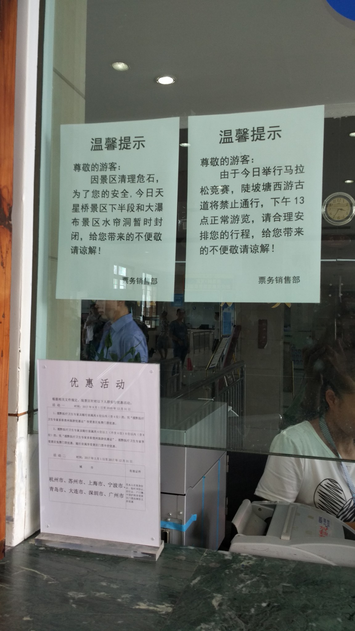 本来计划得很好,黄果树景区门票两天有效。今天下午正好错开高峰玩天星桥景区,明天上午玩大瀑布和陡坡塘。结果到了售票大厅,看到公告瞬间心拔凉拔凉的。