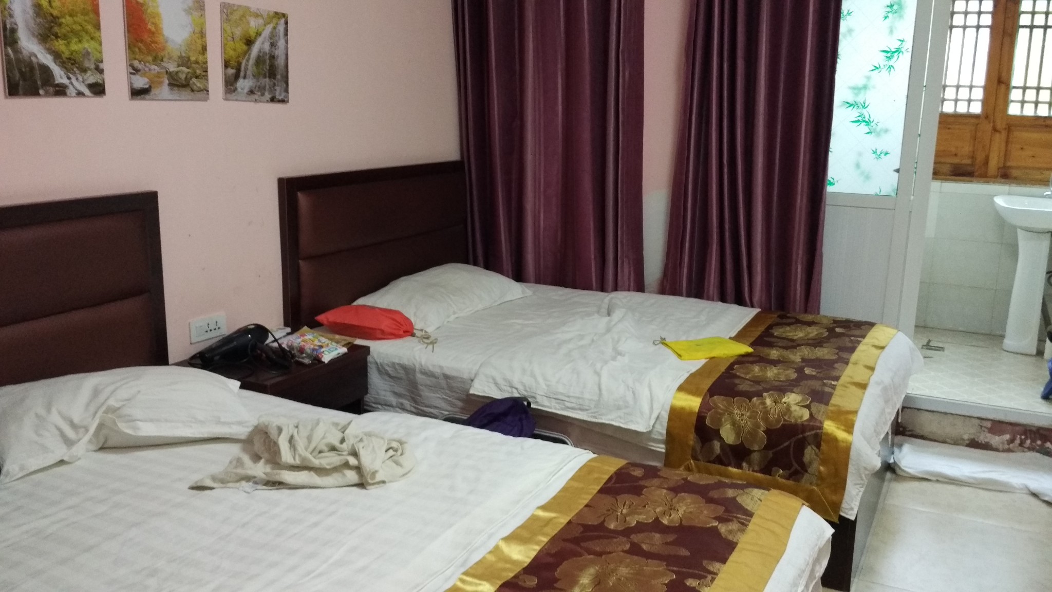 黄果树~利缘宾馆, 本来的计划是飞机到了安顺先去兴义的,后来临时决定先去黄果树,黄果树售票处对面一排全是家庭旅馆,随便找了一家,开价100,还到90,房间不大,有空调,还有台式电脑,虽然电脑根本用不了。被子床单有太阳晒过的味道,随便住一晚可以了,当然讲究的还是建议住安顺。