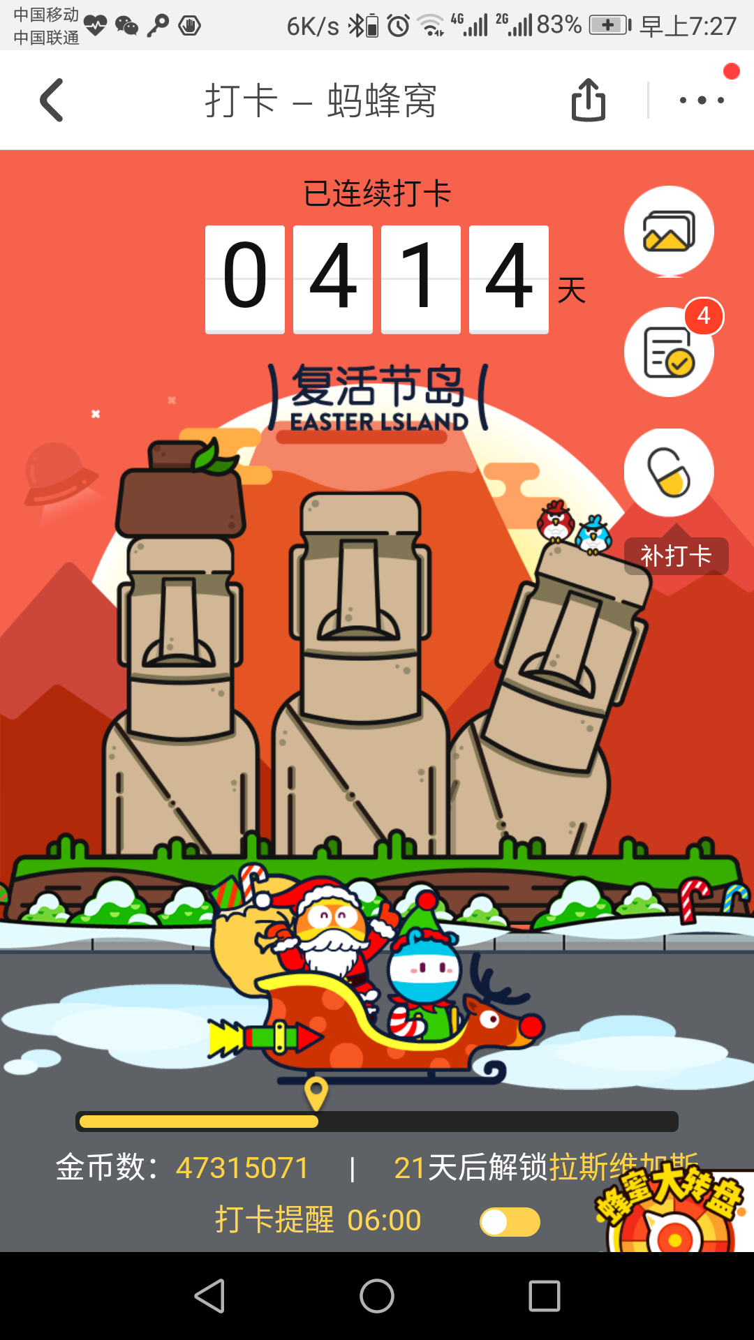,期间有二次打卡都300天以上了。因为出去玩,没及时打卡(特别是出境,由于时差和坐飞机,没办法打卡)。用救心丸都没用(只能一次)。记得过去在蚂蜂窝里每天打卡,到一定天数后是有蜂蜜奖励的,当时是我每天打卡的动力之一,蜂蜜是可以换东西的(我用蜂蜜还帮朋友换了个双肩包