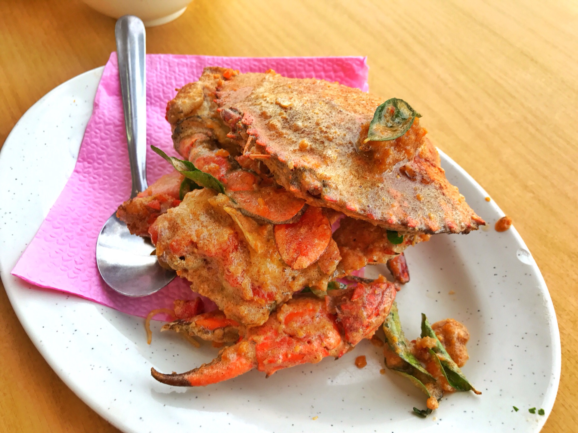 我们遵循肥妈的推荐,点了清蒸石头鱼,湿奶油赖尿虾,清炒了一种叫不上名的当地蔬菜,咸蛋黄焗膏蟹,蒜蓉粉丝蒸小扇贝,还要了一份炒粉,一杯橘子冰!一共129马币!折算人民币不到200块,是不是很便宜!