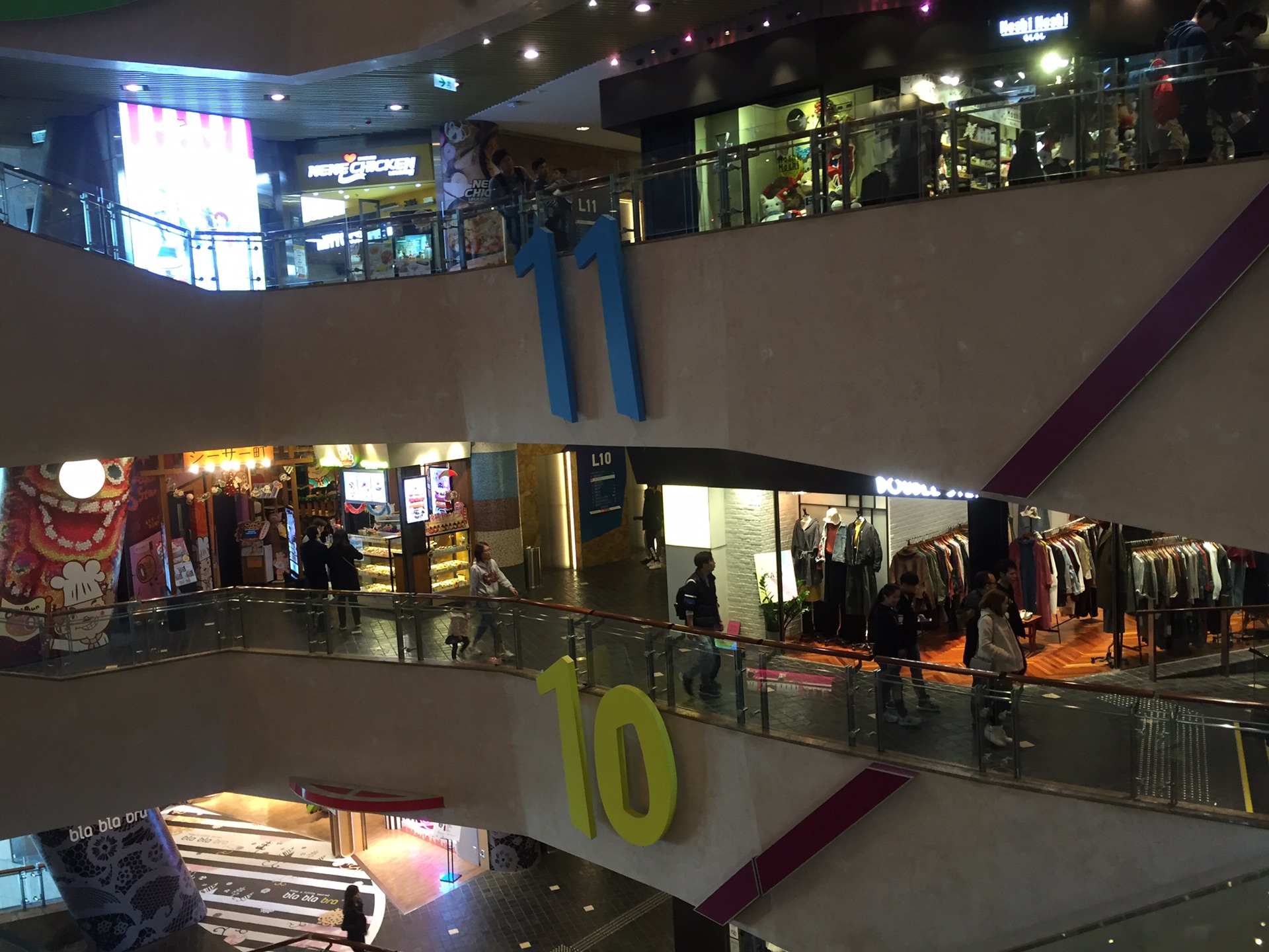 一条手扶梯直通到顶层,然后逛街就是标准的港式楼层停车场一样从上开始螺旋往下一圈一圈的逛直到一楼,吃喝玩乐购物应有尽有!点赞!