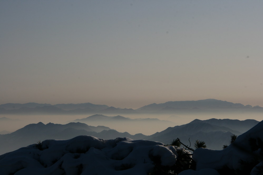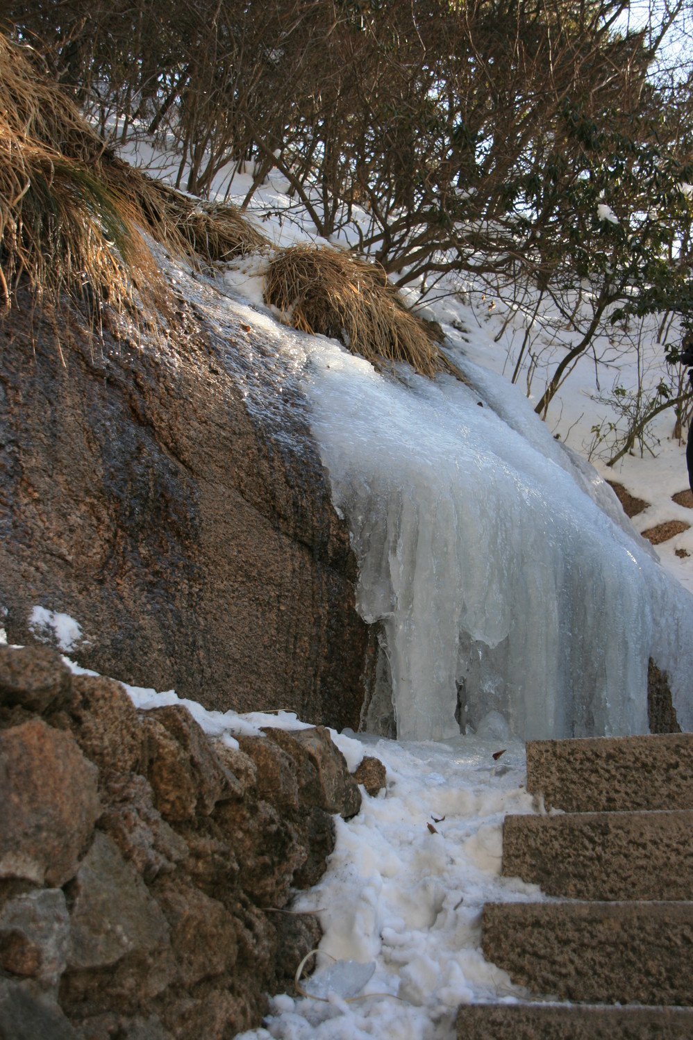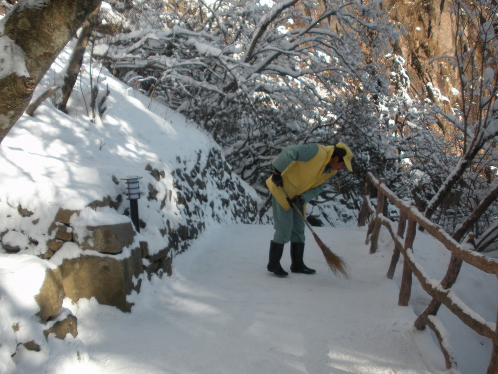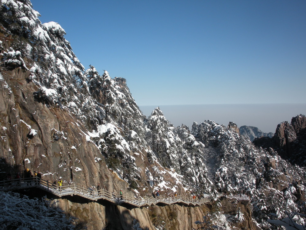 鳌鱼峰险峻,上下山只允许一人通过,保守估计轮到我们通过约耗时至少3个小时,缆车理论上还会运送下山,问题是,旁边的导游说,国字号的下山巴士可能会因为路面结冰的原因停开。 解决方案一,要么摸黑走下山,要么坐昂贵的黑车下山。