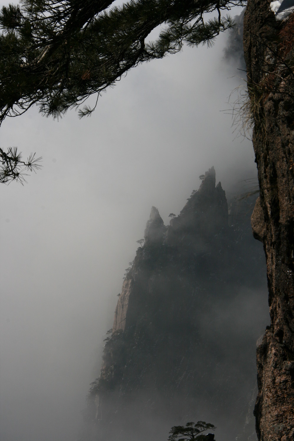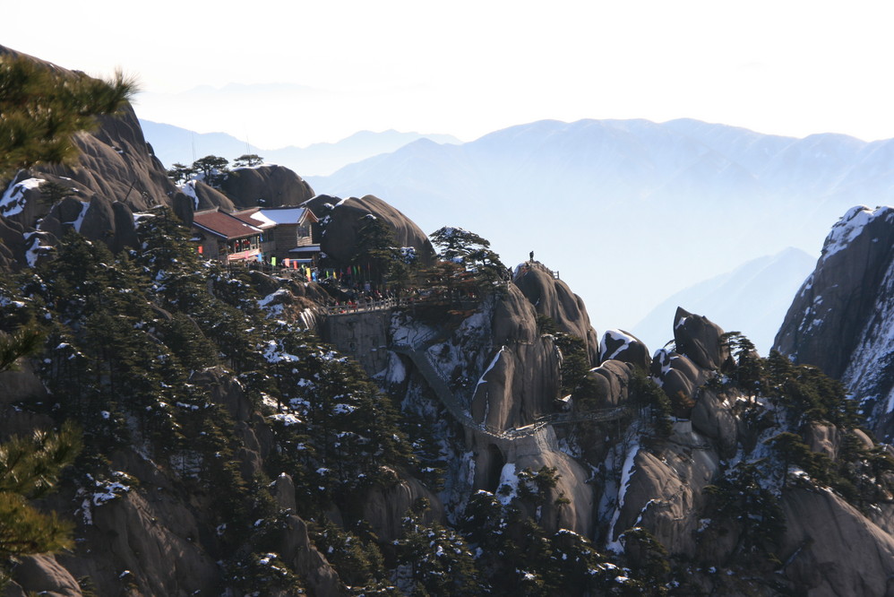 我们听取了客栈老板的建议,从后山上前山下。浪费了差不多2小时在排队中后,我们 重新调整了行走计划和时间,下午1点必须到达光明顶并走向鳌鱼峰。我们属于走哪算哪的人,功课明显做得不足,并且严重高估了自己的体力。在通向光明顶的连续3公里上山路耗费我们大部分体力,爬行到光明顶已经是1点半了,还依然无法快步下山走象鳌鱼峰。 待休整过后,很匆忙赶到鳌鱼峰时,却发现已经又是排队长龙。