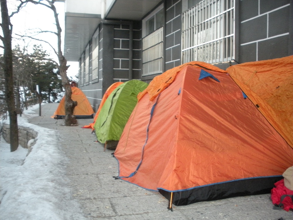 很遗憾,正如之前网友提醒的一样,全部房间均满,哪怕花上3千块也一床难求。这下真的有点抓黑,化雪的山顶晚上铁定零下十几度,毫无任何准备的我们要去哪里躲一晚上?我们都想过,如果实在不行,就在人家宾馆的大堂坐一晚上,总不至于要赶我们走吧?小卖店呢? 哈,想都不用想啦,都已经全部出租完毕,这资源紧张啊。