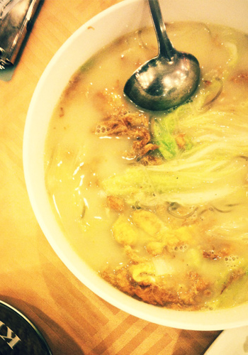 中午来“九毛九”吃还挺划算的,有特价,据说周三使用招行的信用卡还能打半折,点了2碗红豆薏米粥,一叠饺子,一碗烂白菜,一窝过年菜。