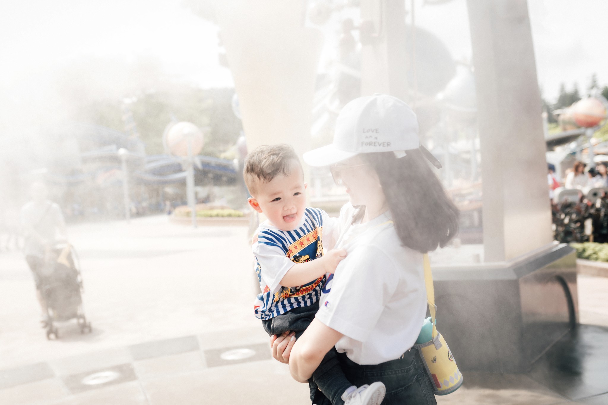 和妈妈在迪斯尼的水雾里旋转跳跃。
