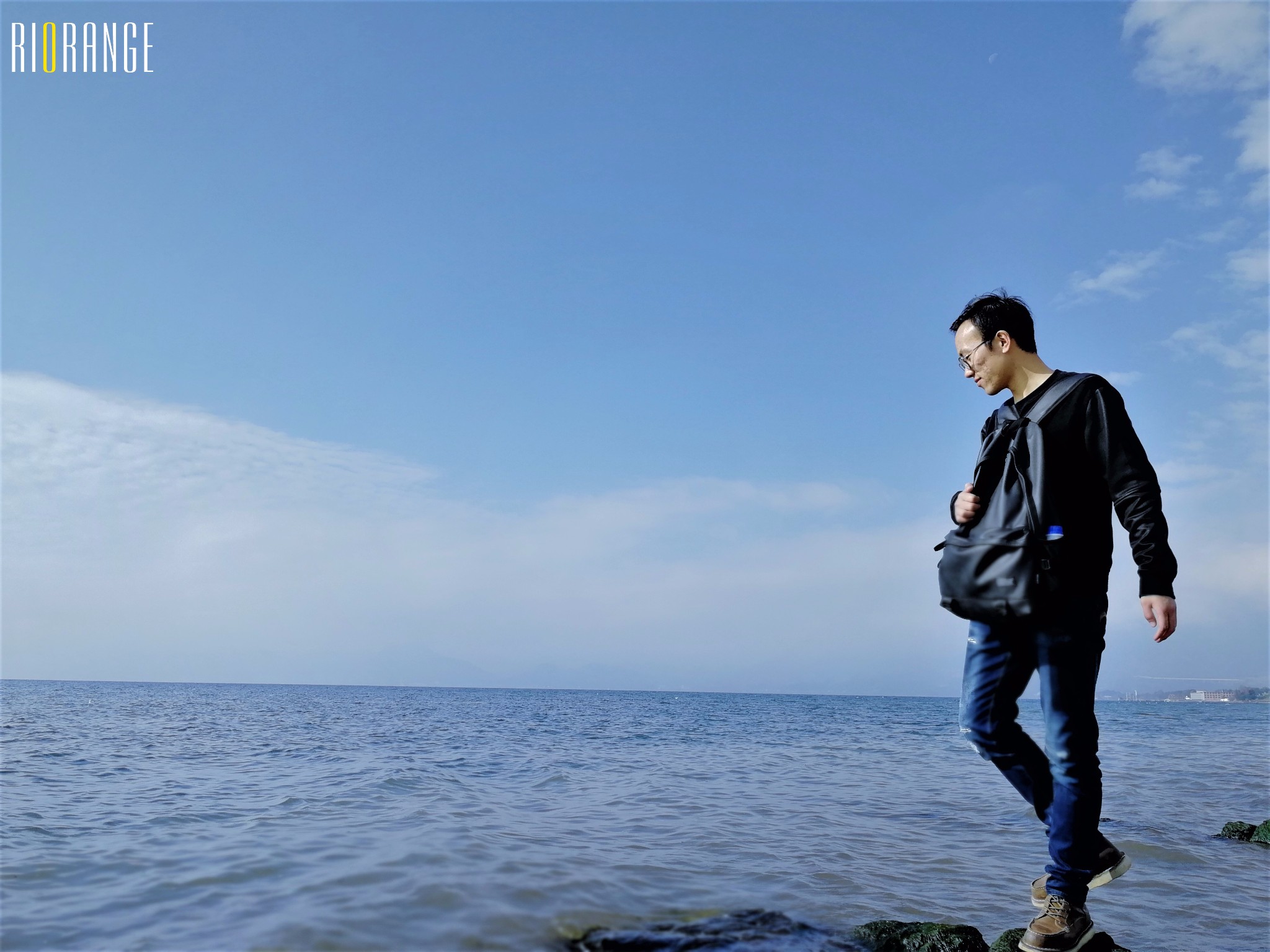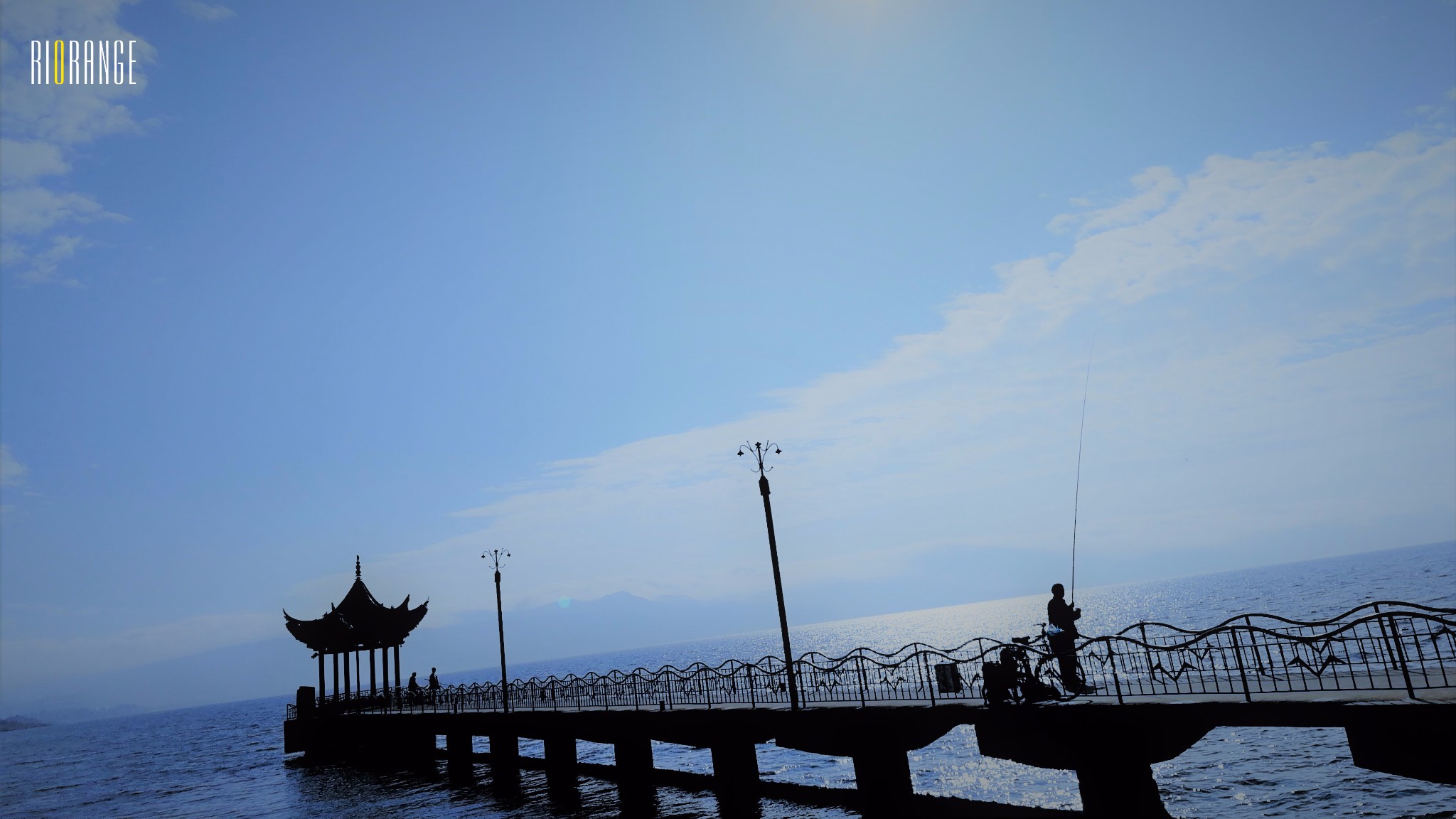 ▼初晨的抚仙,穿过铁网栅栏的我们,站在石台上,遥望着云层后的太阳,很高兴件遇见这一束阳光直射在湖面的景象,波光粼粼,完全没有一点湖泊应该有的样子。