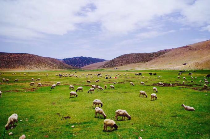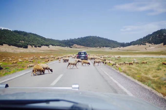 出沙漠途中经过的草原,遇上柏柏尔人赶着羊群过马路,只好停车坐看羊群悠悠的过去、、