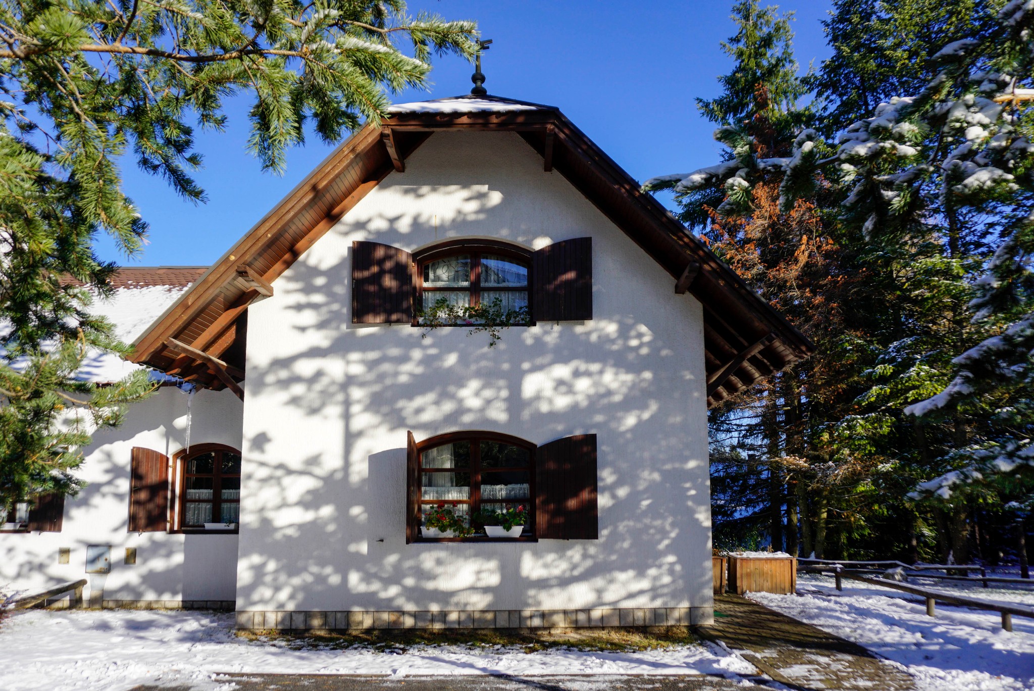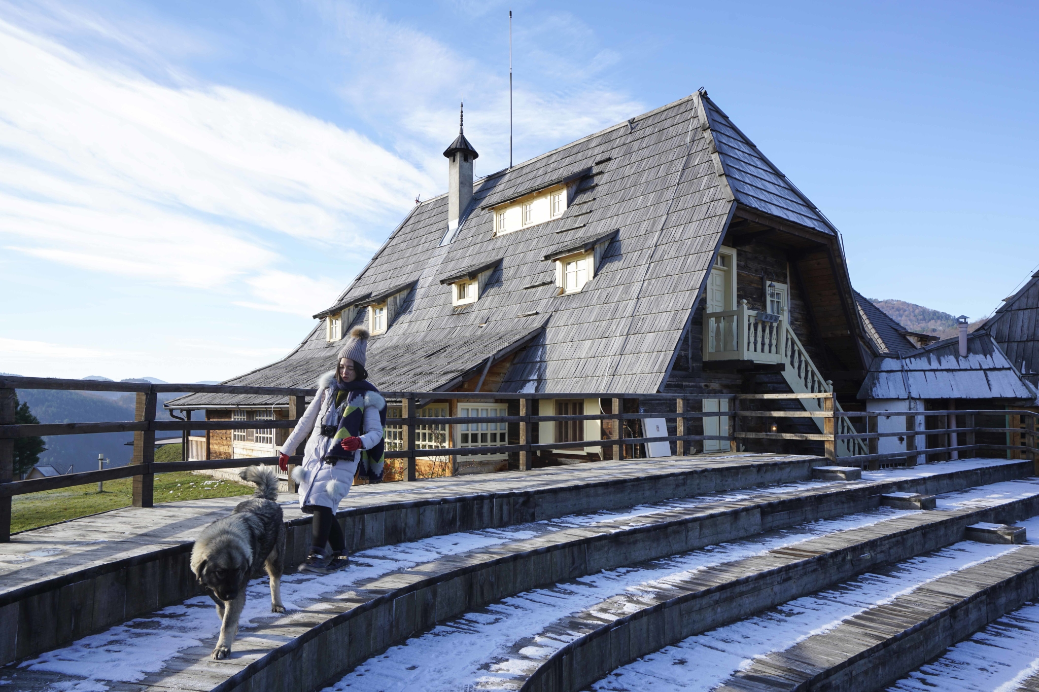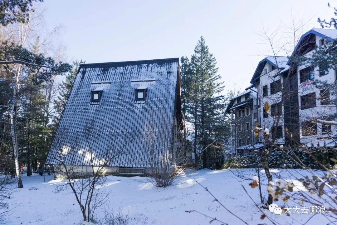 大巴开到Zlatibor需要四个多小时,整段路程一点都不觉得辛苦,我的双眼一直在享受着盛宴。 上面这张照片是隔着大巴玻璃窗拍的。一路上都能看到小木屋稀稀落落地坐落在树林中、草地上,阳光照耀的同时,不时还会出现雪景。