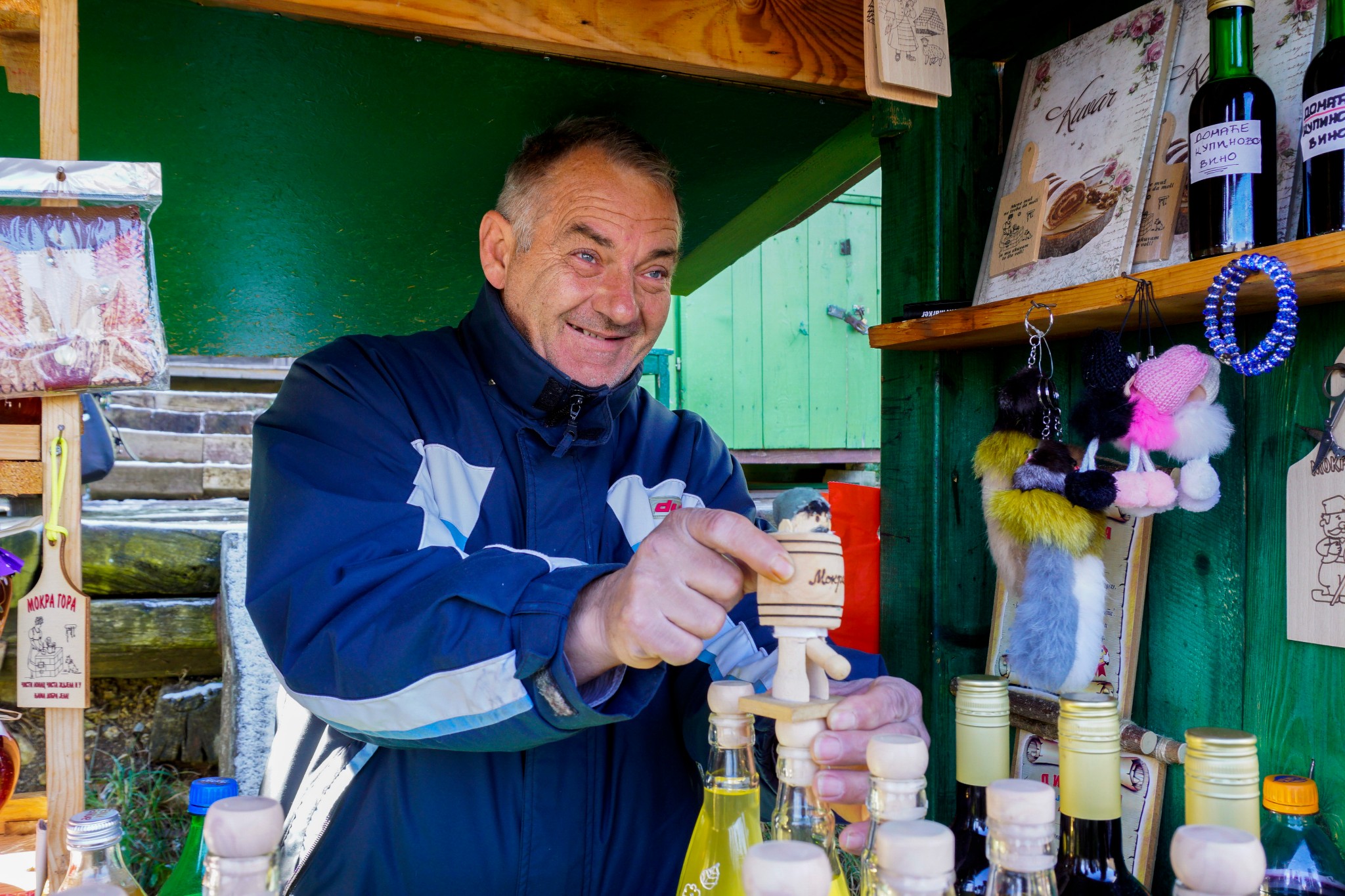 旅游淡季的木头城中依然有售卖商品的小店铺。可爱的爷爷请我们品尝酒,还变魔术给我们看。