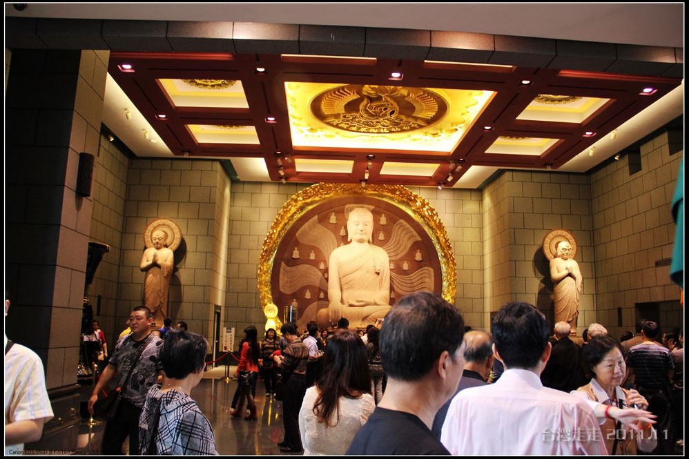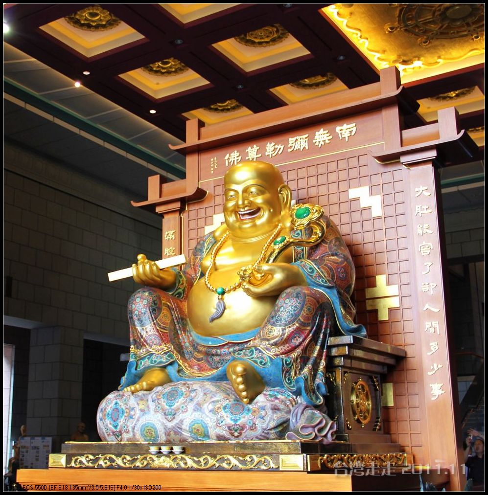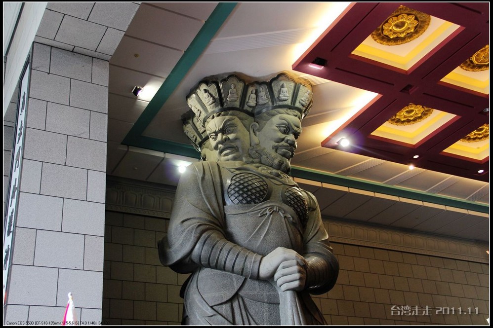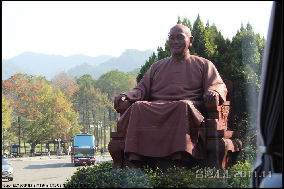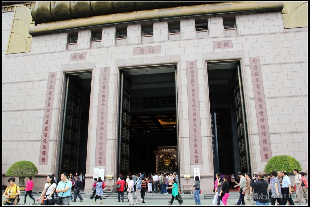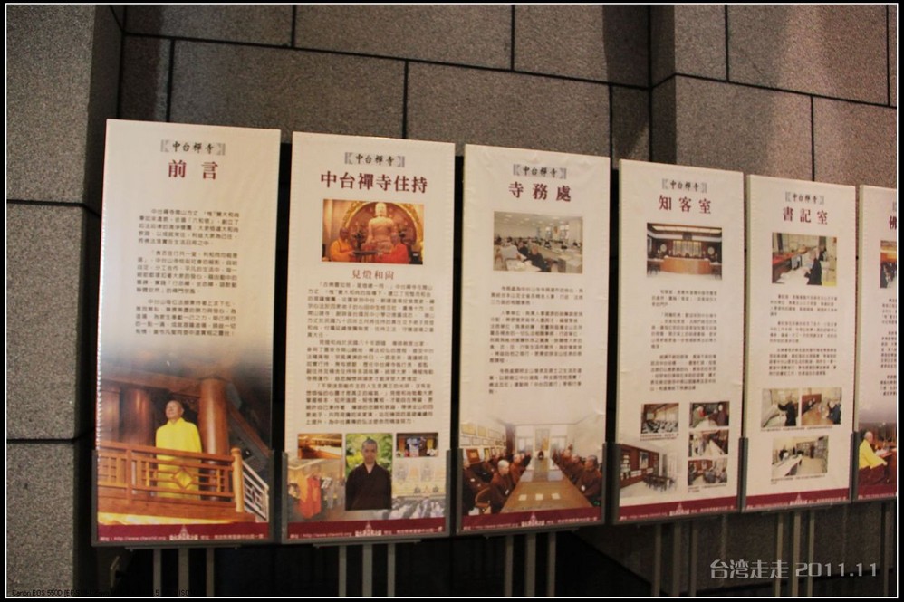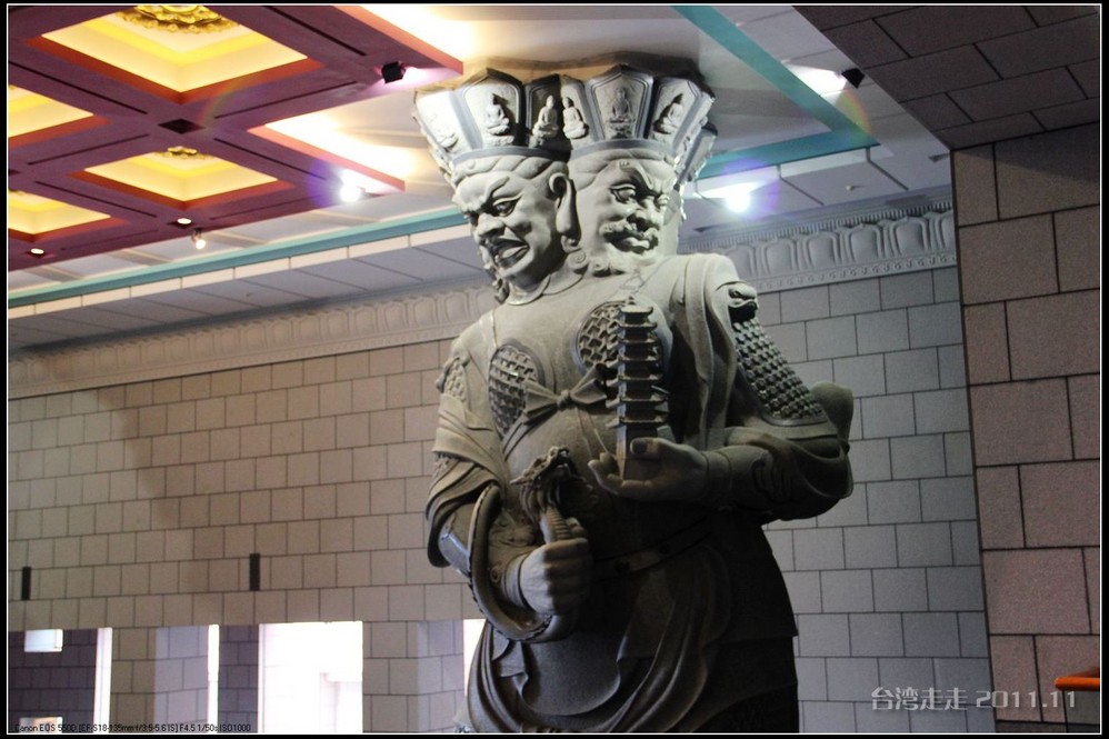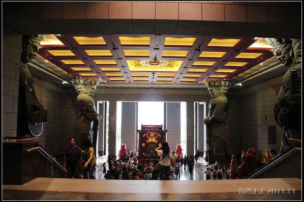 美美的含着酸甜的棒棒糖,我们继续上路。来到了今天的第一站----中台禅寺 。它位于南投县埔里镇 ,于1994年(“民国83年”)创建,目前在全省有80多家分院,并且定期举办神修活动;中台禅寺 规模庞大,有24层楼高,外观融中西工法,寺顶高耸壮观,更是让信众们赞叹,中台禅寺 整个新建 筑乍看下彷佛金字塔形态,实为佛教建筑另一钜作。又于西元1994年至2000年开始重新规划改建,今日的中台禅寺 建筑外观庄严宏伟,中台禅寺 的建筑内涵融合了中西工法,并且运用『直了成佛』的顿悟法门『因次第尽』的渐修精神,还有古代丛林的风格,将艺术、学术、宗教和文化融为一体,却不失禅宗的风格,令人为之赞叹;中台禅寺 除了建筑令人赞赏,硬体设备也相当完善,有禅堂、四天王殿、菩萨 殿、三世佛殿、讲堂、知客室、大寮 、斋堂让信众参拜、使用。四天王为守护佛法的神明,分别是『东方持国天王 』、『南方增长天王 』、『西方广目天王 』及『北方多闻天王』,神像手中分别拿著象征风调、雨顺、国泰、民安的法器;四天王殿为中台禅寺 主体的殿堂,『弥勒菩萨 』供奉于殿堂中央,弥勒菩萨 的背後有身著甲胄、合掌擎剑的『韦驮菩萨 』,而四大天王 像则分镇在殿堂四周,神像皆以山西黑花岗雕制;四天王像高度约12公尺,重达100多吨,四天王的金刚严肃的眼神令人为之震憾。 中台禅寺 的大雄宝殿 位于主体建筑的二楼,从四天王殿直上阶梯即可到达,大雄宝殿即是佛教丛林道 场中供奉佛像的正殿,一尊由印度红花岗岩雕琢而成的释迦牟尼佛镇坐于殿堂中央,中台禅寺 大雄宝殿整体的空间设计以红、灰为主色,侍立两旁的多闻阿难尊者与苦行迦叶尊者代表著修行的精神。中台禅寺 的地藏殿供奉著大愿地藏王菩萨 ,神像以巴西白玉雕刻成,坐于刻著六道图相的莲台,这六道图腾以浮雕呈现,整座背墙恭刻着以喷砂电脑科技所浮雕完成的『地藏王菩萨 本愿功德经』全文共计10000多字,规模堪称台湾最大,实为令人惊叹。殿中还供奉着一尊武关公像,阙导说他们这供武关公的多,供文关公的少,具体原因没听清介绍,殿里要小声说话,离他远点儿就听不到了。还有呀,这里的设计师与著名的台北101大楼的设计师是同一人噢。