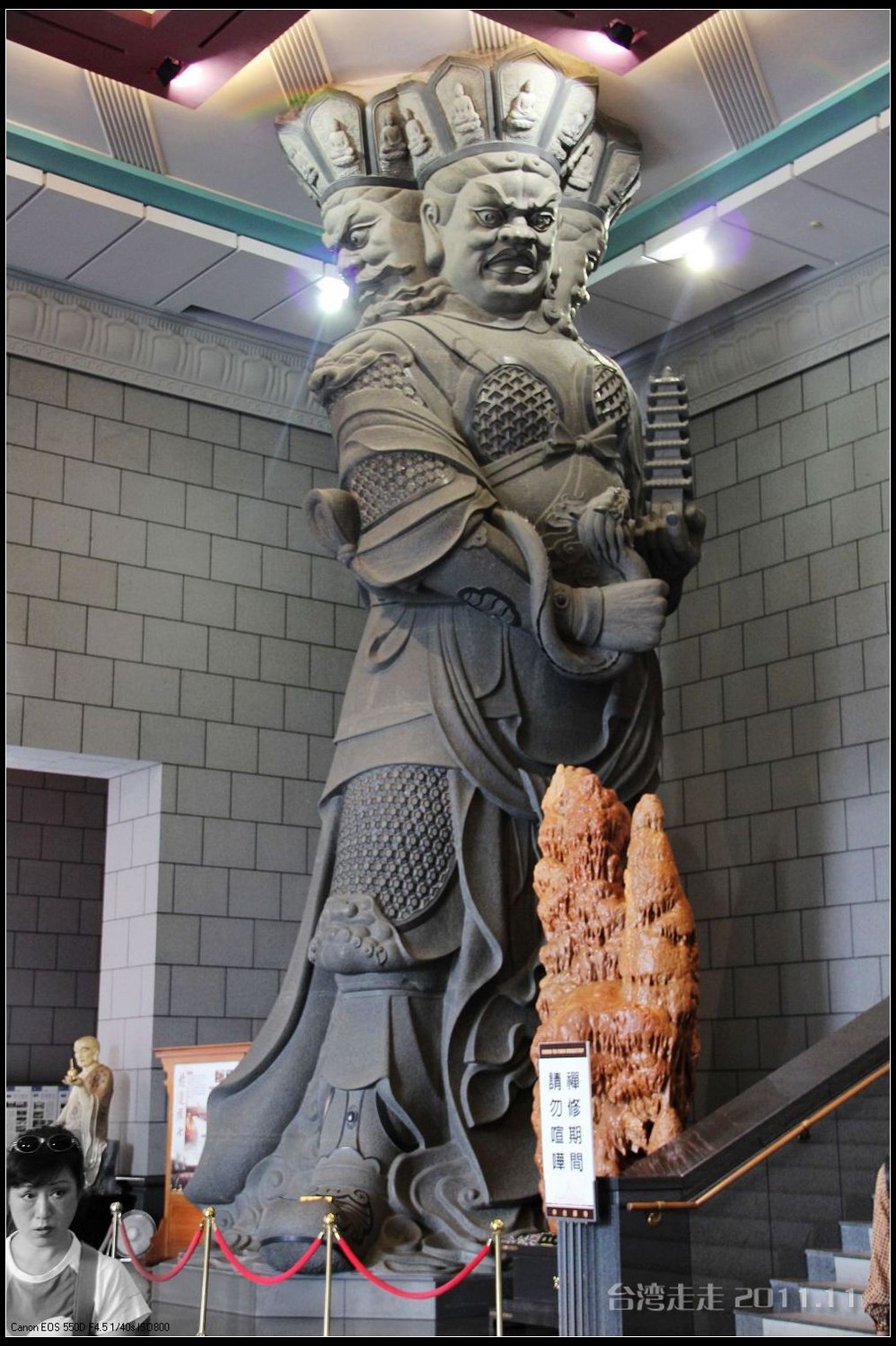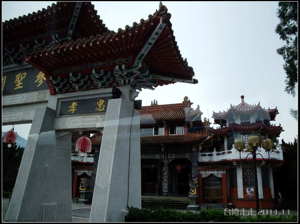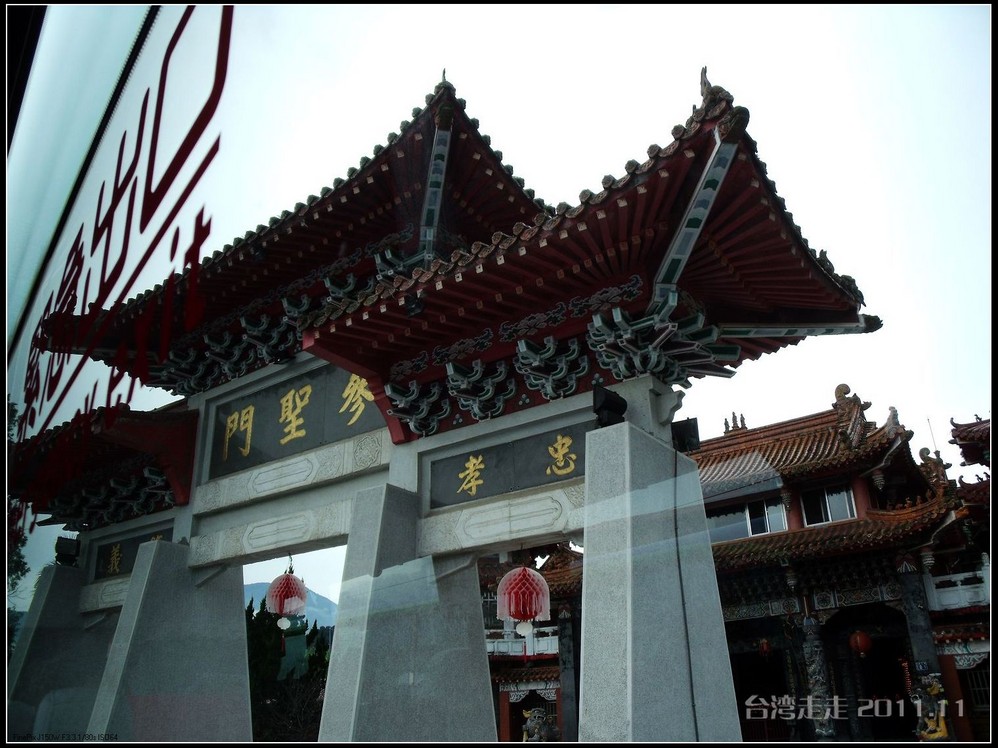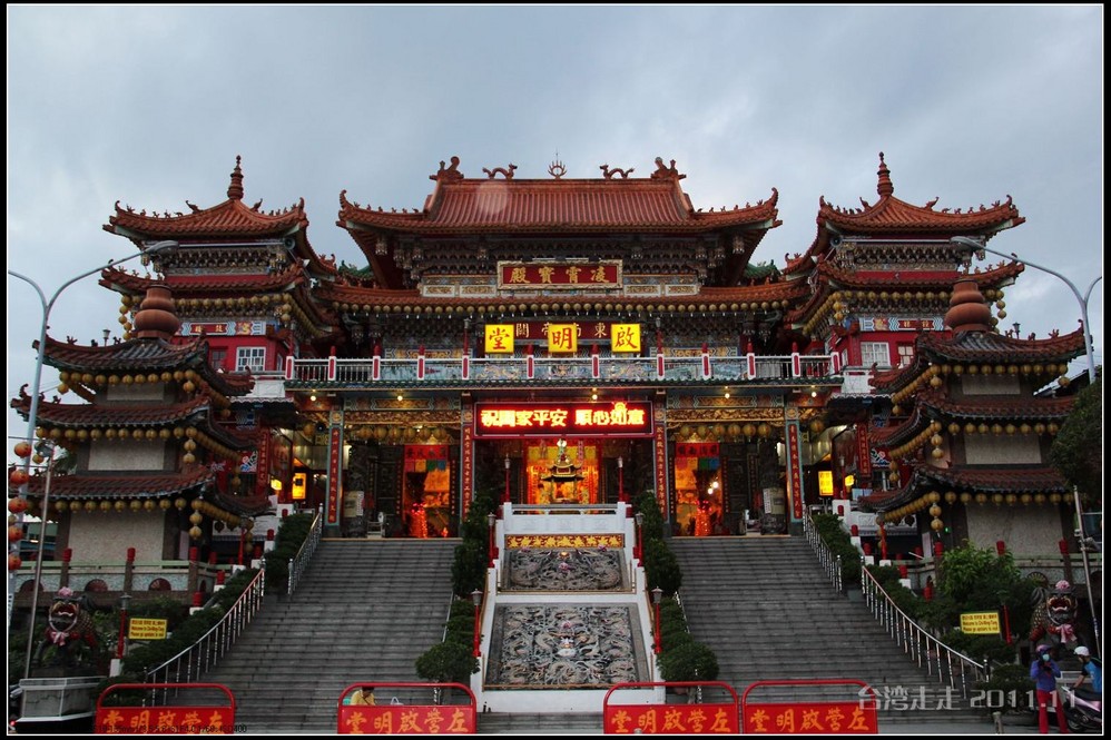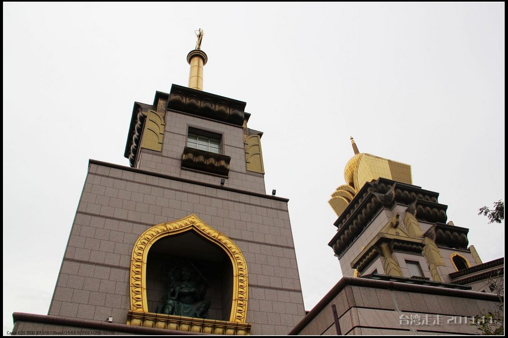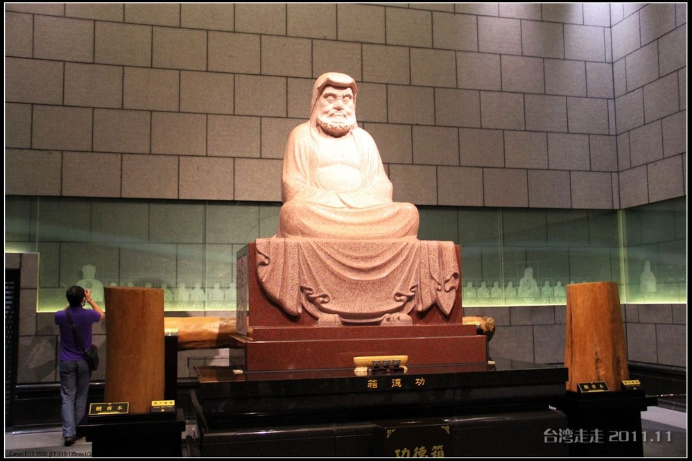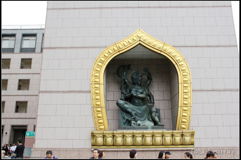 美美的含着酸甜的棒棒糖,我们继续上路。来到了今天的第一站----中台禅寺 。它位于南投县埔里镇 ,于1994年(“民国83年”)创建,目前在全省有80多家分院,并且定期举办神修活动;中台禅寺 规模庞大,有24层楼高,外观融中西工法,寺顶高耸壮观,更是让信众们赞叹,中台禅寺 整个新建 筑乍看下彷佛金字塔形态,实为佛教建筑另一钜作。又于西元1994年至2000年开始重新规划改建,今日的中台禅寺 建筑外观庄严宏伟,中台禅寺 的建筑内涵融合了中西工法,并且运用『直了成佛』的顿悟法门『因次第尽』的渐修精神,还有古代丛林的风格,将艺术、学术、宗教和文化融为一体,却不失禅宗的风格,令人为之赞叹;中台禅寺 除了建筑令人赞赏,硬体设备也相当完善,有禅堂、四天王殿、菩萨 殿、三世佛殿、讲堂、知客室、大寮 、斋堂让信众参拜、使用。四天王为守护佛法的神明,分别是『东方持国天王 』、『南方增长天王 』、『西方广目天王 』及『北方多闻天王』,神像手中分别拿著象征风调、雨顺、国泰、民安的法器;四天王殿为中台禅寺 主体的殿堂,『弥勒菩萨 』供奉于殿堂中央,弥勒菩萨 的背後有身著甲胄、合掌擎剑的『韦驮菩萨 』,而四大天王 像则分镇在殿堂四周,神像皆以山西黑花岗雕制;四天王像高度约12公尺,重达100多吨,四天王的金刚严肃的眼神令人为之震憾。 中台禅寺 的大雄宝殿 位于主体建筑的二楼,从四天王殿直上阶梯即可到达,大雄宝殿即是佛教丛林道 场中供奉佛像的正殿,一尊由印度红花岗岩雕琢而成的释迦牟尼佛镇坐于殿堂中央,中台禅寺 大雄宝殿整体的空间设计以红、灰为主色,侍立两旁的多闻阿难尊者与苦行迦叶尊者代表著修行的精神。中台禅寺 的地藏殿供奉著大愿地藏王菩萨 ,神像以巴西白玉雕刻成,坐于刻著六道图相的莲台,这六道图腾以浮雕呈现,整座背墙恭刻着以喷砂电脑科技所浮雕完成的『地藏王菩萨 本愿功德经』全文共计10000多字,规模堪称台湾最大,实为令人惊叹。殿中还供奉着一尊武关公像,阙导说他们这供武关公的多,供文关公的少,具体原因没听清介绍,殿里要小声说话,离他远点儿就听不到了。还有呀,这里的设计师与著名的台北101大楼的设计师是同一人噢。