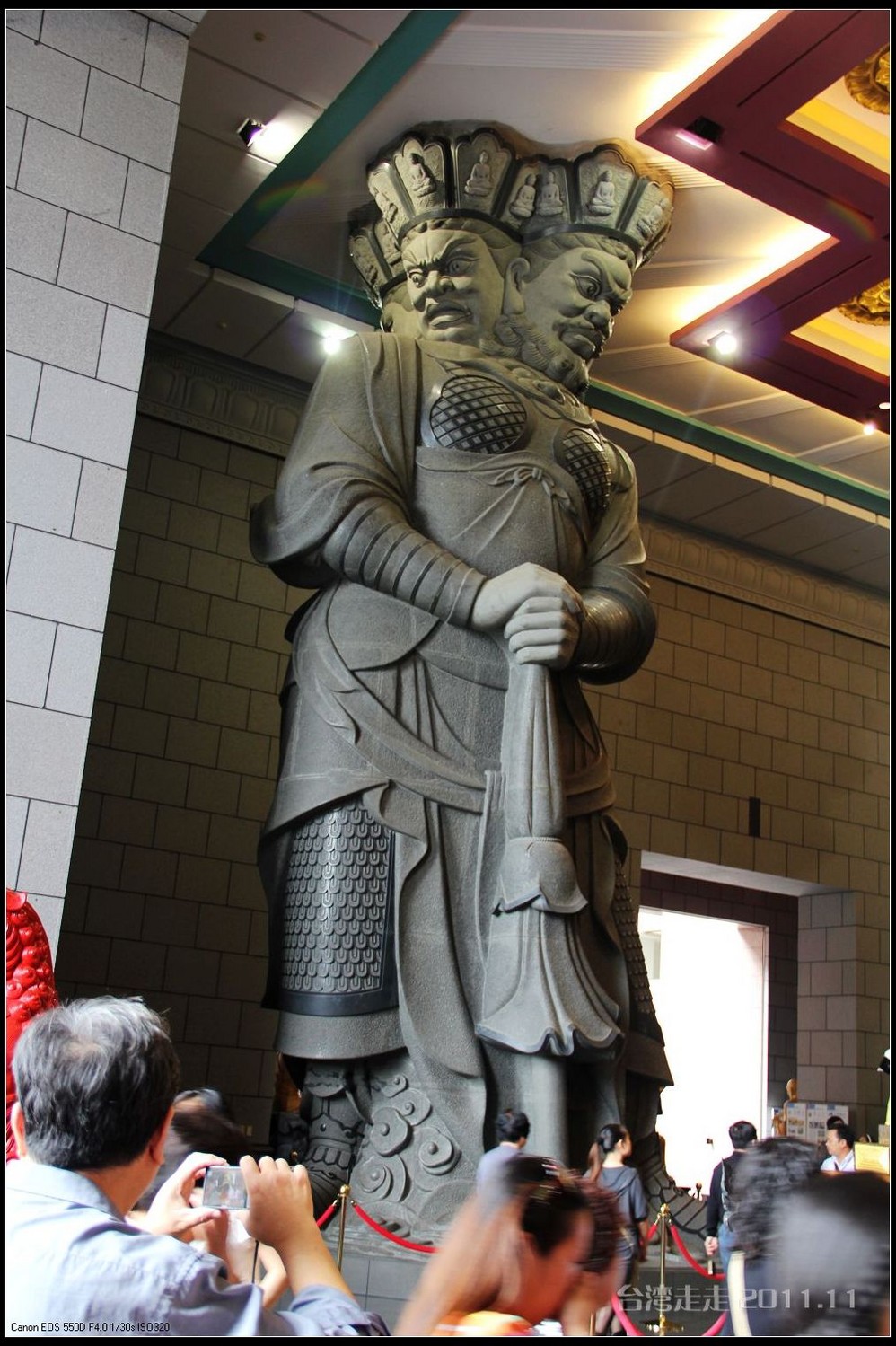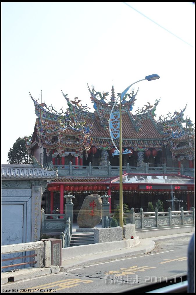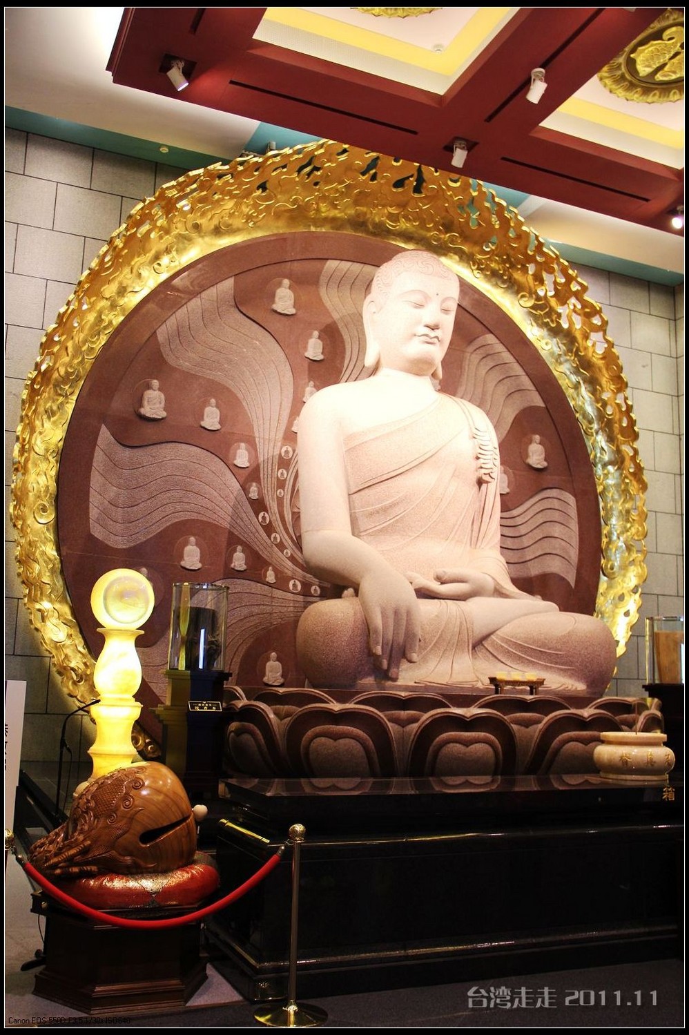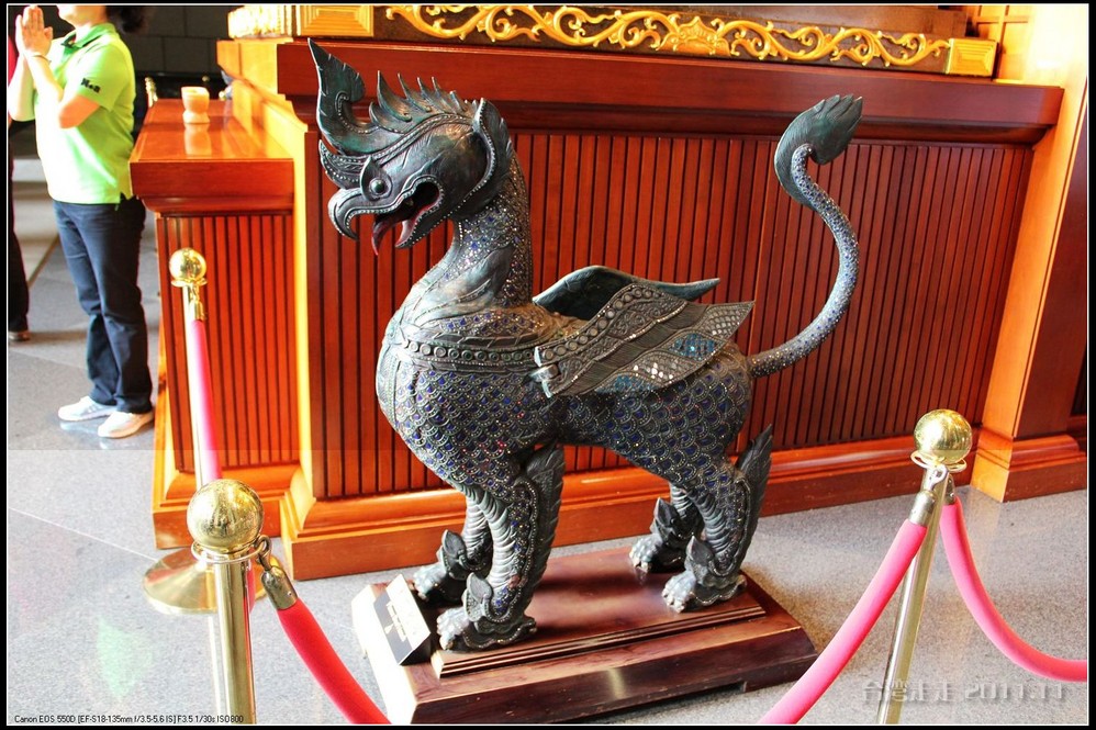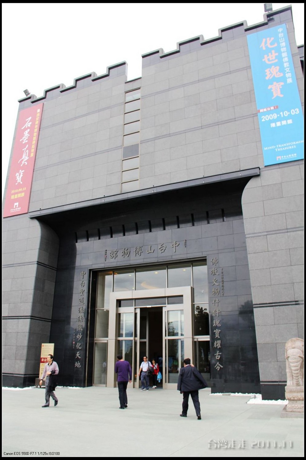 美美的含着酸甜的棒棒糖,我们继续上路。来到了今天的第一站----中台禅寺 。它位于南投县埔里镇 ,于1994年(“民国83年”)创建,目前在全省有80多家分院,并且定期举办神修活动;中台禅寺 规模庞大,有24层楼高,外观融中西工法,寺顶高耸壮观,更是让信众们赞叹,中台禅寺 整个新建 筑乍看下彷佛金字塔形态,实为佛教建筑另一钜作。又于西元1994年至2000年开始重新规划改建,今日的中台禅寺 建筑外观庄严宏伟,中台禅寺 的建筑内涵融合了中西工法,并且运用『直了成佛』的顿悟法门『因次第尽』的渐修精神,还有古代丛林的风格,将艺术、学术、宗教和文化融为一体,却不失禅宗的风格,令人为之赞叹;中台禅寺 除了建筑令人赞赏,硬体设备也相当完善,有禅堂、四天王殿、菩萨 殿、三世佛殿、讲堂、知客室、大寮 、斋堂让信众参拜、使用。四天王为守护佛法的神明,分别是『东方持国天王 』、『南方增长天王 』、『西方广目天王 』及『北方多闻天王』,神像手中分别拿著象征风调、雨顺、国泰、民安的法器;四天王殿为中台禅寺 主体的殿堂,『弥勒菩萨 』供奉于殿堂中央,弥勒菩萨 的背後有身著甲胄、合掌擎剑的『韦驮菩萨 』,而四大天王 像则分镇在殿堂四周,神像皆以山西黑花岗雕制;四天王像高度约12公尺,重达100多吨,四天王的金刚严肃的眼神令人为之震憾。 中台禅寺 的大雄宝殿 位于主体建筑的二楼,从四天王殿直上阶梯即可到达,大雄宝殿即是佛教丛林道 场中供奉佛像的正殿,一尊由印度红花岗岩雕琢而成的释迦牟尼佛镇坐于殿堂中央,中台禅寺 大雄宝殿整体的空间设计以红、灰为主色,侍立两旁的多闻阿难尊者与苦行迦叶尊者代表著修行的精神。中台禅寺 的地藏殿供奉著大愿地藏王菩萨 ,神像以巴西白玉雕刻成,坐于刻著六道图相的莲台,这六道图腾以浮雕呈现,整座背墙恭刻着以喷砂电脑科技所浮雕完成的『地藏王菩萨 本愿功德经』全文共计10000多字,规模堪称台湾最大,实为令人惊叹。殿中还供奉着一尊武关公像,阙导说他们这供武关公的多,供文关公的少,具体原因没听清介绍,殿里要小声说话,离他远点儿就听不到了。还有呀,这里的设计师与著名的台北101大楼的设计师是同一人噢。