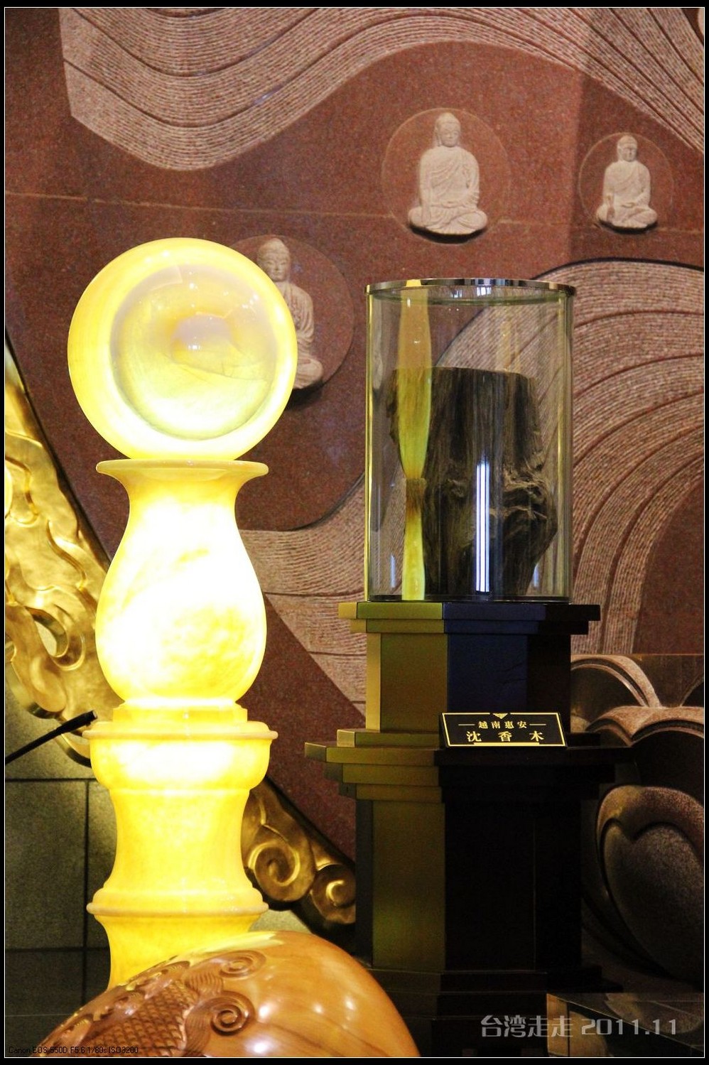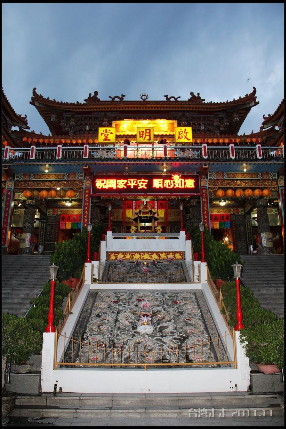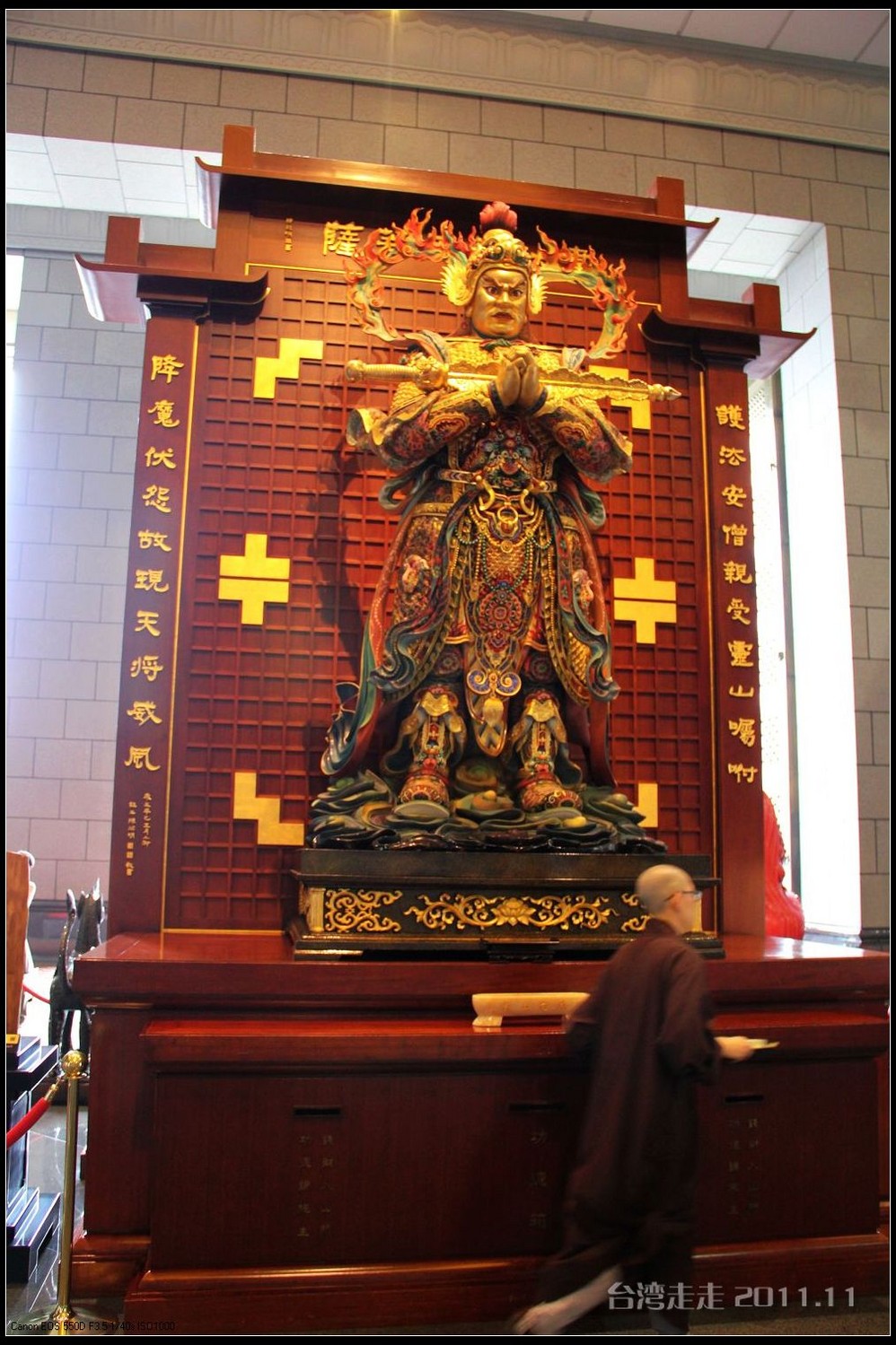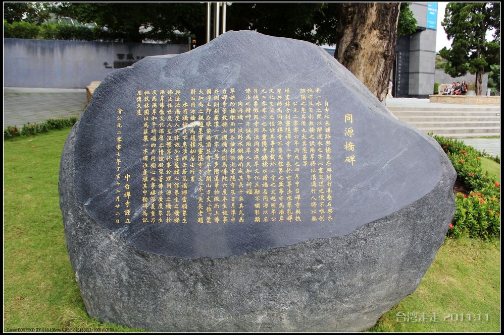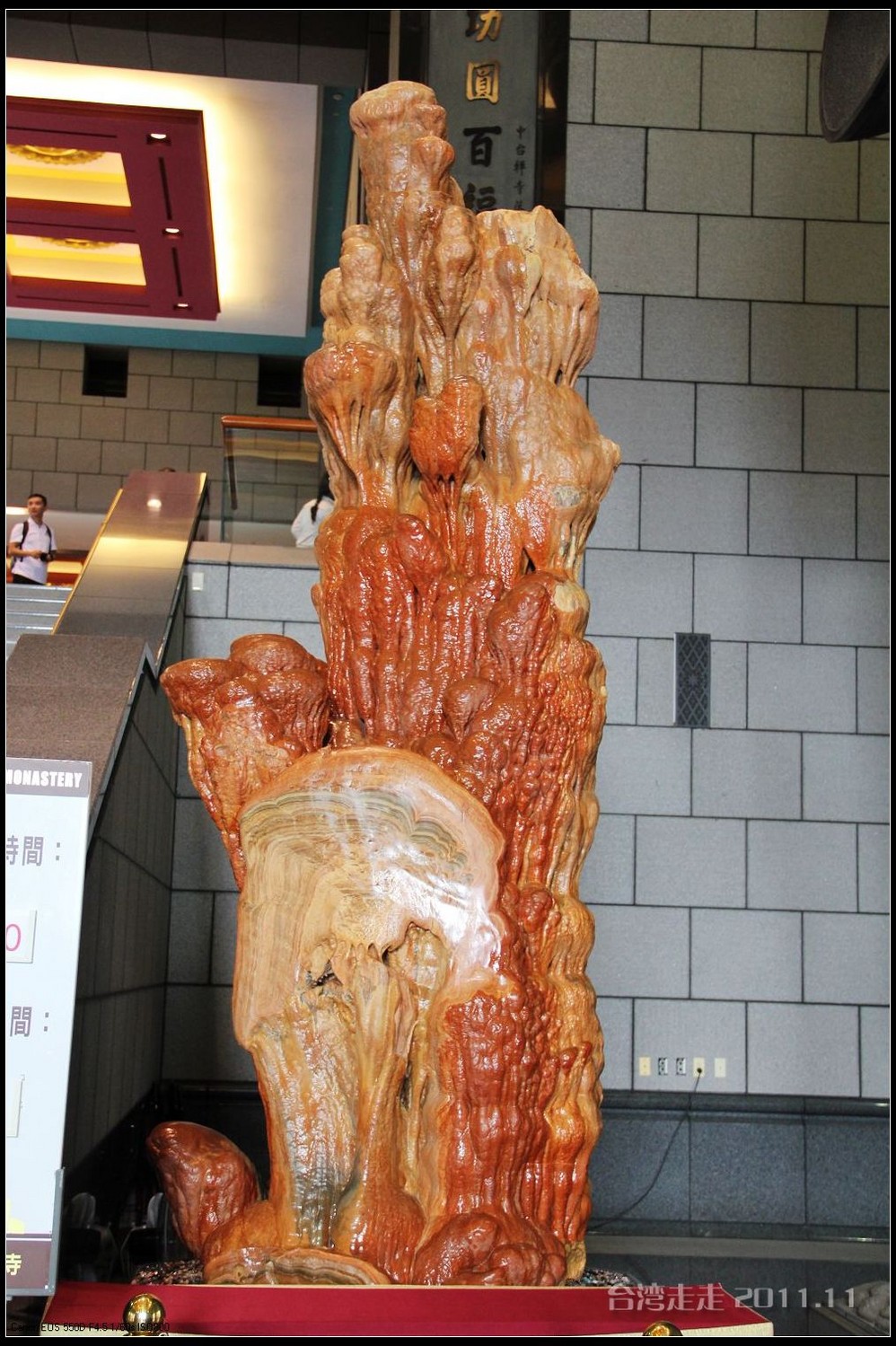 美美的含着酸甜的棒棒糖,我们继续上路。来到了今天的第一站----中台禅寺 。它位于南投县埔里镇 ,于1994年(“民国83年”)创建,目前在全省有80多家分院,并且定期举办神修活动;中台禅寺 规模庞大,有24层楼高,外观融中西工法,寺顶高耸壮观,更是让信众们赞叹,中台禅寺 整个新建 筑乍看下彷佛金字塔形态,实为佛教建筑另一钜作。又于西元1994年至2000年开始重新规划改建,今日的中台禅寺 建筑外观庄严宏伟,中台禅寺 的建筑内涵融合了中西工法,并且运用『直了成佛』的顿悟法门『因次第尽』的渐修精神,还有古代丛林的风格,将艺术、学术、宗教和文化融为一体,却不失禅宗的风格,令人为之赞叹;中台禅寺 除了建筑令人赞赏,硬体设备也相当完善,有禅堂、四天王殿、菩萨 殿、三世佛殿、讲堂、知客室、大寮 、斋堂让信众参拜、使用。四天王为守护佛法的神明,分别是『东方持国天王 』、『南方增长天王 』、『西方广目天王 』及『北方多闻天王』,神像手中分别拿著象征风调、雨顺、国泰、民安的法器;四天王殿为中台禅寺 主体的殿堂,『弥勒菩萨 』供奉于殿堂中央,弥勒菩萨 的背後有身著甲胄、合掌擎剑的『韦驮菩萨 』,而四大天王 像则分镇在殿堂四周,神像皆以山西黑花岗雕制;四天王像高度约12公尺,重达100多吨,四天王的金刚严肃的眼神令人为之震憾。 中台禅寺 的大雄宝殿 位于主体建筑的二楼,从四天王殿直上阶梯即可到达,大雄宝殿即是佛教丛林道 场中供奉佛像的正殿,一尊由印度红花岗岩雕琢而成的释迦牟尼佛镇坐于殿堂中央,中台禅寺 大雄宝殿整体的空间设计以红、灰为主色,侍立两旁的多闻阿难尊者与苦行迦叶尊者代表著修行的精神。中台禅寺 的地藏殿供奉著大愿地藏王菩萨 ,神像以巴西白玉雕刻成,坐于刻著六道图相的莲台,这六道图腾以浮雕呈现,整座背墙恭刻着以喷砂电脑科技所浮雕完成的『地藏王菩萨 本愿功德经』全文共计10000多字,规模堪称台湾最大,实为令人惊叹。殿中还供奉着一尊武关公像,阙导说他们这供武关公的多,供文关公的少,具体原因没听清介绍,殿里要小声说话,离他远点儿就听不到了。还有呀,这里的设计师与著名的台北101大楼的设计师是同一人噢。