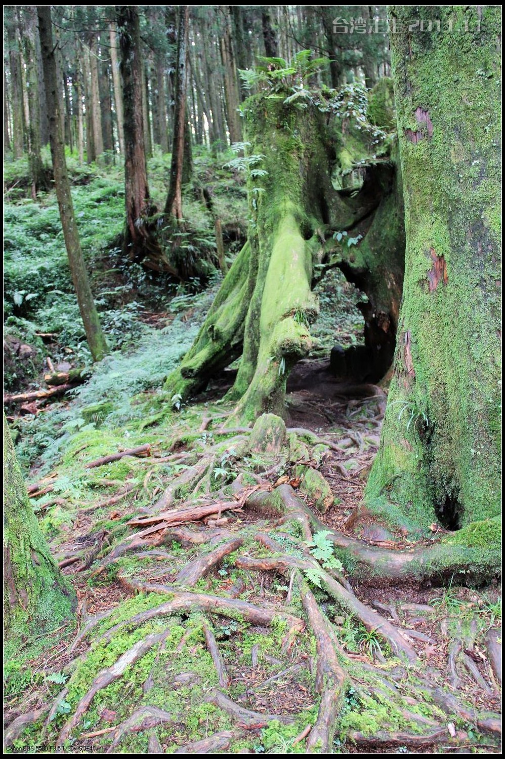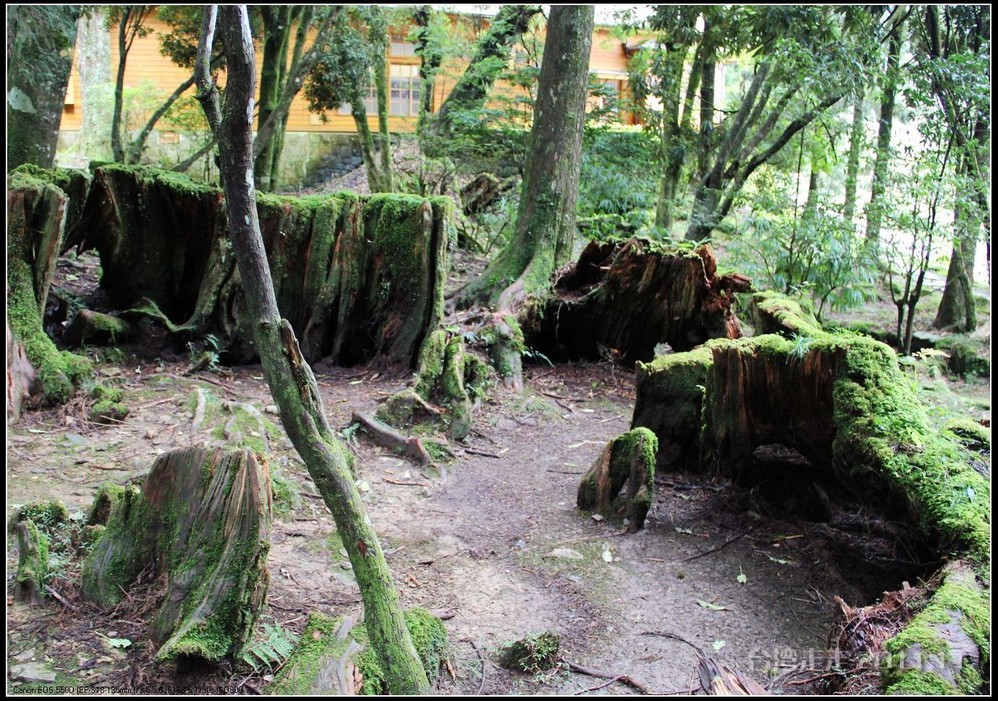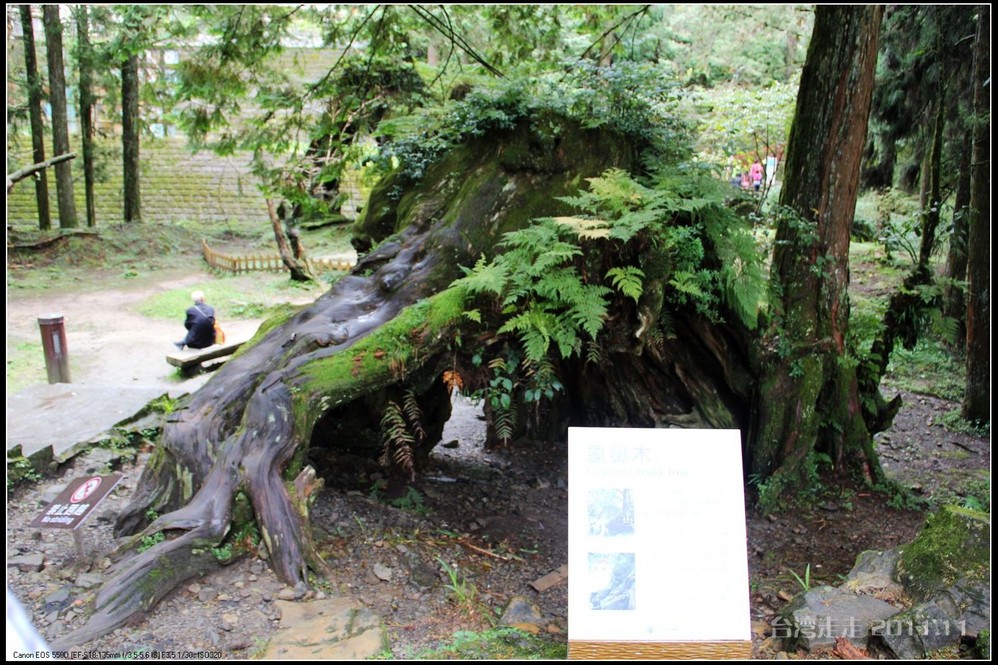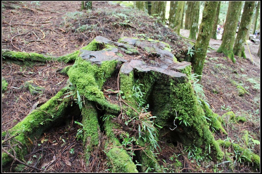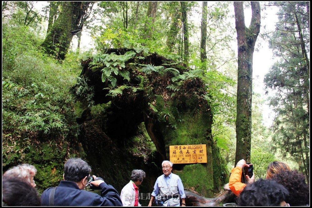 这阿里山 的红桧林,树桩耐看,坚毅挺拔。老树被伐,树身已去,巨大的树桩多数依然活着。苍老遒劲的根蟠龙 似地紧紧抠着阿里山 的土地。岁月久了,树桩枯成了可以躲入数人的洞,根的附着力也差了,许多根条离开了地面,形成了千奇百怪的自然桩景。去往小土地庙 的转角,一个老树桩跨道形成了自然的山门。从名牌上看,它叫“福德万古树”,海拔2182米。