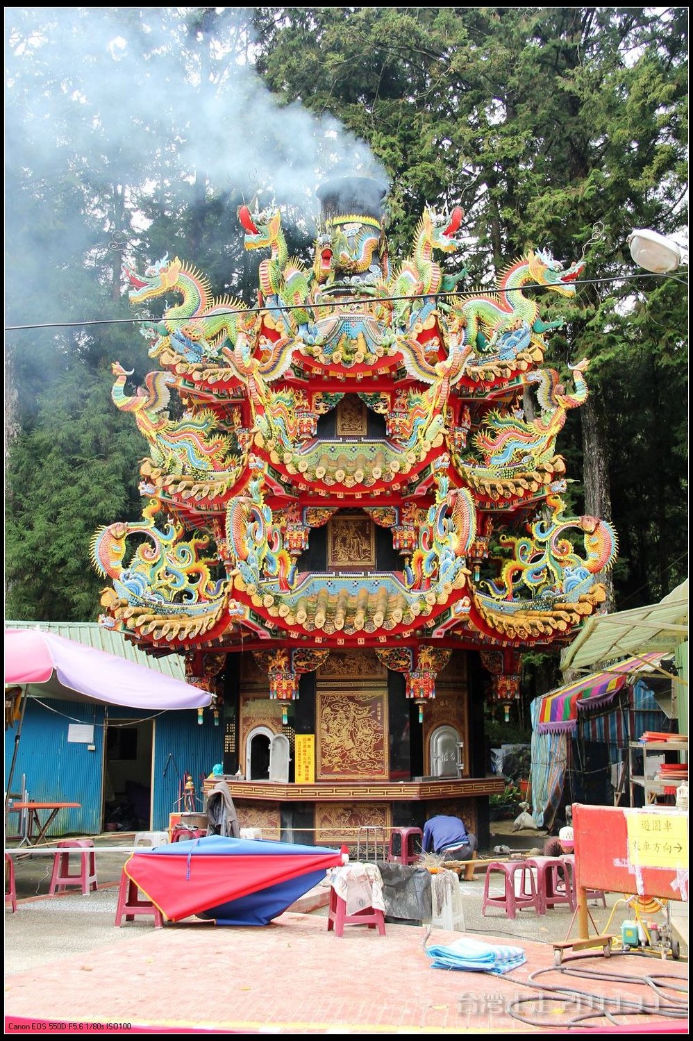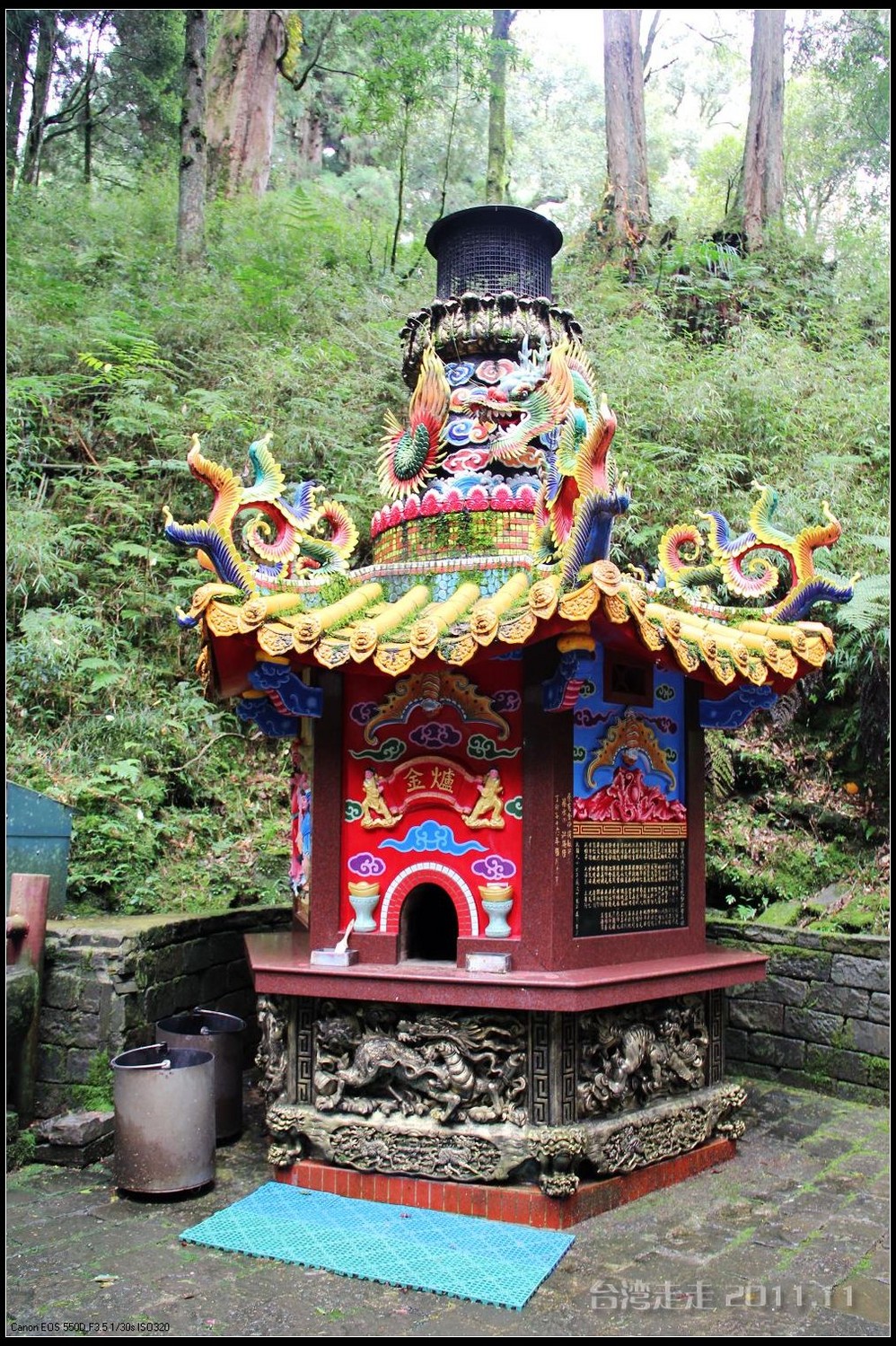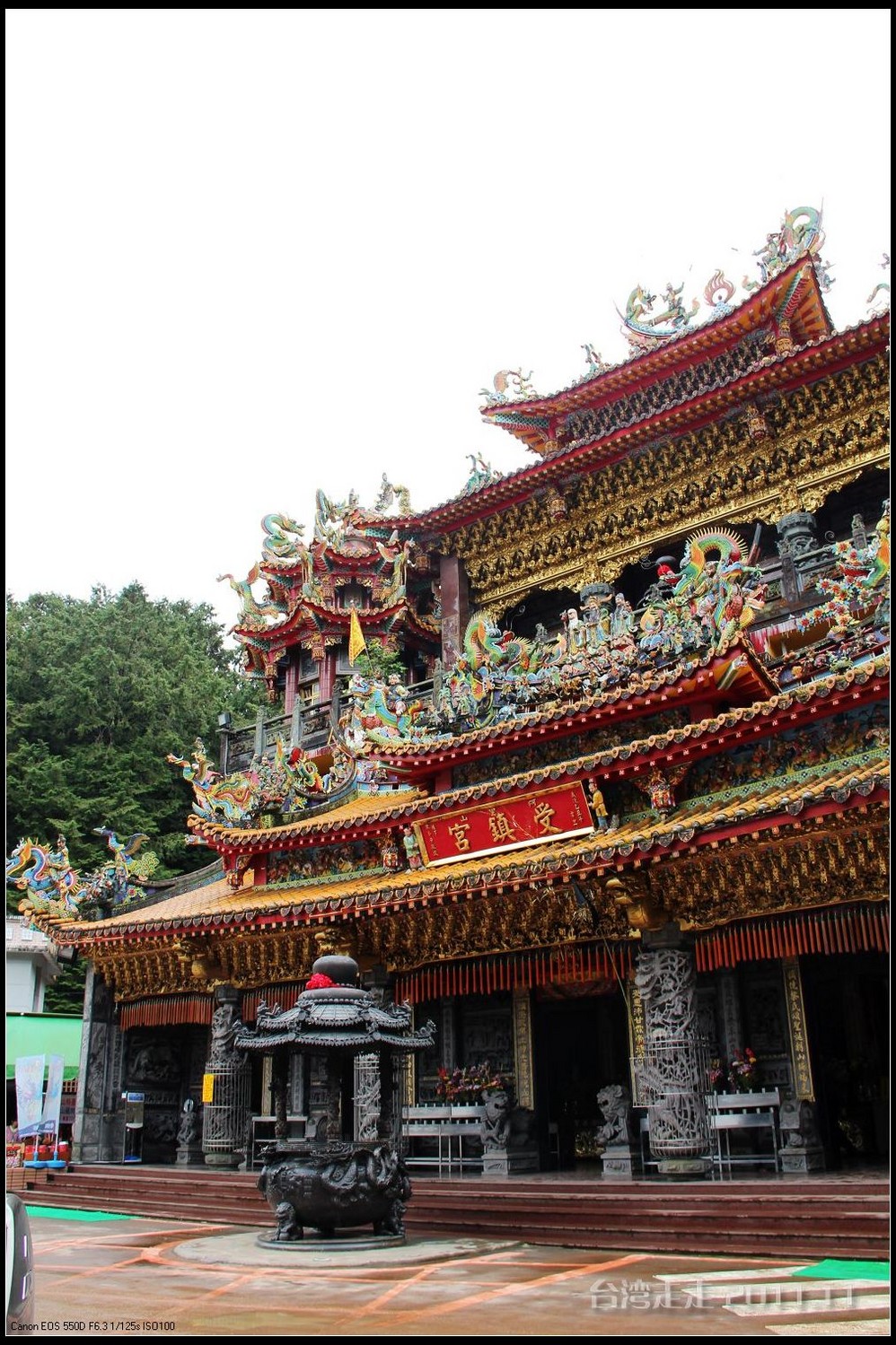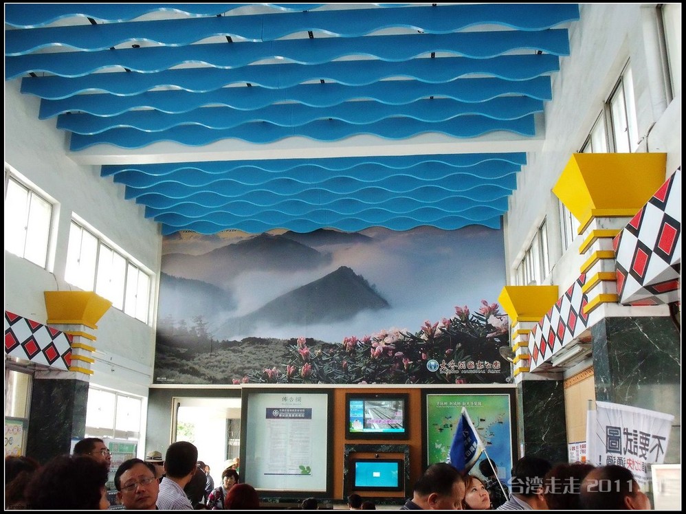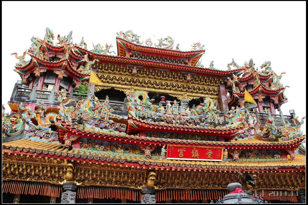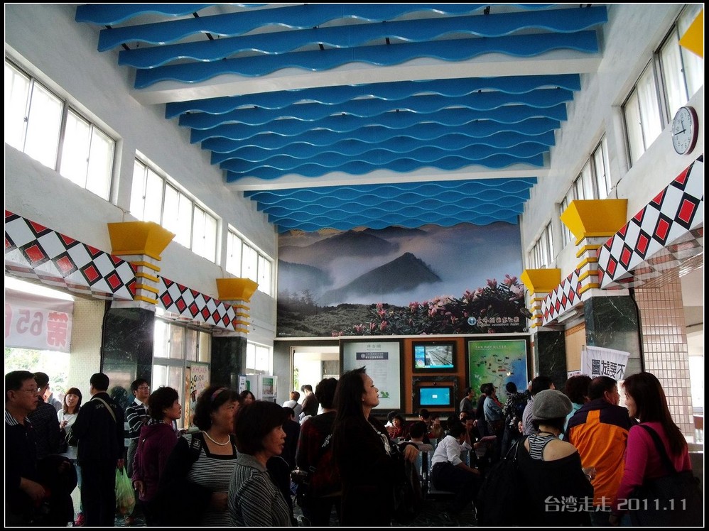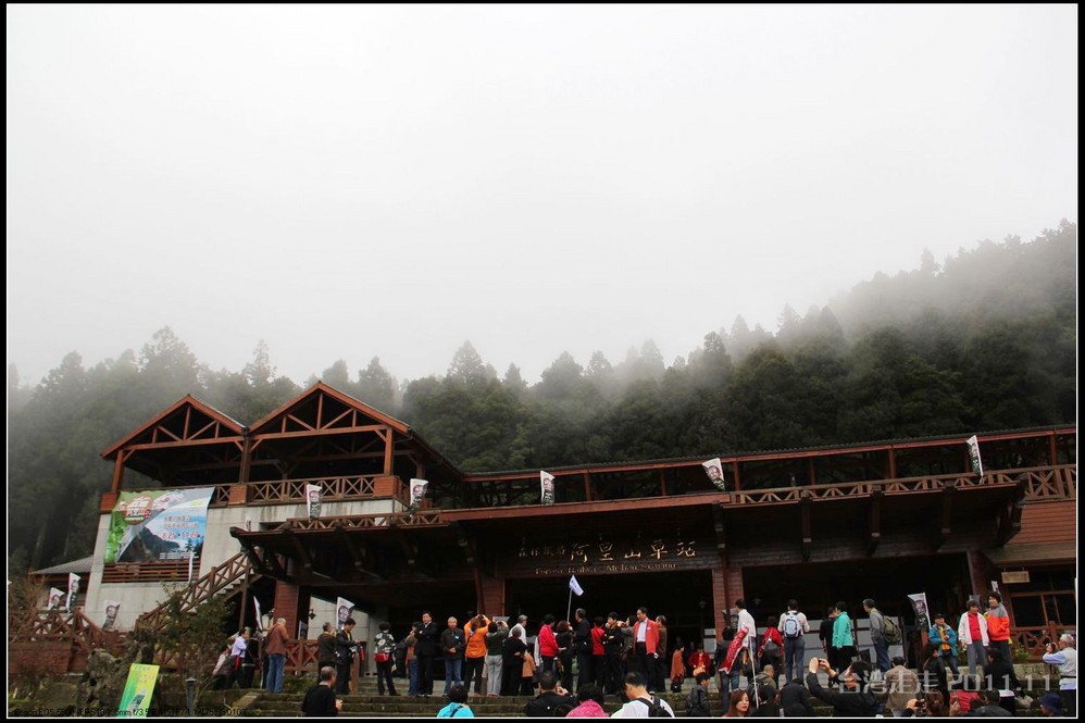 在这里,就开始排队了,因为我们要换乘只能装8个人的小车再继续上山。大巴车开不上去了。山下还穿短袖,山上就都穿上外套了,才14度。面包车左拐右拐的坐到一个空场下,边上便是台湾 最高庙宇----“受镇宫”。庙内供奉玄天上帝为主神。农历三月初三日为北极 玄天上帝诞辰,自民国三十七年开始,在玄天上帝诞辰前后开始飞入数只神蝶依附,体型约有手掌般大小,一动也不动的停驻着,自此之后神蝶年年来受镇宫朝圣祝寿,没有缺席过,数量曾多达二十只之多,为宫里增添神秘色彩,“神蝶朝圣”的难得景象成为阿里山(/poi/965.html) 受镇宫奇特现象。