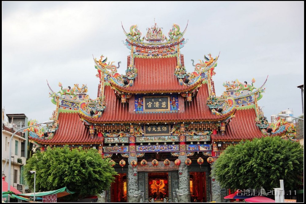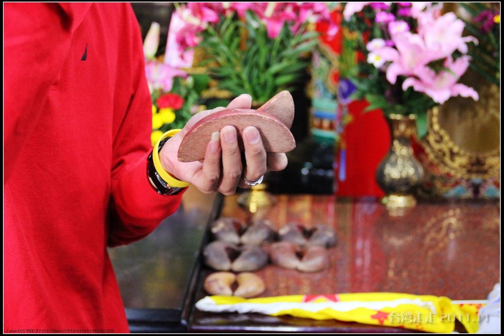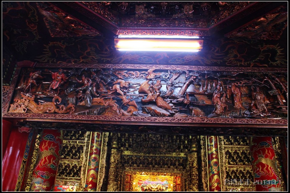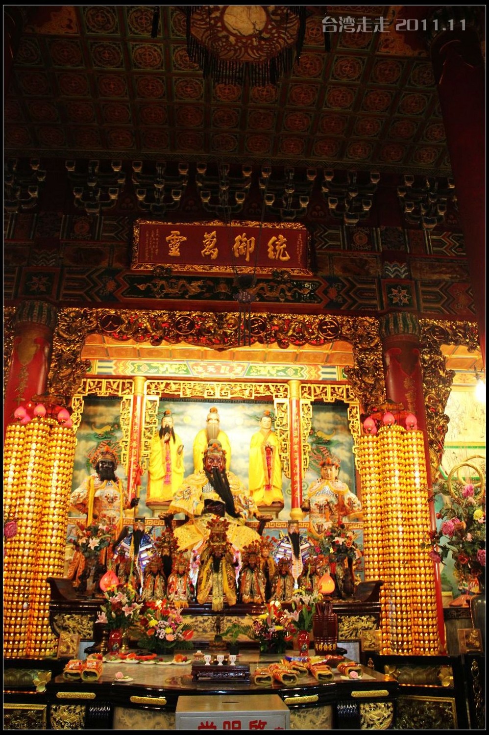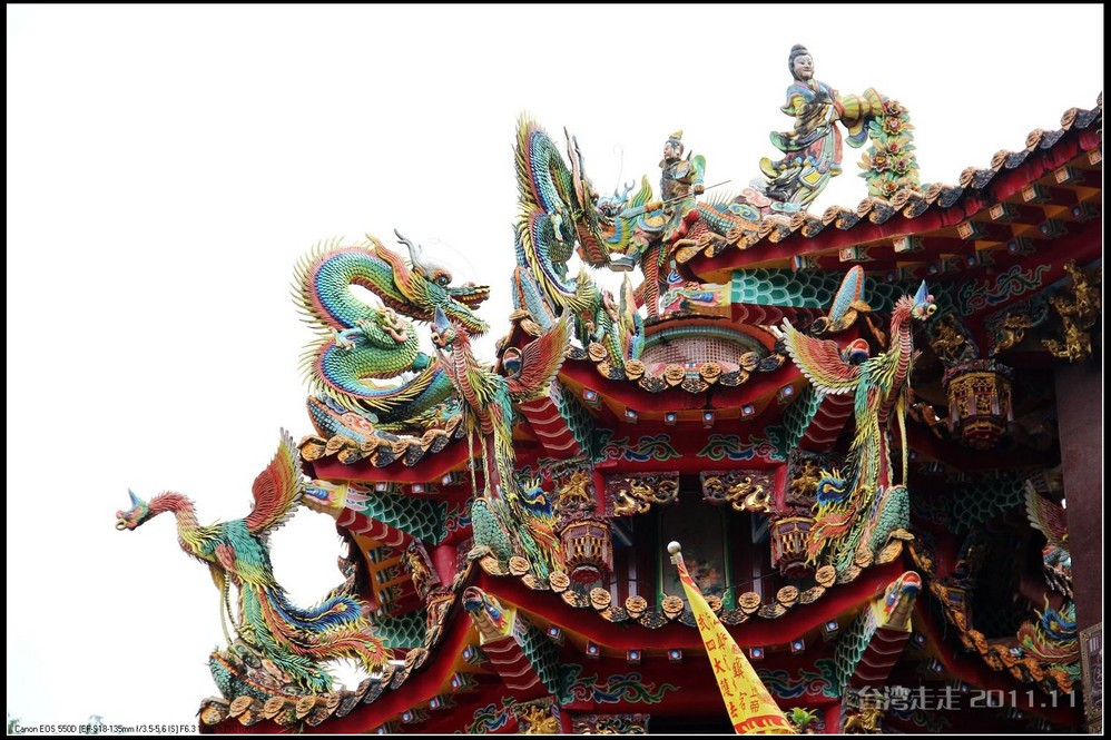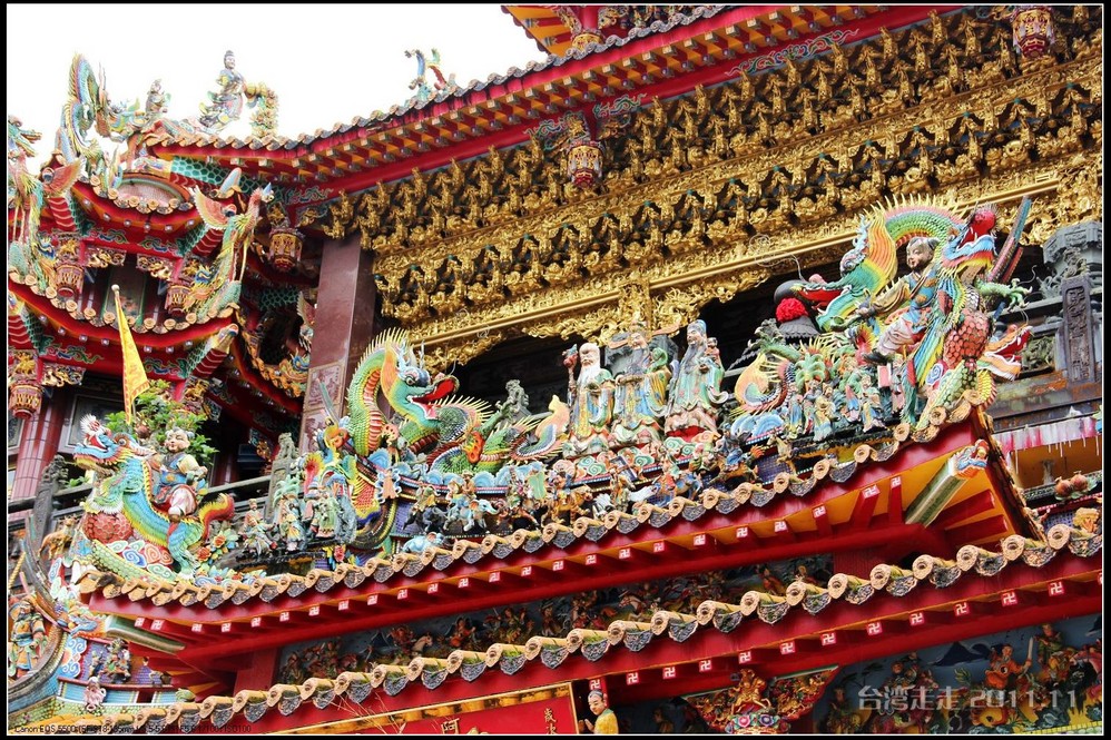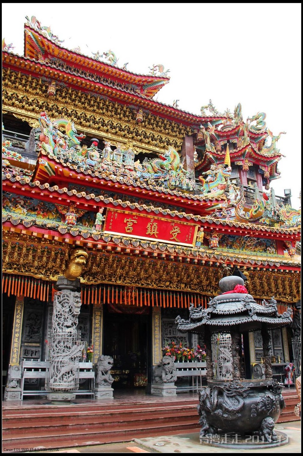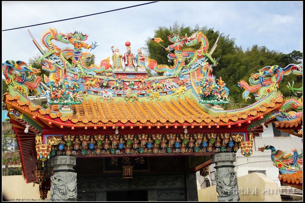 在这里,就开始排队了,因为我们要换乘只能装8个人的小车再继续上山。大巴车开不上去了。山下还穿短袖,山上就都穿上外套了,才14度。面包车左拐右拐的坐到一个空场下,边上便是台湾 最高庙宇----“受镇宫”。庙内供奉玄天上帝为主神。农历三月初三日为北极 玄天上帝诞辰,自民国三十七年开始,在玄天上帝诞辰前后开始飞入数只神蝶依附,体型约有手掌般大小,一动也不动的停驻着,自此之后神蝶年年来受镇宫朝圣祝寿,没有缺席过,数量曾多达二十只之多,为宫里增添神秘色彩,“神蝶朝圣”的难得景象成为阿里山(/poi/965.html) 受镇宫奇特现象。