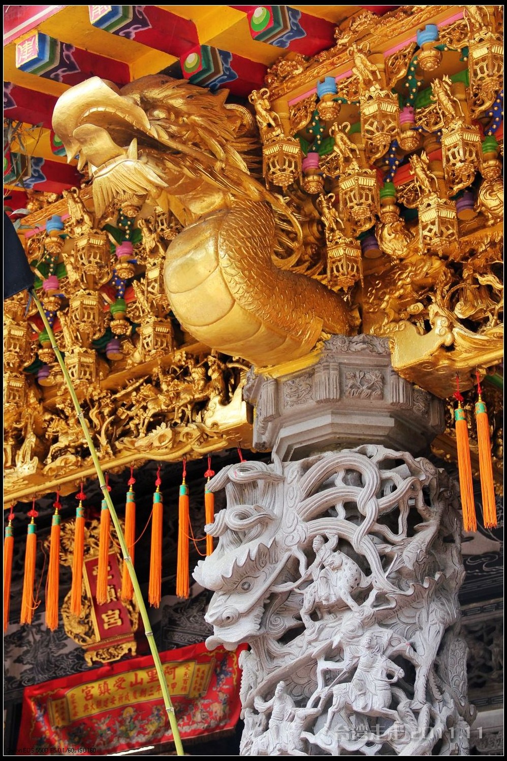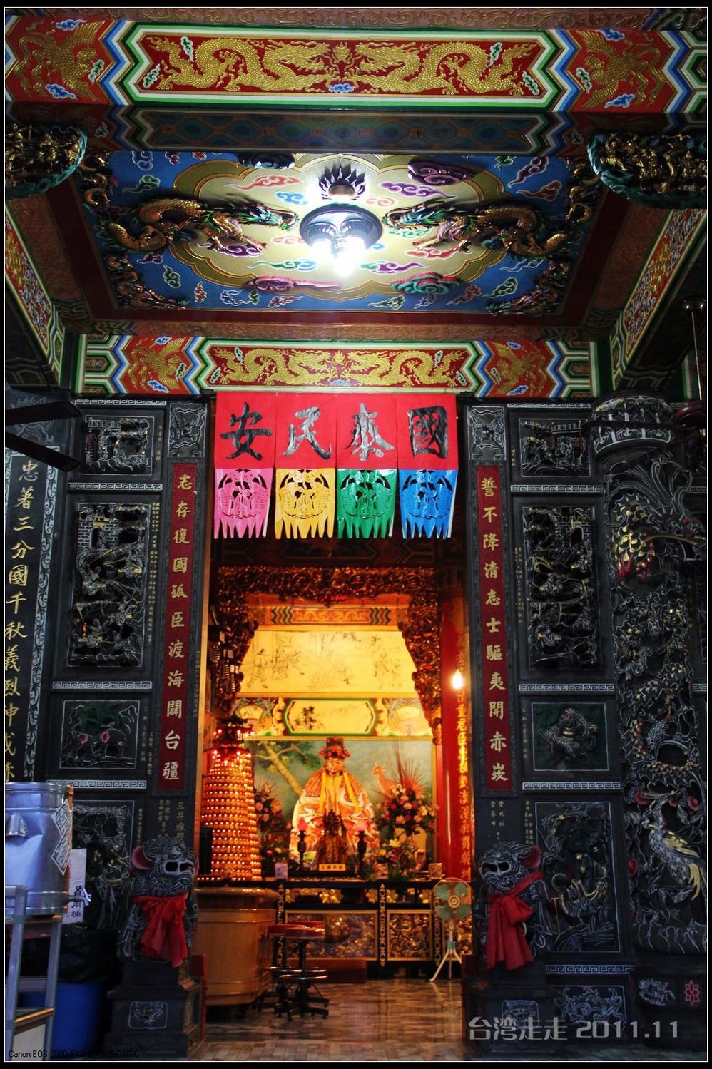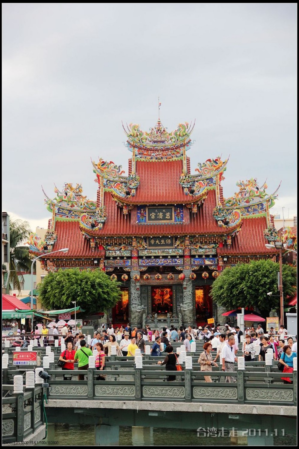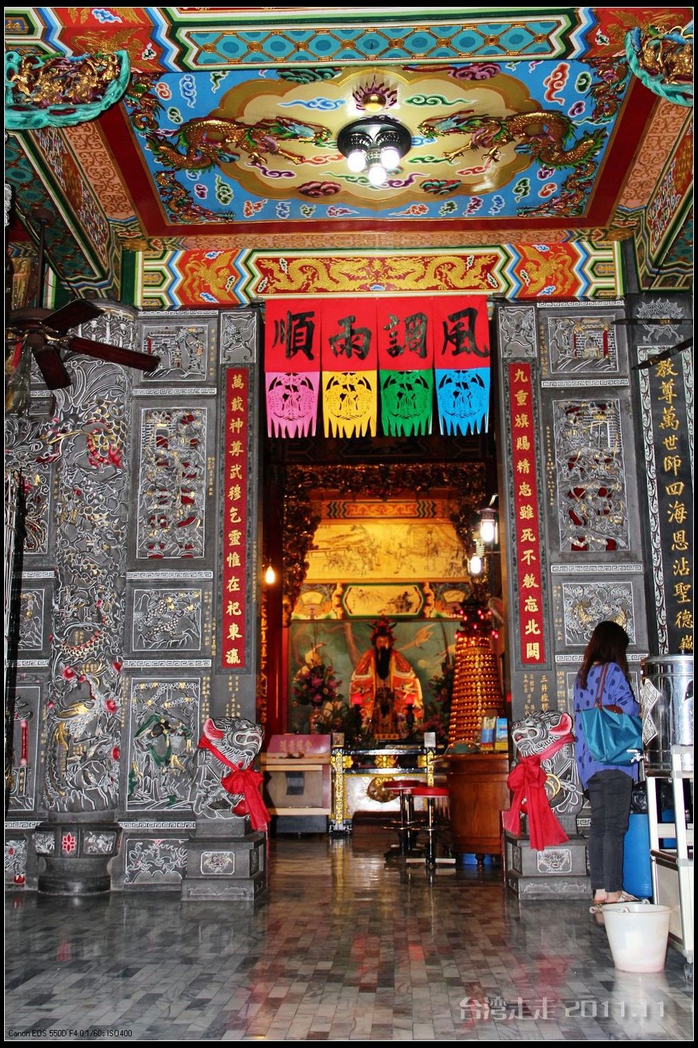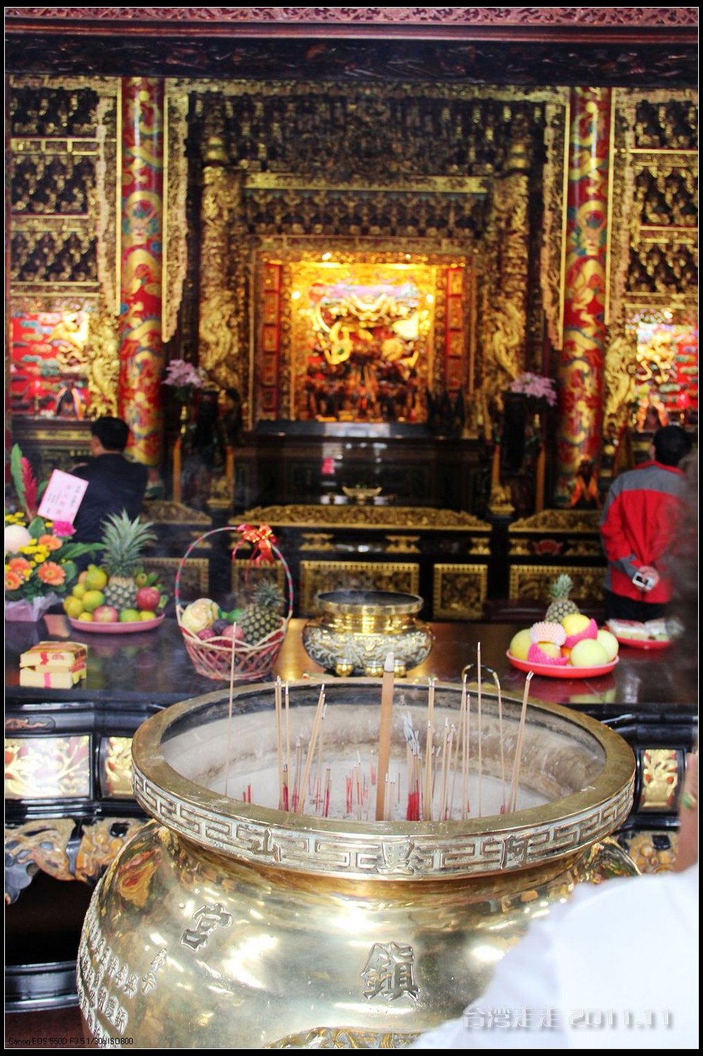 在这里,就开始排队了,因为我们要换乘只能装8个人的小车再继续上山。大巴车开不上去了。山下还穿短袖,山上就都穿上外套了,才14度。面包车左拐右拐的坐到一个空场下,边上便是台湾 最高庙宇----“受镇宫”。庙内供奉玄天上帝为主神。农历三月初三日为北极 玄天上帝诞辰,自民国三十七年开始,在玄天上帝诞辰前后开始飞入数只神蝶依附,体型约有手掌般大小,一动也不动的停驻着,自此之后神蝶年年来受镇宫朝圣祝寿,没有缺席过,数量曾多达二十只之多,为宫里增添神秘色彩,“神蝶朝圣”的难得景象成为阿里山(/poi/965.html) 受镇宫奇特现象。