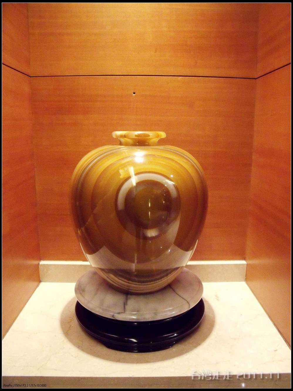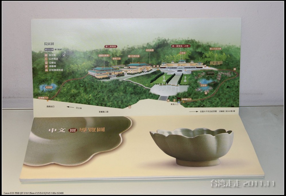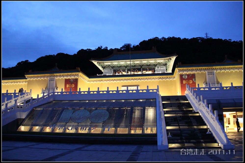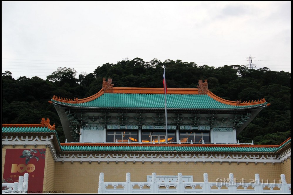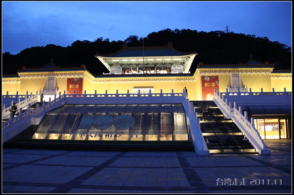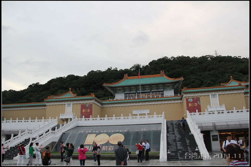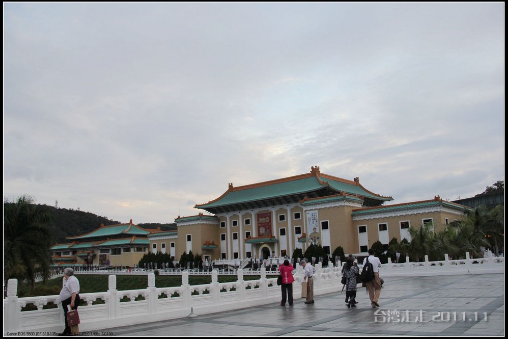 今天的台湾 就像早上出门时的北京 一样在下着雨,天空阴沉沉的,照的相片也不好看。原来安 排的路线不太适合今天的天气,于是导游接下来安 排我们去室内参观的台北 故宫博物院。台北 故宫博物院一直听说当年大陆的很多珍品都在那里。它坐落在台北 市基隆 同北岸士林镇外双溪,始建于1962年,1965年夏落成,占地面积1.03万平方米。中国宫殿 式建筑,共4层,白墙绿瓦。院前广场 耸立由6根石柱 组成的牌坊,气势宏伟,整座建筑庄重典雅,富有民族特色。院内设有20余间展览室,现代化的空气调节、防火、防潮、防盗等设施,以维护珍贵的文化瑰宝。院内收藏有自北京故宫博物馆及沈阳 故宫,热河行宫 运到台湾 的二十四万余件文物,所藏的商周青铜器,历代的玉器、陶瓷、古籍文献、名画碑帖等皆为稀世之珍。