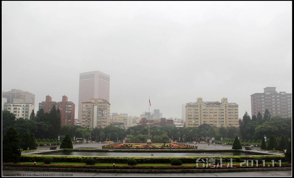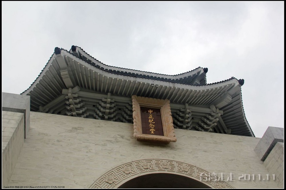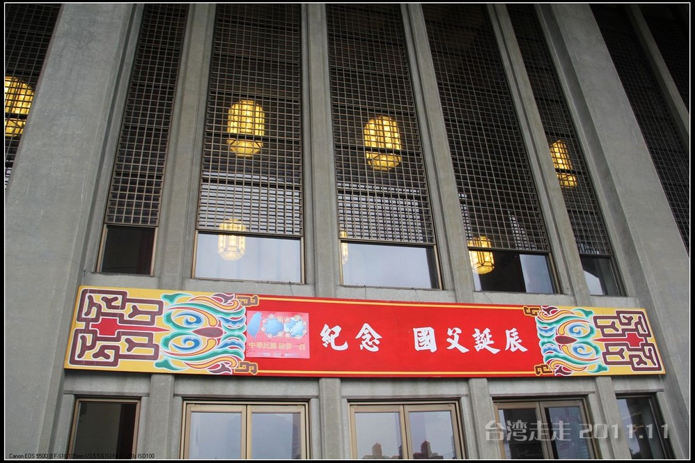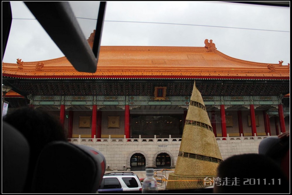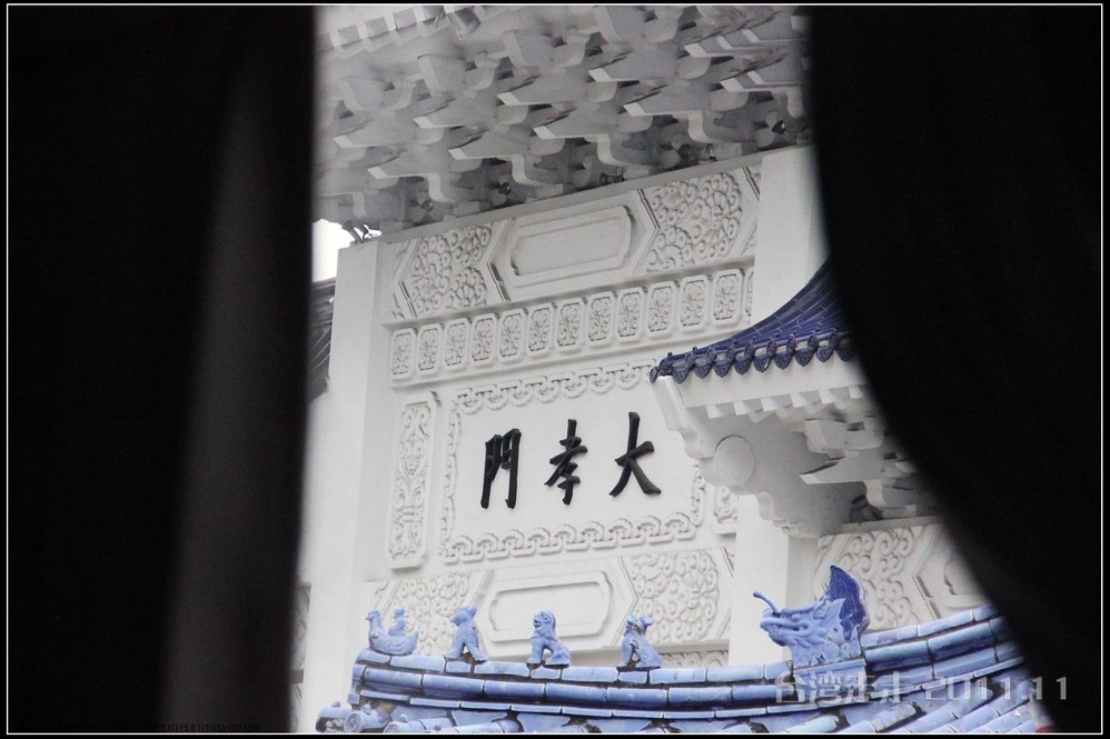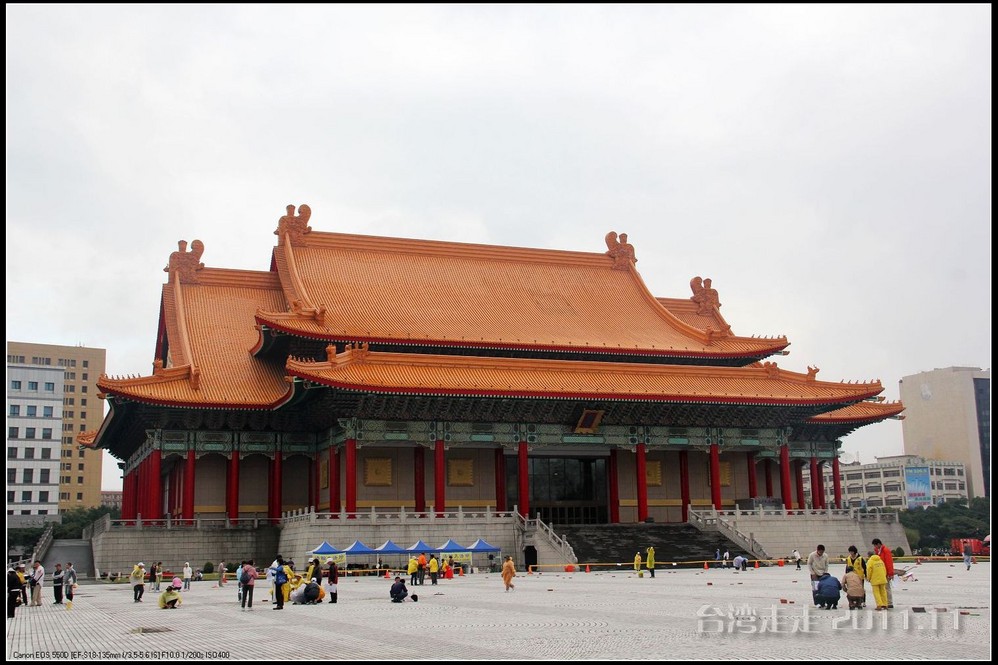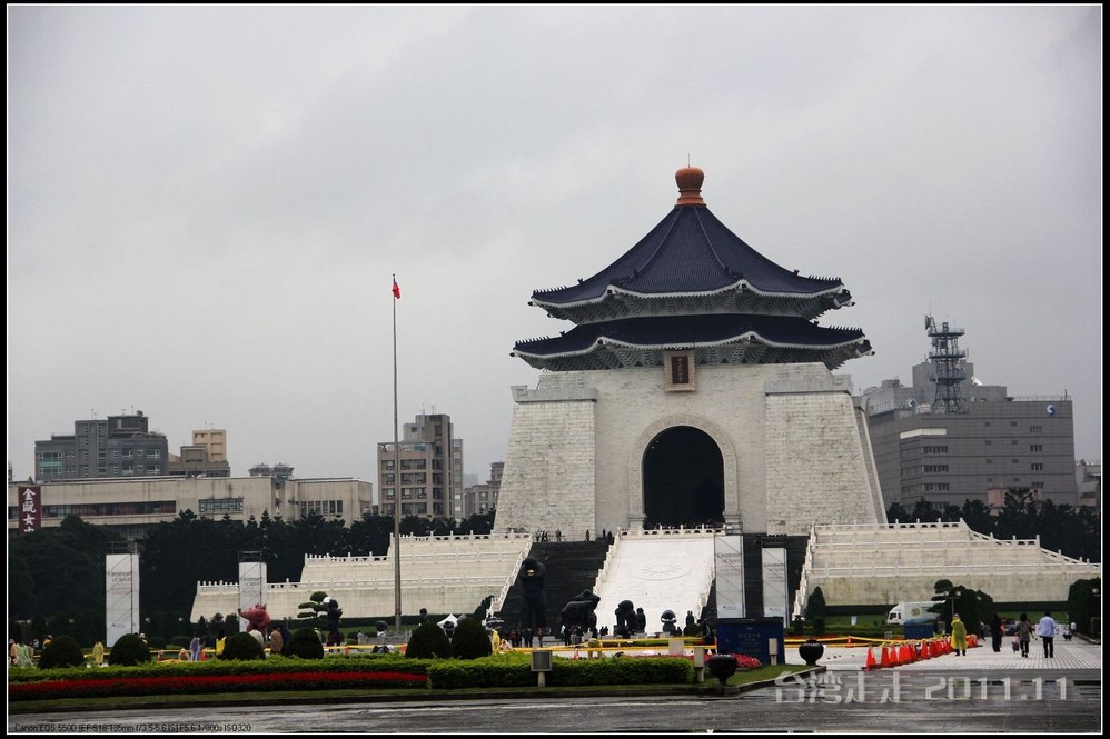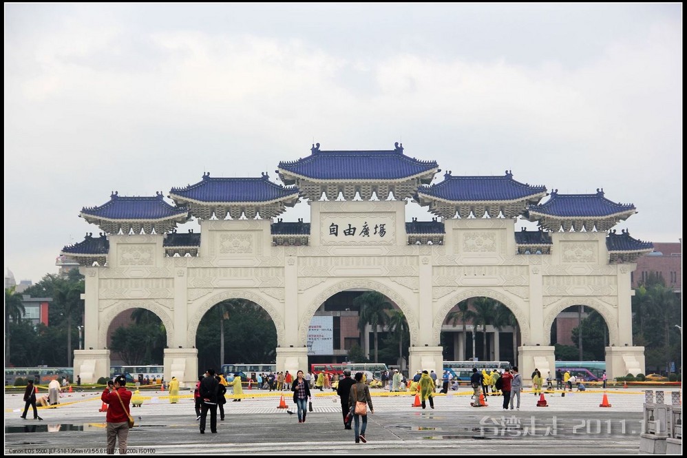 下车后,首先看到的就是台北 市内最大的牌楼,上面写着“自由广场”,据说这里原先写的是“大中至正”。陈水扁上台后,花了8000万新台币把它改了,后来马英九上台了,想再改回去,可还得再花8000万,太贵了,就没动。