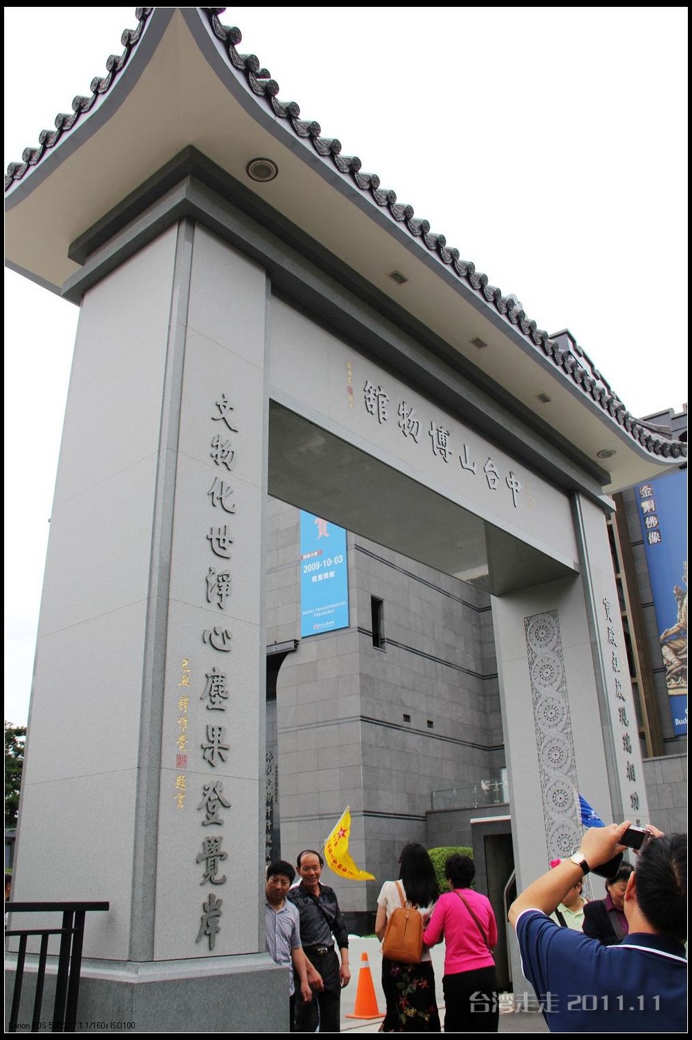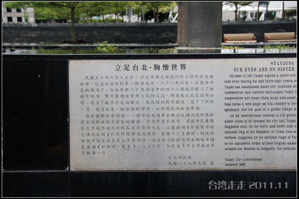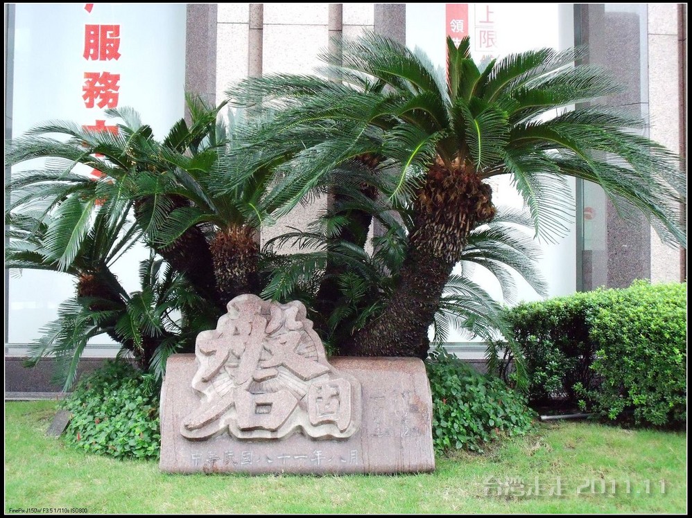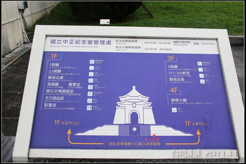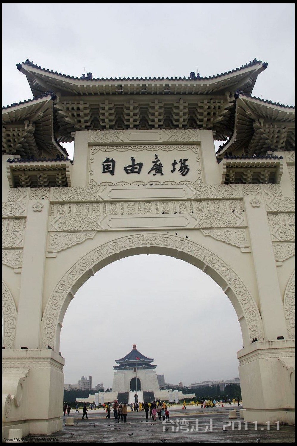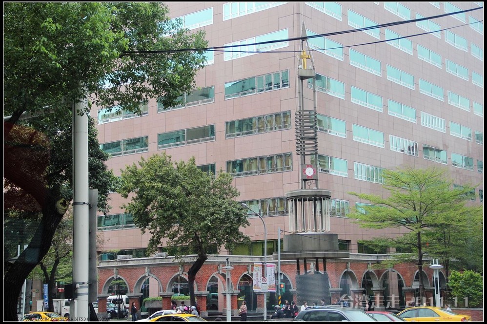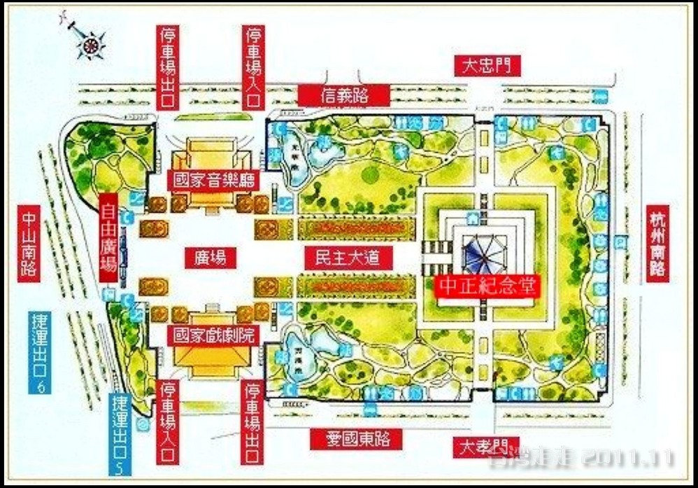 下车后,首先看到的就是台北 市内最大的牌楼,上面写着“自由广场”,据说这里原先写的是“大中至正”。陈水扁上台后,花了8000万新台币把它改了,后来马英九上台了,想再改回去,可还得再花8000万,太贵了,就没动。