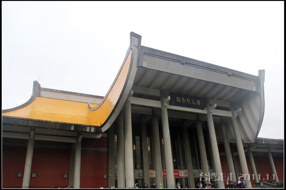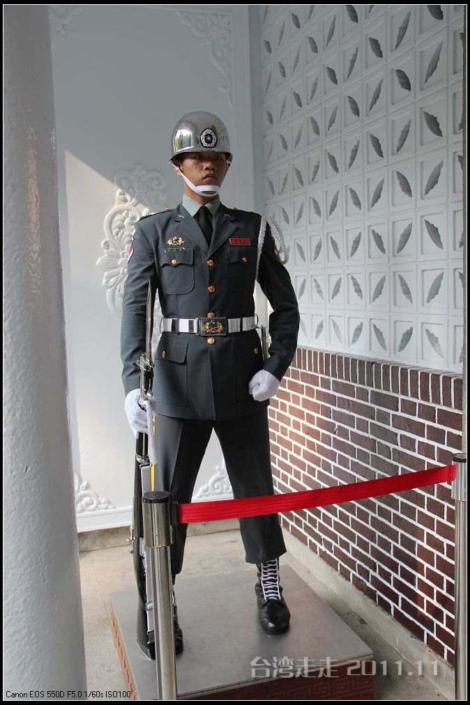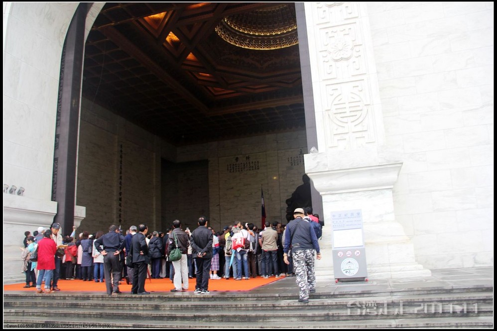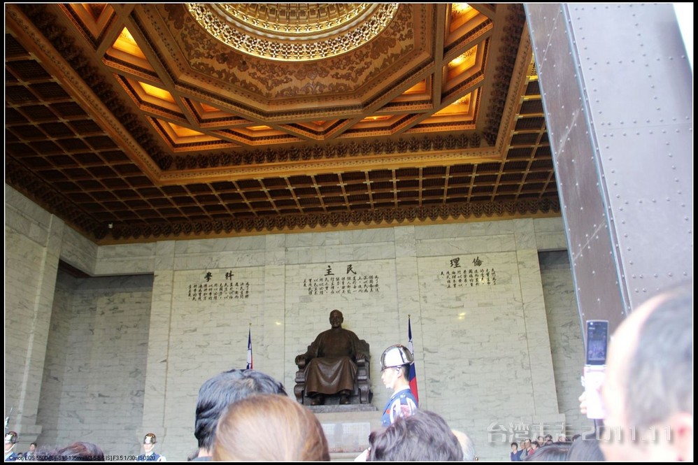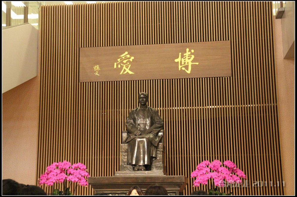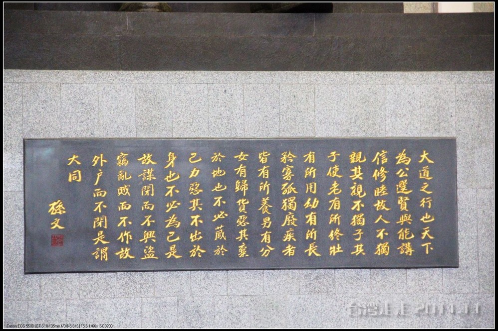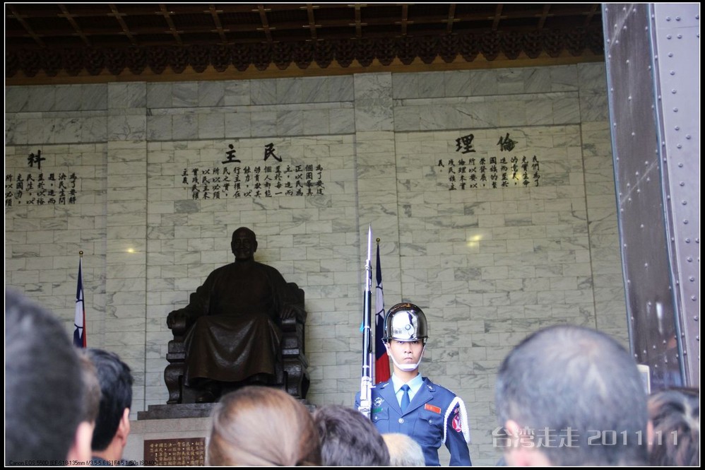 天空仍旧飘着雨,我们来到了国父纪念馆。巍峨雄伟的国父纪念馆高30.4公尺、每边长100公尺、每边由14支灰色大柱顶起黄色屋顶,翘角像大鹏展翼的形状,全部面积 共35000坪,为仿中国宫殿 式建筑。走进纪念馆一楼大厅,迎面就是孙中山 先生铜像,中山 先生端坐沙发之上,左右有持枪卫兵护卫。铜像高 5.8米,重达17吨。台座上镌刻着孙文先生题写的《礼记·礼运》上孔子论述“大同 ”社会的一段话:“大道之行也,天下为公,选贤与能,讲信修睦。故人不独亲其亲,不独子其子,使老有所终,壮有所用,幼有所长,矜(鳏)寡孤独废疾者皆有所养,男有分,女有归。货恶其弃于地也,不必藏于己;力恶其不出于身也,不必为己。是故谋闭而不兴,盗窃乱贼而不作,故外户而不闭,是谓大同 。”整个大厅里庄严、肃穆,禁止喧哗,有很多穿着黑西服、戴着白手套的人在监管。这里每隔一定时间,会举行卫兵的换岗交接仪式。我们正好赶上12点的换岗仪式,我用相机的录像方式录下了整个二十多分钟的过程。