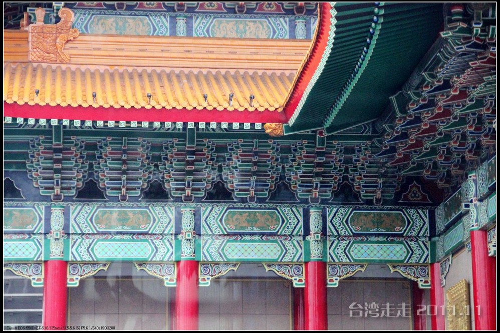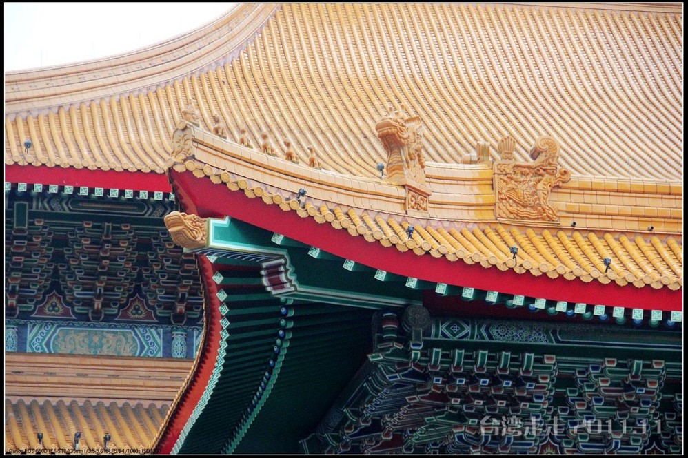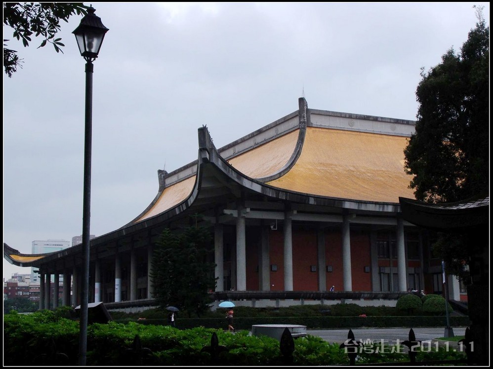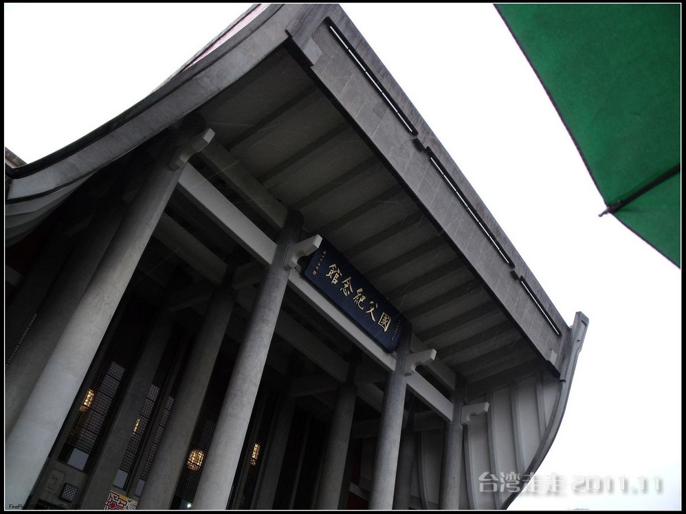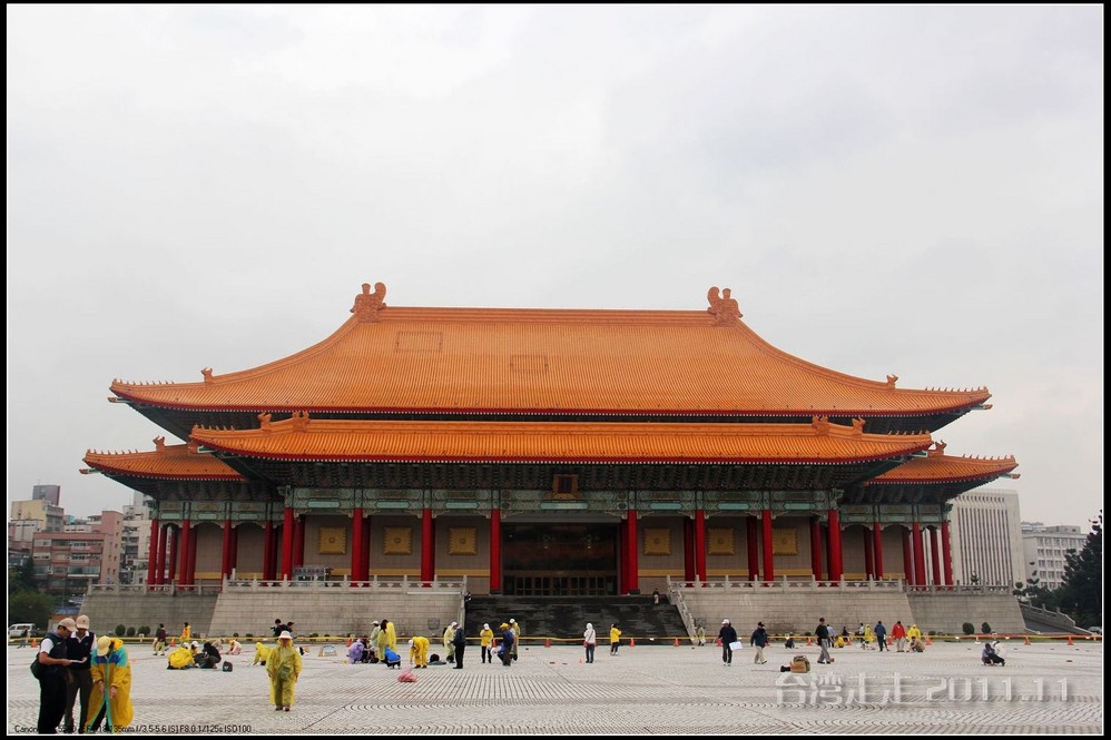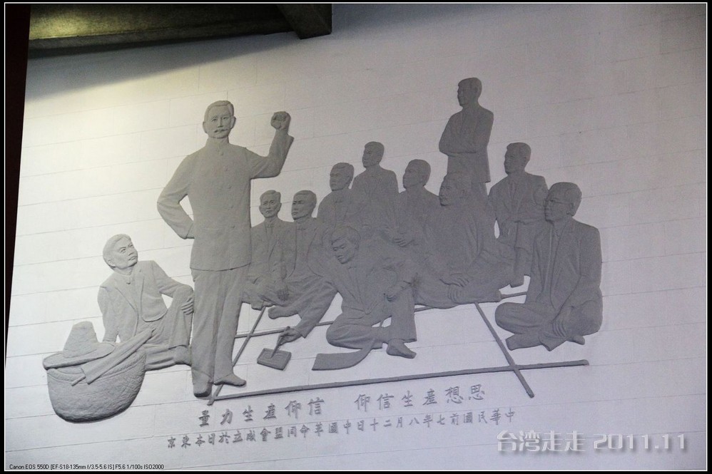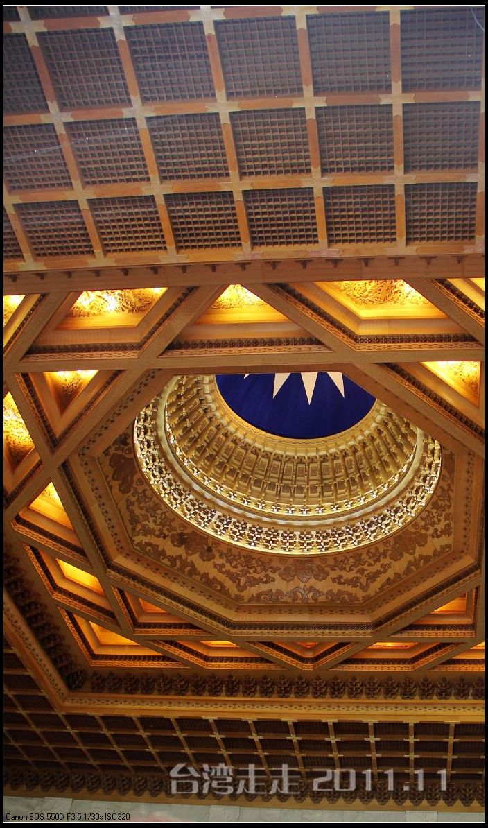 天空仍旧飘着雨,我们来到了国父纪念馆。巍峨雄伟的国父纪念馆高30.4公尺、每边长100公尺、每边由14支灰色大柱顶起黄色屋顶,翘角像大鹏展翼的形状,全部面积 共35000坪,为仿中国宫殿 式建筑。走进纪念馆一楼大厅,迎面就是孙中山 先生铜像,中山 先生端坐沙发之上,左右有持枪卫兵护卫。铜像高 5.8米,重达17吨。台座上镌刻着孙文先生题写的《礼记·礼运》上孔子论述“大同 ”社会的一段话:“大道之行也,天下为公,选贤与能,讲信修睦。故人不独亲其亲,不独子其子,使老有所终,壮有所用,幼有所长,矜(鳏)寡孤独废疾者皆有所养,男有分,女有归。货恶其弃于地也,不必藏于己;力恶其不出于身也,不必为己。是故谋闭而不兴,盗窃乱贼而不作,故外户而不闭,是谓大同 。”整个大厅里庄严、肃穆,禁止喧哗,有很多穿着黑西服、戴着白手套的人在监管。这里每隔一定时间,会举行卫兵的换岗交接仪式。我们正好赶上12点的换岗仪式,我用相机的录像方式录下了整个二十多分钟的过程。