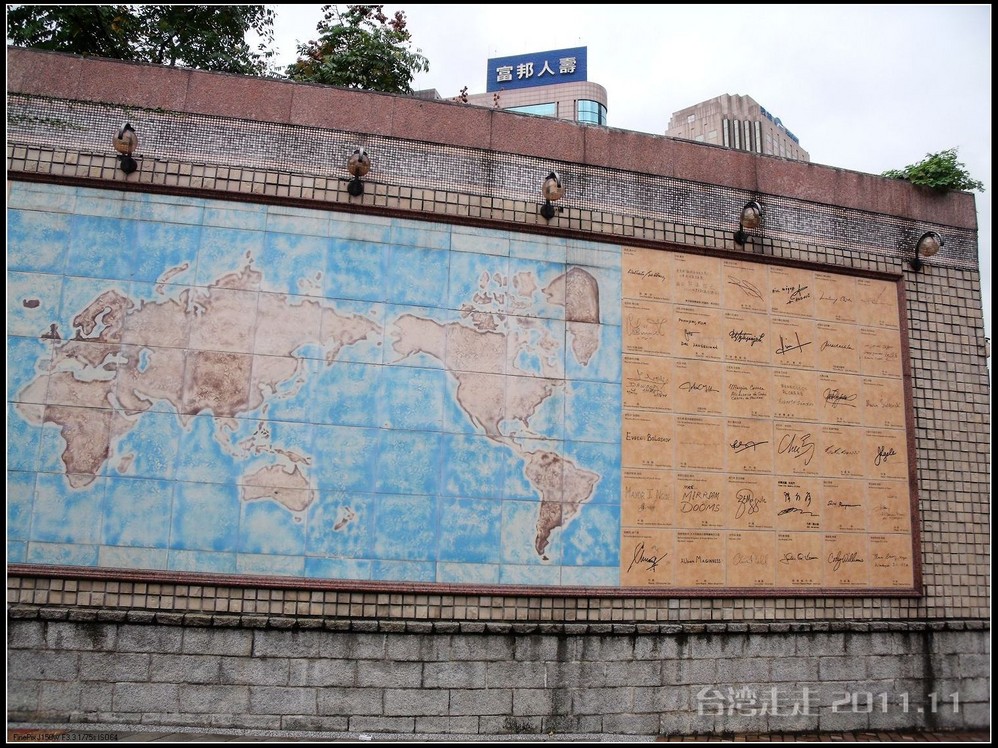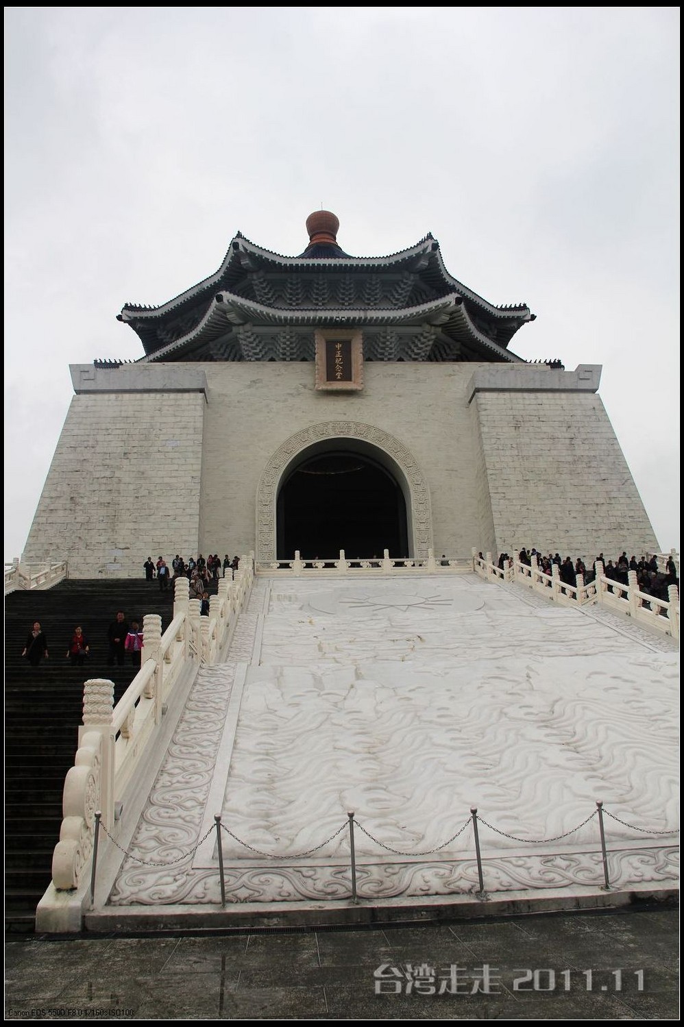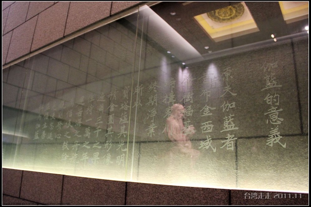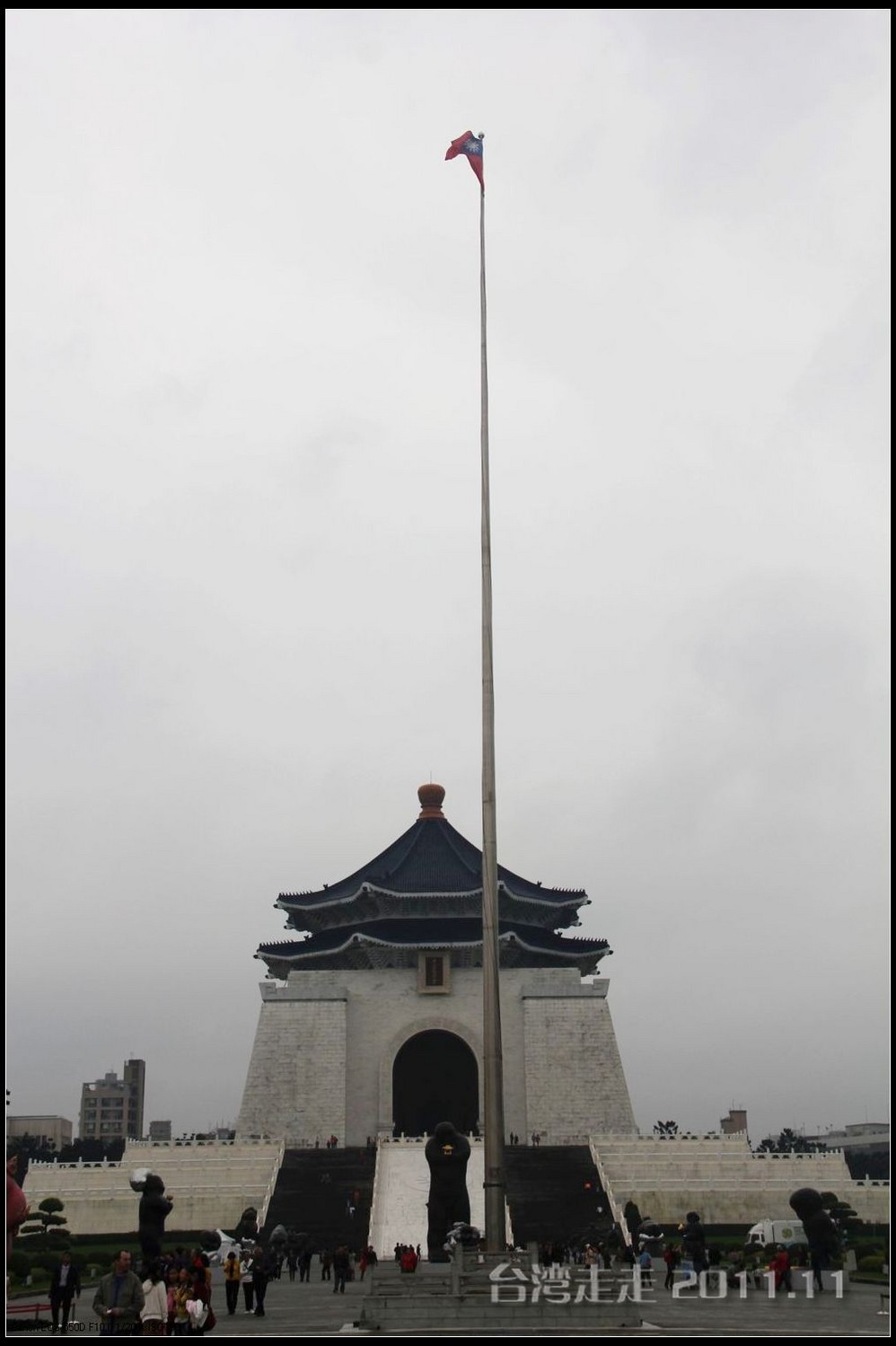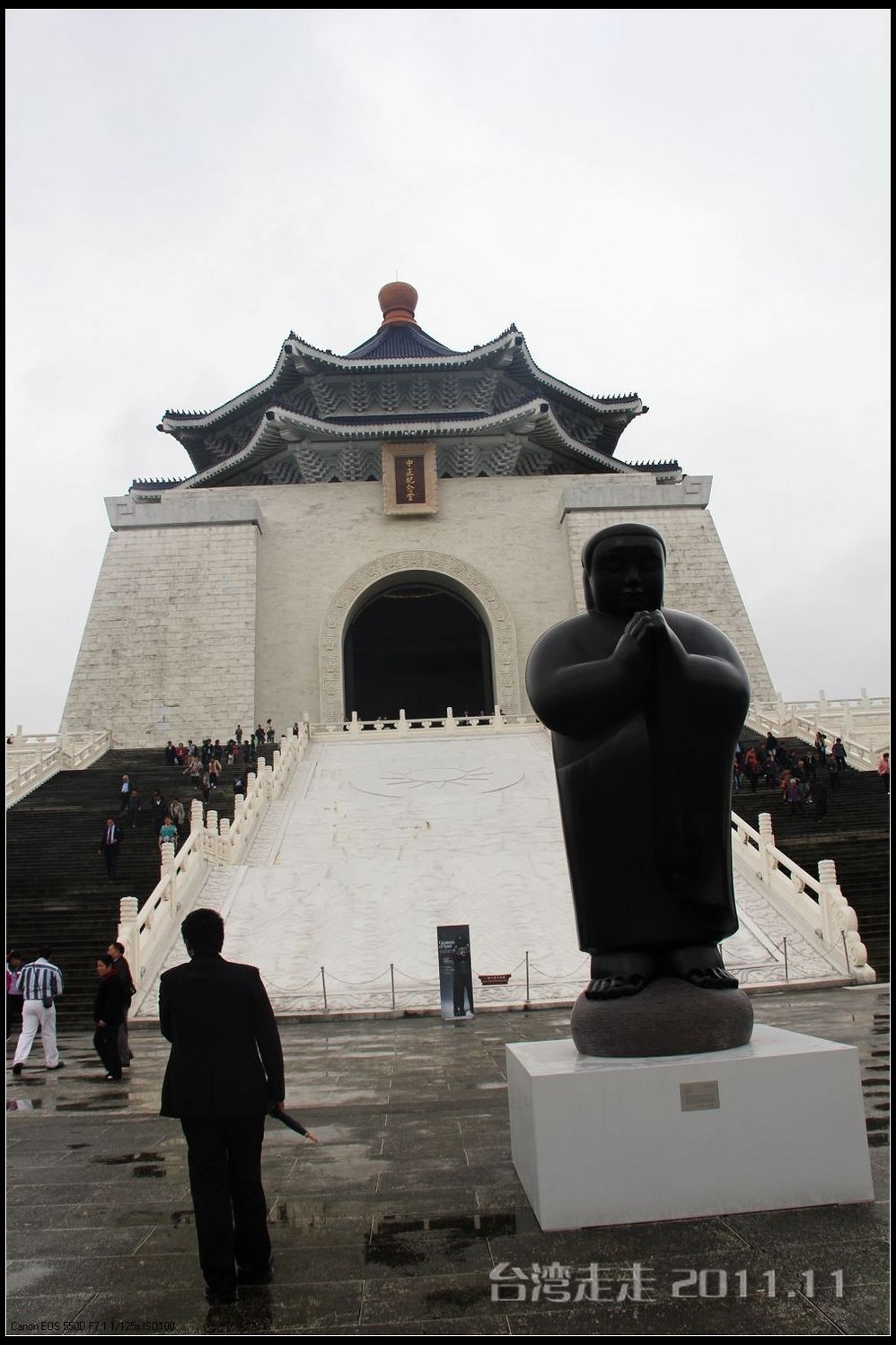 天空仍旧飘着雨,我们来到了国父纪念馆。巍峨雄伟的国父纪念馆高30.4公尺、每边长100公尺、每边由14支灰色大柱顶起黄色屋顶,翘角像大鹏展翼的形状,全部面积 共35000坪,为仿中国宫殿 式建筑。走进纪念馆一楼大厅,迎面就是孙中山 先生铜像,中山 先生端坐沙发之上,左右有持枪卫兵护卫。铜像高 5.8米,重达17吨。台座上镌刻着孙文先生题写的《礼记·礼运》上孔子论述“大同 ”社会的一段话:“大道之行也,天下为公,选贤与能,讲信修睦。故人不独亲其亲,不独子其子,使老有所终,壮有所用,幼有所长,矜(鳏)寡孤独废疾者皆有所养,男有分,女有归。货恶其弃于地也,不必藏于己;力恶其不出于身也,不必为己。是故谋闭而不兴,盗窃乱贼而不作,故外户而不闭,是谓大同 。”整个大厅里庄严、肃穆,禁止喧哗,有很多穿着黑西服、戴着白手套的人在监管。这里每隔一定时间,会举行卫兵的换岗交接仪式。我们正好赶上12点的换岗仪式,我用相机的录像方式录下了整个二十多分钟的过程。