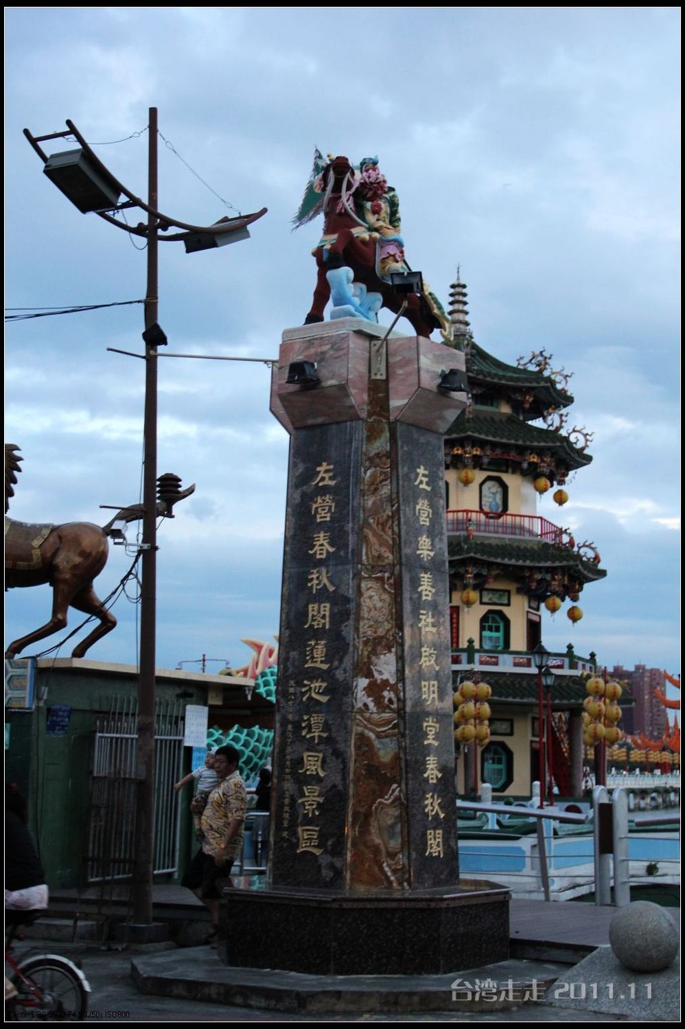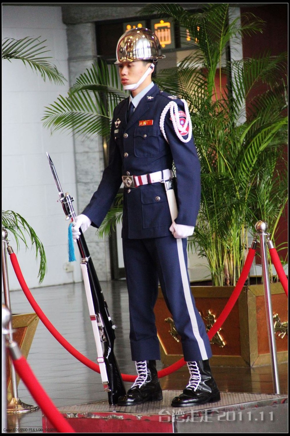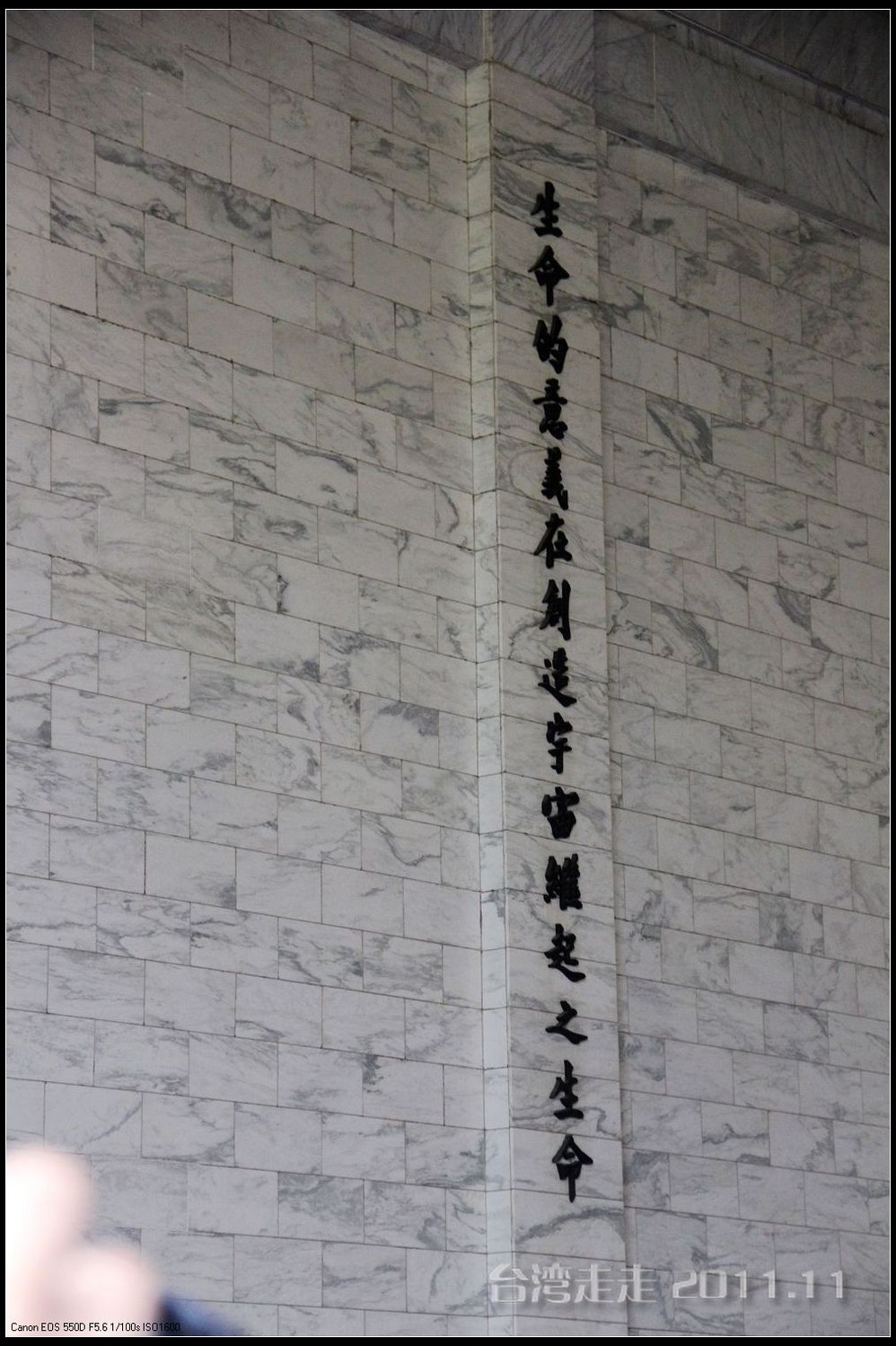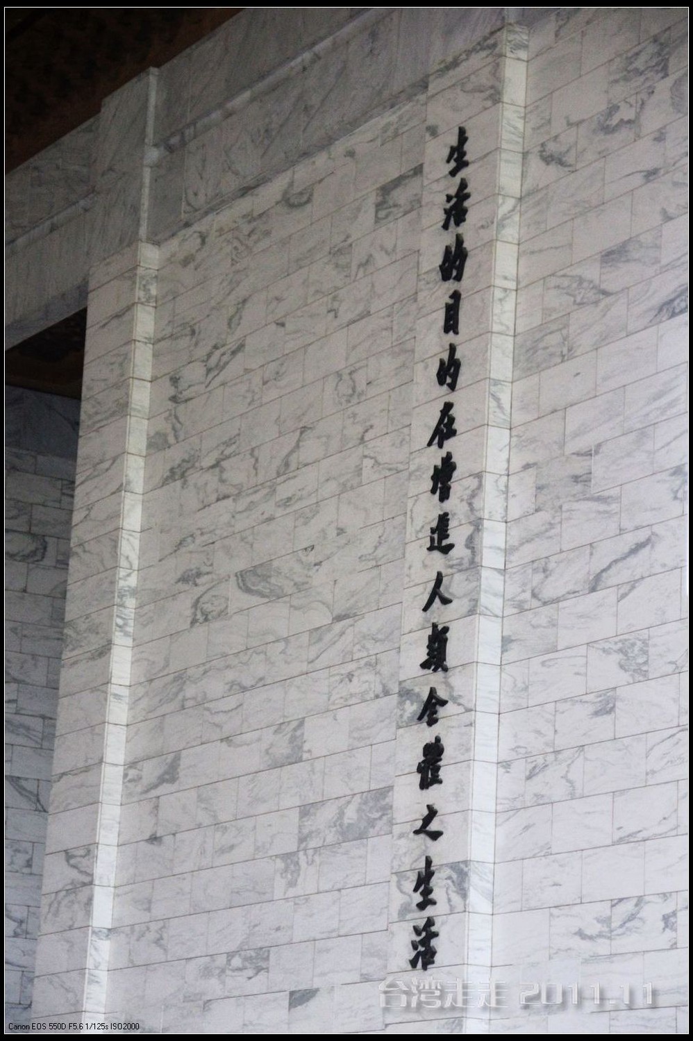 天空仍旧飘着雨,我们来到了国父纪念馆。巍峨雄伟的国父纪念馆高30.4公尺、每边长100公尺、每边由14支灰色大柱顶起黄色屋顶,翘角像大鹏展翼的形状,全部面积 共35000坪,为仿中国宫殿 式建筑。走进纪念馆一楼大厅,迎面就是孙中山 先生铜像,中山 先生端坐沙发之上,左右有持枪卫兵护卫。铜像高 5.8米,重达17吨。台座上镌刻着孙文先生题写的《礼记·礼运》上孔子论述“大同 ”社会的一段话:“大道之行也,天下为公,选贤与能,讲信修睦。故人不独亲其亲,不独子其子,使老有所终,壮有所用,幼有所长,矜(鳏)寡孤独废疾者皆有所养,男有分,女有归。货恶其弃于地也,不必藏于己;力恶其不出于身也,不必为己。是故谋闭而不兴,盗窃乱贼而不作,故外户而不闭,是谓大同 。”整个大厅里庄严、肃穆,禁止喧哗,有很多穿着黑西服、戴着白手套的人在监管。这里每隔一定时间,会举行卫兵的换岗交接仪式。我们正好赶上12点的换岗仪式,我用相机的录像方式录下了整个二十多分钟的过程。