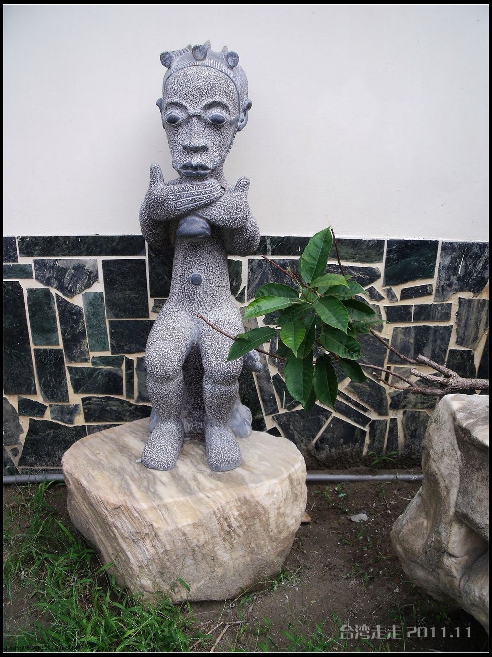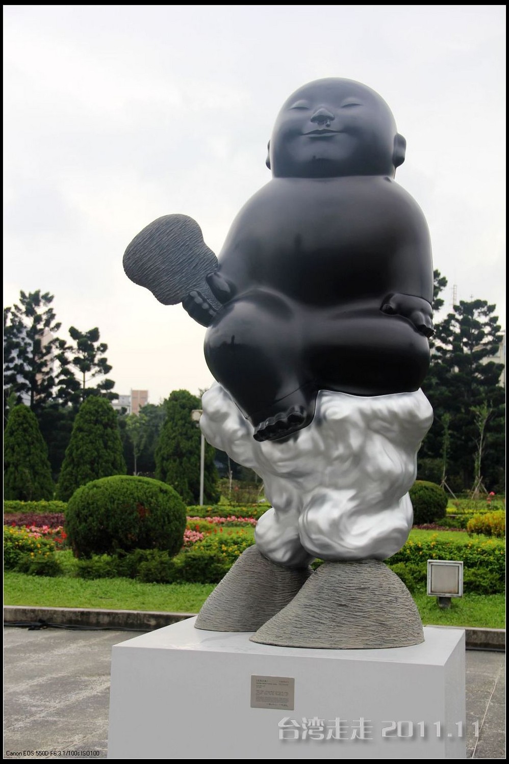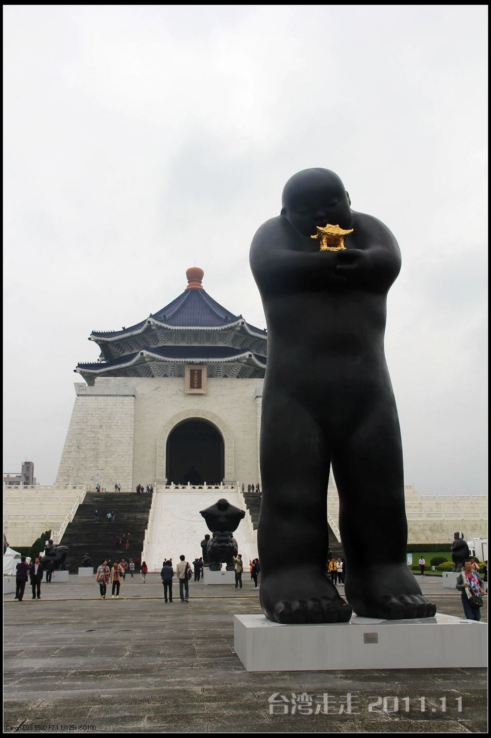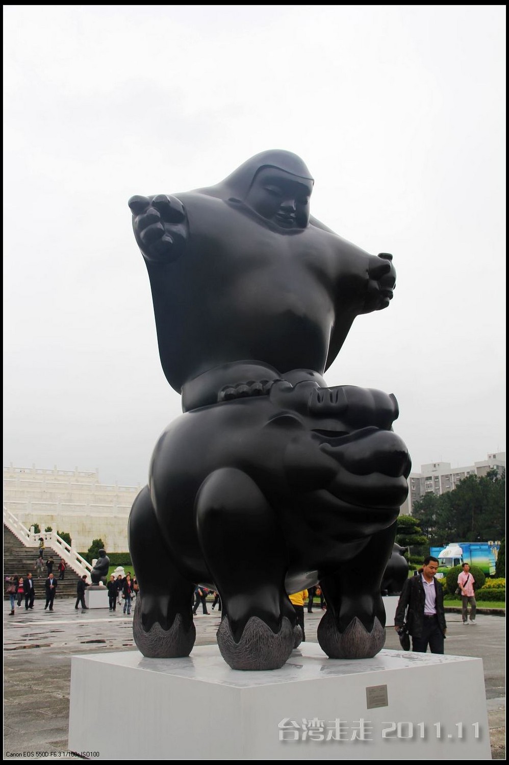 从高台 阶上下来,看到大道中有很多造型各异的黑色小人的雕塑。胖乎乎的,很可爱。有一个最高最大的小黑人,捧个着小金 庙,正好“站在”老蒋的正前方,哈哈。