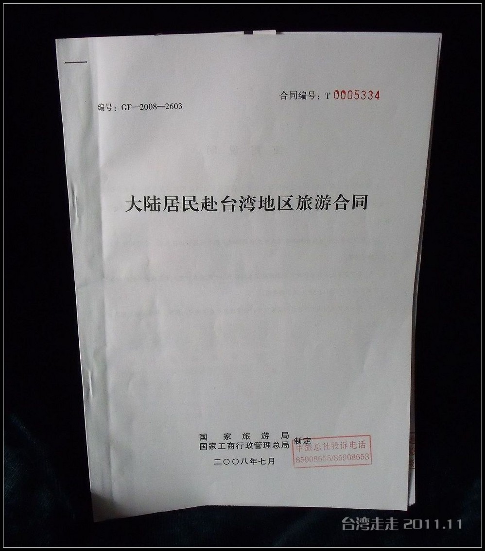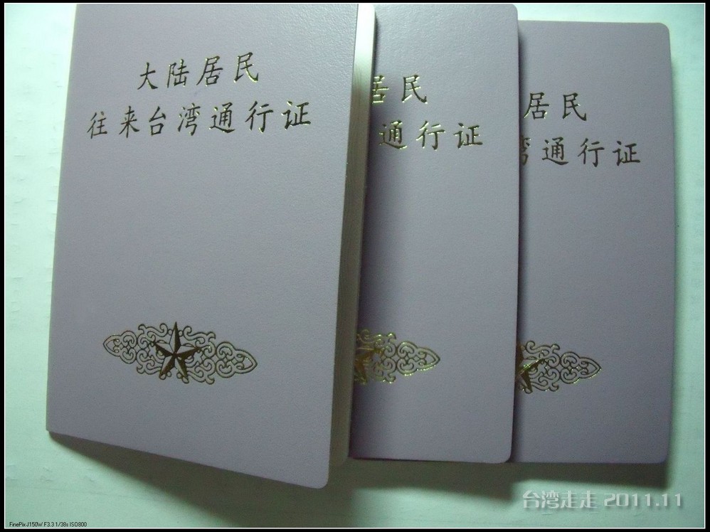 甄选了几家旅行社后,在中国 旅行社总社预订了17号出发的团,每人5180元。要至少提前一个月预订,因为要拿着旅行社的发票才可以去出入境管理局办赴台的通行证。办通行证到很简单,带着发票、身份证和户口本、再来一套复印件、白底的2寸照片就OK了,50元一本,但也需要7天时间。拿到通行证以后,原件要交给旅行社。然后还要留出10天左右的时间给旅行社,要帮大家办理台湾 颁发的“入出境许可证”。在出发前两天的时候,旅行社会组织召开一个说明会,我在上班,听我父母说只去了四、五个人。