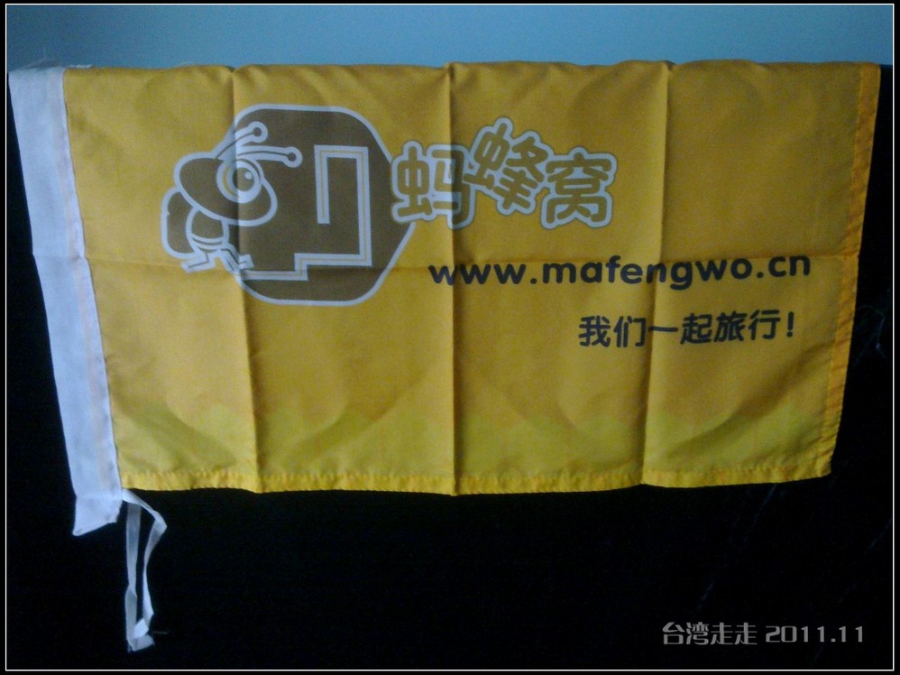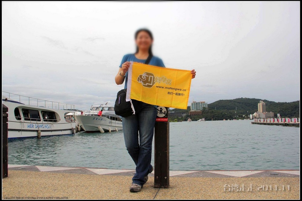 还带着蚂蜂窝的旗子呢,让它在日月潭 留个印吧。