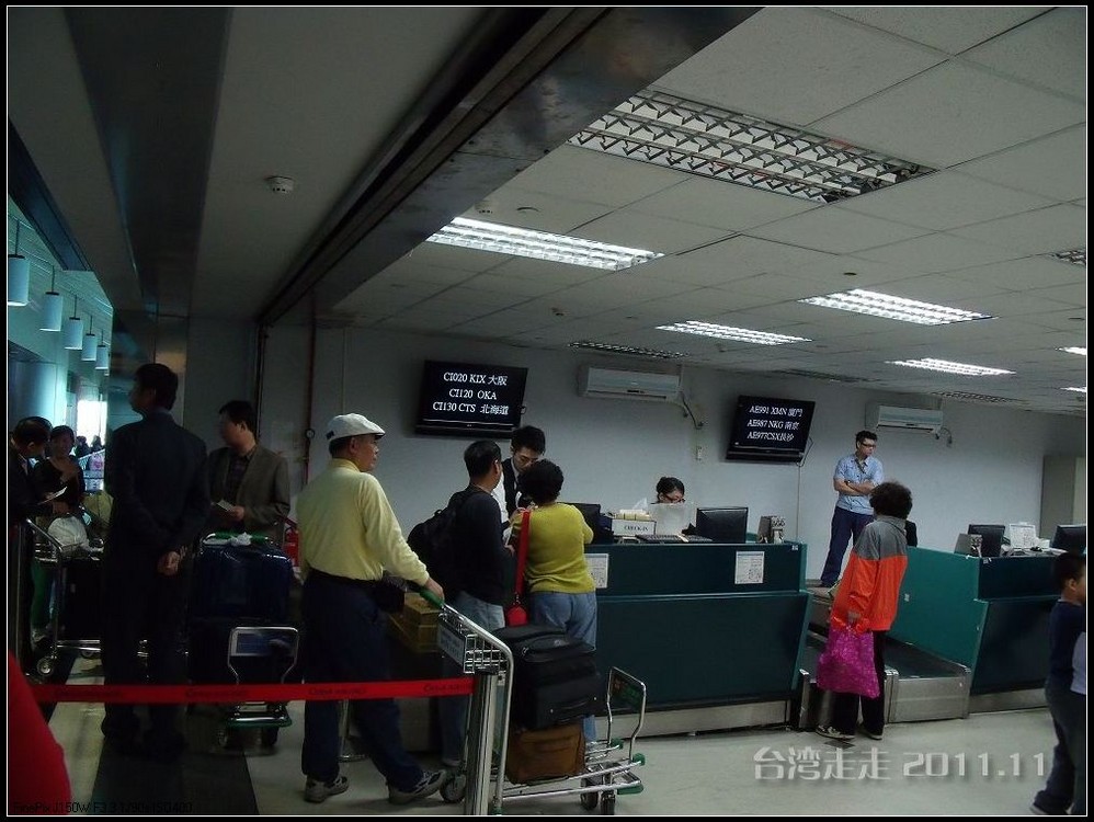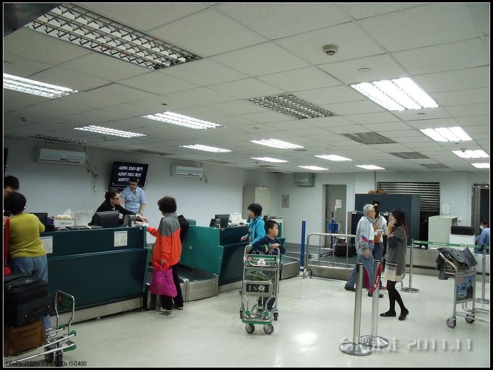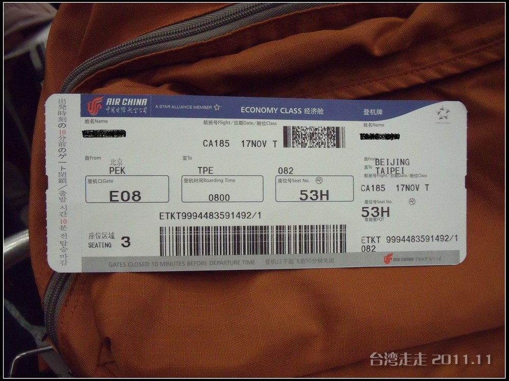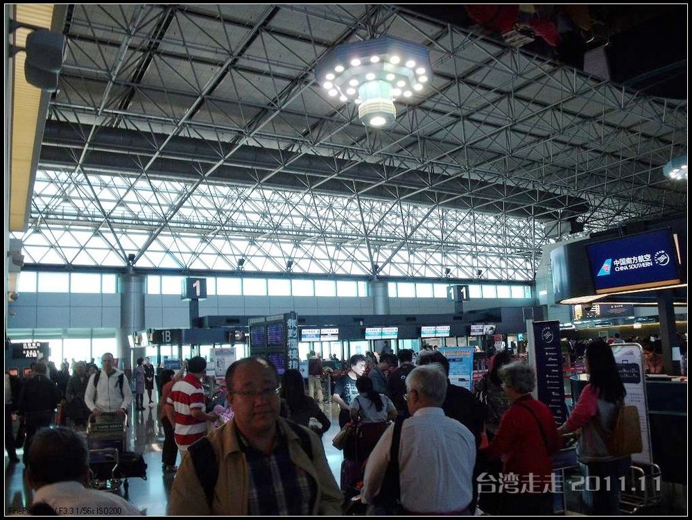 当从大巴车窗看到外面的金属感的大楼,我们就到达了桃园机场 。拿登机牌的事全是阙导去办的,我们就是拿到自己的后去托运行李。真是旅行社全安排好的,固定的行程吧,返程的飞机坐位跟来的时候完全一样,也是53排的E、F、H。