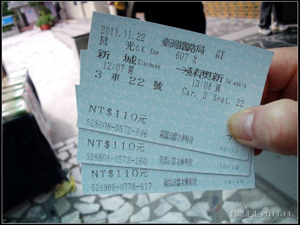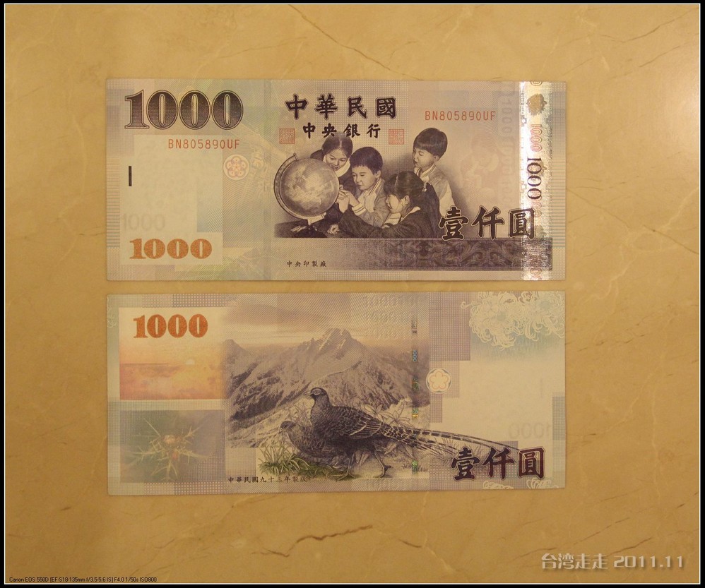 介绍目前台湾 在使用的新台币的样式,纸币目前有:2000元(这个我一直没见到过)、1000元、500元、200元、100元,硬币有:50元、10元、5元、1元。50元以下的就全是硬币了,如果买东西的时候有人找你50元的纸币可千万不能收了。而且人民币和台币的100元都是那种红的,晚上的时候一定要看清楚,别错把人民币当台币付了,遇到不好的店家一下收起来,那你可赔大发了。还要注意的是,7年前发行的1000元纸币上没有银带的也不能收了。两种币换算简单的计算方法就是:台币除以五就是人民币的金额了。最值得一提的是当他拿出一张200元纸币的时候介绍说:那是纪念老蒋冥寿100岁时发行的纪念币,如果遇到了也可以收。他目前手里只有两张。我当时就跟他说希望能换来一张,他同意了。不过我到最后一天早上才有机会换到手。