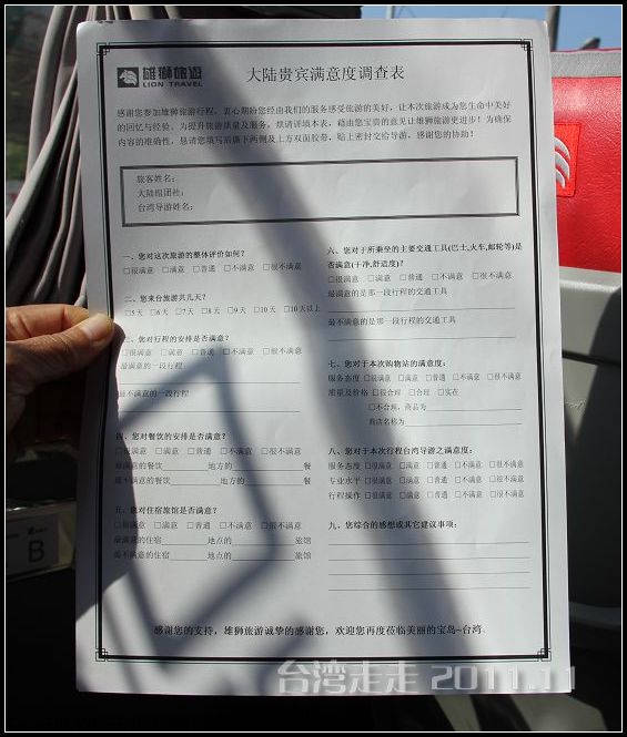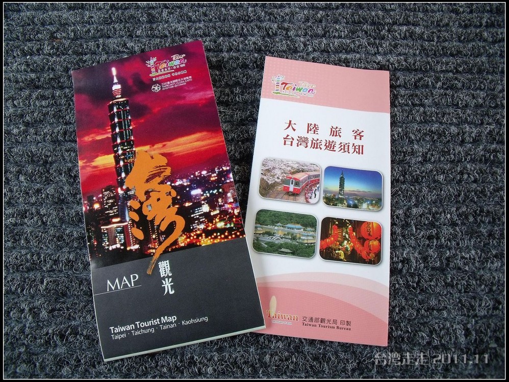 从桃园机场 到台北 市要有50分钟左右的车程,导游就开始给大家介绍各种在台湾 应该了解和注意的事了。首先发给每人一本台湾 地图和旅游须知,让我们记好他的手机号:0988820413,还有大巴车的车牌号:096-SS,这一路只要认准车就OK了。原来他们公司算是台湾 的地陪,叫雄狮旅游公司。