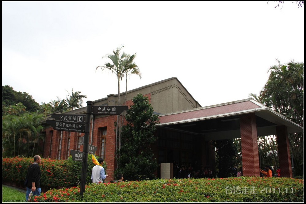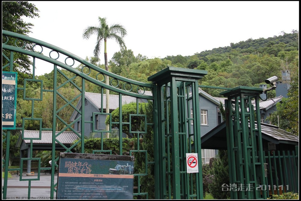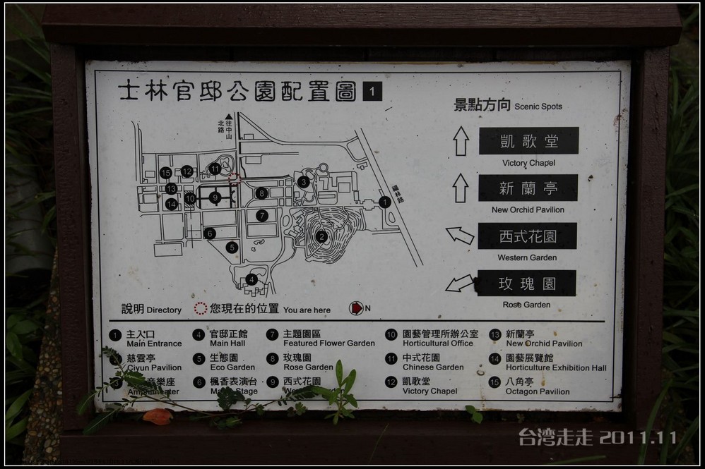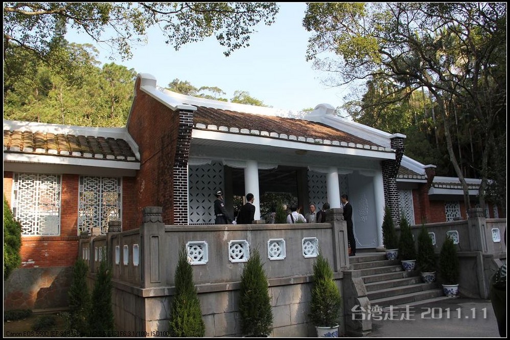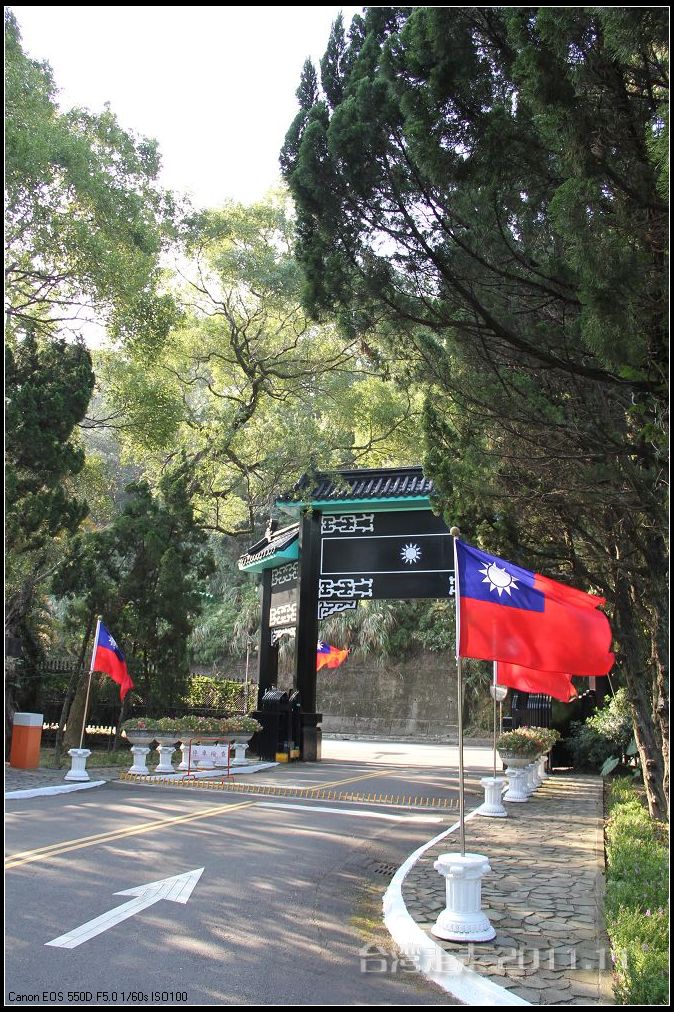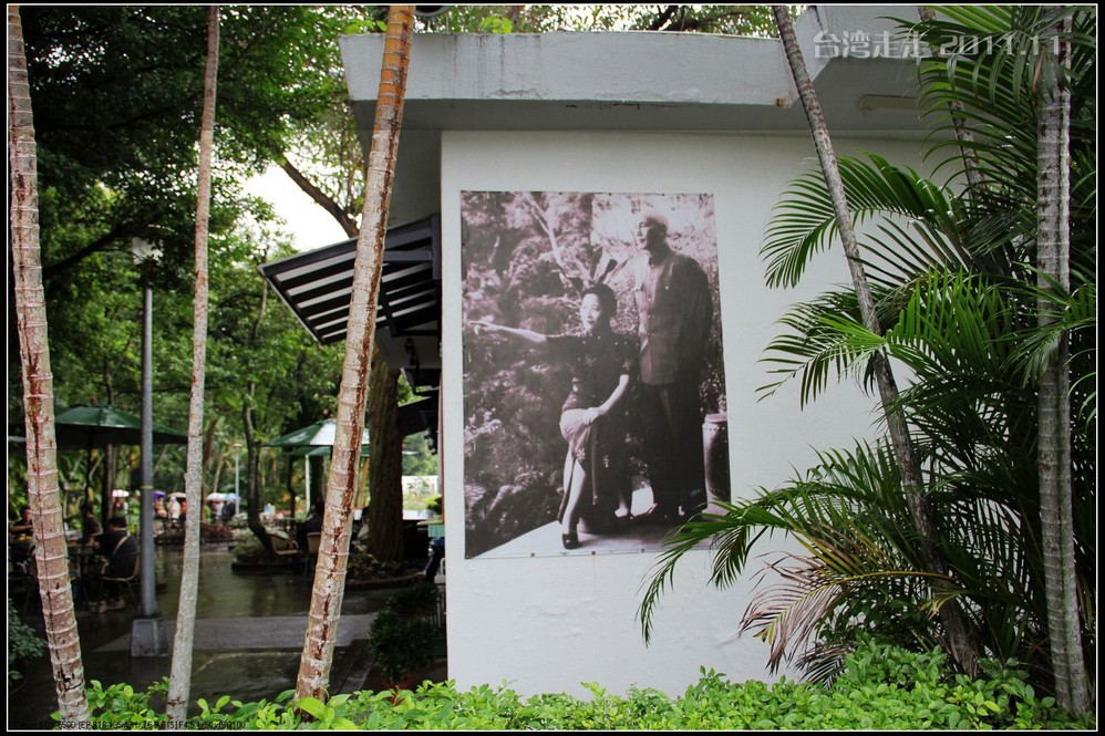 士林官邸 位于台北市士林区福林路,早期蒋氏夫妇住处,目前为台北 市一座生态公园。现只保留私人别墅 一栋,其余皆开放民众参观,包括:士林园艺所、园艺展览馆、欧式花园、中式庭园、兰亭与喷泉,及作礼拜的凯歌堂,外花园有温室盆栽和玫瑰园,内花园为中式庭园和西式式庭园的合称,有假山奇石造景,花木扶疏丝荫遮天,在艳阳高 照下,可让你清凉一下!又可享受席地而坐聆听演奏,一种不拘形式的音乐飨宴。官邸从民国三十八年动工兴建,于三十九年初完工落成。蒋介石来台后,先居于草山(阳明山)行馆,士林官邸 落成后的1950年5月,蒋介石正式迁居士林官邸 ,直至民国六十四年(1975年)病逝,在官邸度过了整整26年的时光。官邸出口处有一座咖啡馆,很多人都坐在咖啡馆门口的露天吧区内休憩闲谈,咖啡馆的招牌是一张很大的黑白照片,照片上身穿婚纱的宋美龄和西装革履的蒋介石含笑相依,这是1927年12月1日蒋介石与宋美龄在上海 大华饭店举行的世纪婚礼上的照片。 那场“世纪婚礼”震惊了当时的旧中国 ,也使整个世界为之侧目,历史学家们把这一婚姻形容为权力与财富的结合,象征着旧中国 从此进入“蒋宋孔陈”四大家族统治的时期。咖啡馆里有各种纪念品卖,刚一接触台币的价格,看着那好几百上千的数字,脑袋还不太转得过来,就是感觉贵,忍了,什么也没买。后来想想咖啡还是应该买上一杯品尝下的。
